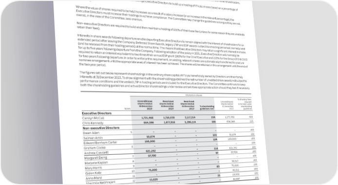 138 ITV plc Annual Report and Accounts 2023 ITV plc Annual Report and Accounts 2023 139 REMUNERATION REPORT CONTINUED G O VE R NAN Compliance with the 2018 Corporate Governance CodePayments to past Directors ‑ Audited C The table below shows how the Committee addressed the principles of clarity, simplicity, risk, predictability, proportionality and There were no payments made to past Directors in 2023. E alignment to culture when determining the Directors’ remuneration policy. The Committee notes the release by the FRC of the revised Corporate Governance Code 2024 and will work to ensure full compliance.Payments for loss of office ‑ Audited There were no payments made to Directors for loss of office in 2023. IMPACT OF THE 2018 CORPORATE GOVERNANCE CODEDirectors’ share interests and post‑cessation shareholding ‑ Audited Clarity The Committee continues to recognise the importance of Directors being shareholders so as to align their interests with other shareholders. Code provision: Remuneration • The presentation of the Remuneration Report is intended to provide clarity on the Company’s approachShareholding guidelines are in place, which encourage Executive Directors to build up a holding of ITV plc shares based on a percentage of arrangements should be transparent and • We aim to be completely transparent about our remuneration policy and arrangements and comply with promote effective engagement with certain disclosure requirements ahead of when we are required to do so for openness and transparencybase salary. shareholders and the workforce.• Great importance placed on engaging with our stakeholders, particularly with shareholders and the workforce on remuneration. The Chief People Officer attends all Committee meetings and our Workforce Engagement Where the value of shares required to be held increases as a result of a salary increase (or an increase in the relevant percentage), the Director, Graham Cooke, provides regular feedback. Employees also have the opportunity to comment Executive Directors must increase their holdings to achieve compliance. The Committee may change the guidelines so long as they are not, through the Ambassador network and employee surveys. This ensures the views of employees are considered overall, in the view of the Committee, less onerous. during Committee deliberations. Non-executive Directors are required to build and then maintain a holding of 100% of their base fee (unless for some reason they are unable to Simplicity retain their fees). Code provision: Remuneration structures The Company operates an approach to remuneration that is simple to understand and familiar to key should avoid complexity and their rationale stakeholders and has three key elements:Interests in share awards following departure enable departing Executive Directors to remain aligned with the interest of shareholders for an and operation should be easy to • Fixed element: comprising base salary, taxable benefits and a pension allowanceextended period after leaving the Company. Deferred Share Awards, legacy LTIP and ESP awards subject to a holding period will normally vest understand.• Short‑term element: an annual performance-related bonus with a selection of financial and non-financial (and be released from their holding periods) at the normal time. This means that Executive Directors may retain a significant interest in shares targets measured over the financial year, two-thirds paid in cash and one-third in shares deferred for a three for up to five years following departure from the Company. Following adoption of the policy in 2021, Executive Directors will normally be year period required to retain an interest equivalent to two times their annual ESP grant (265% for the Chief Executive and 225% for the Group CFO & COO) • Restricted share element: normally released after five years subject to achievement of a performance for two years following departure. In order to enforce this requirement, on vesting, relevant shares are automatically transferred to a secure underpin nominee arrangement until the appropriate level of interest has been achieved. The shares will be retained in this arrangement until the end of Risk the two year period. Code provision: Remuneration A combination of short and long-term incentives with the majority delivered in shares encourages Executive The figures set out below represent shareholdings in the ordinary share capital of ITV plc beneficially owned by Directors and their family arrangements should ensure reputational Directors to deliver long-term sustainable shareholder returns, discouraging decision-making that only focuses interests at 31 December 2023. To show alignment with the shareholding guidelines the net number of unvested share awards not subject to and other risks from excessive rewards, on the short term.performance conditions and the vested LTIP in holding periods are included for the Executive Directors. The Committee continues to keep and behavioural risks that might arise from The Committee retains flexibility to adjust payments through malus and clawback provisions, and an overriding both the shareholding guidelines and actual Director shareholdings under review and will take appropriate action should they feel it necessary. target-based incentive plans, are identified discretion to depart from formulaic outcomes where behaviours may be viewed as inappropriate or criteria on and mitigated.which the award was based do not reflect the underlying performance of the Company. Interests in shares Predictability % of salary/fees Unconditional Restricted Restricted Unconditional required Code provision: The range of possible Shareholders are kept fully informed and consulted on the values that can be earned under the incentive plans shares held atshares held at shares held at shares held at to be held under 31 December 31 December 31 December % shareholding 31 December shareholding values of awards to individual d
