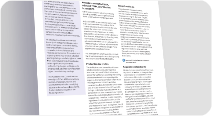 42 ITV plc Annual Report and Accounts 2023 ITV plc Annual Report and Accounts 2023 43 S T ALTERNATIVE PERFORMANCE MEASURES R A T E G I The Annual Report and Accounts includes both statutory and adjusted Restructuring and Amortisation and impairment Net financing costs C R E reorganisation costs Amortisation and any initial impairment of Net financing costs are adjusted to reflect P measures (Alternative Performance Measures or APMs), the laer of which, O Where there has been a material change in assets acquired through business the underlying cash cost of interest for the R in management’s view, reflect the underlying performance of the business the organisational structure of a business combinations and investments are not business, providing a more meaningful T area or a material initiative, these costs are included within adjusted earnings. As these comparison of how the business is managed and provide a more meaningful comparison of how the business is highlighted and are excluded from our costs are acquisition-related, and in line with and funded on a day-to-day basis. The managed and measured on a day-to-day basis. adjusted measures. These costs arise from our treatment of other acquisition-related adjustments made remove the impact of significant initiatives to reduce the ongoing costs, we consider them to be capital in mark-to-market gains or losses on swaps cost base and improve efficiency in the nature as they do not reflect the underlying and foreign exchange, one-off fees and business to enable the delivery of our trading performance of the Group. premiums relating to the buyback of bonds, Key adjustments for EBITA, Exceptional items strategic priorities. We consider each Amortisation of software licences and exceptional interest and other finance costs Our APMs and KPIs are aligned with adjusted EBITA, profit before project individually to determine whether development is included within our adjusted on acquisitions, imputed pension interest our strategy and business divisions These items are excluded to reflect its size and nature warrant separate profit before tax as management consider and other financial gains and losses that and together are used to measure the tax and EPS performance in a consistent manner and in treatment and disclosure. these assets to be core to supporting the do not reflect the relevant interest cash performance of our business and form EBITA is calculated by adjusting statutory line with how the business is managed and operations of the business. cost to the business and are not yet the basis of the performance measures operating profit for operating exceptional measured on a day‑to‑day basis. They are realised balances. for remuneration. Adjusted results items and amortisation and impairment. typically material amounts related to costs, exclude certain items because, gains or losses arising from events that are if included, they could distort the Adjusted EBITA is calculated by adding back not considered part of the core operations of Reconciliation between statutory and adjusted results understanding of our performance high‑end production tax credits to EBITA. the business, though they may cross several for the period and the comparability Further adjustments, which include the gain/ accounting periods. These include, but are 2023 2023 2023 2022 2022 2022 1. £85 million (2022: £49 million) adjustment relates to between periods. APMs are not defined loss on the sale of non‑current assets, not limited to, costs directly related to Twelve months to Statutory Adjustments Adjusted Statutory Adjustments Adjusted production tax credits which we consider to be a acquisition activity, costs related to major 31 December £m £m £m £m £m £m contribution to production costs and working capital in terms under IFRS and may not be amortisation and impairment of assets EBITA1 404 85 489 668 49 717 nature rather than a corporate tax item. EBITA is not a comparable with similarly titled acquired through business combinations and reorganisation and restructuring statutory measure measures reported by other companies. investments, and certain net financing costs, programmes, material onerous contracts, Exceptional items 2. Exceptional items of £77 million (2022: £65 million) significant impairments, employee‑related 2 largely relate to acquisition-related expenses, are made to remove their effect from (operating) (77) 77 – (65) 65 – tax provisions related to earlier financial restructuring, transformation and property move As adjusted results exclude certain adjusted profit before tax and adjusted EPS. Amortisation and costs. Refer to the Finance Review items (such as significant legal, major The tax effects of all these adjustments are periods (IR35) and other items such as legal impairment3 (89) 25 (64) (84) 57 (27) 3. £25 million (2022: £57 million) adjustment relates to restructuring and transaction items), reflected in the adjusted tax charge. These settlements and non‑routine legal costs (e.g. amortisation and impairment of assets acquired legal costs related to items which are Operating profit 238 187 425 519 171 690 through business combinations and investments. We they should not be regarded as a adjustments are detailed below. Net financing costs4 (45) 16 (29) (26) – (26) include only amortisation on purchased intangibles, complete picture of the Group’s themselves considered to be exceptional such as software within adjusted profit before tax financial performance. The exclusion of Adjusted EBITDA, which is used to calculate items). We also adjust for the tax effect of Share of profits on 4. £16 million (2022: £nil) adjustment is for non-cash these items. JVs and associates – – – 8 – 8 interest cost. This provides a more meaningful adjusting items may result in adjusted the Group’s leverage, is calculated by adding comparison of how the business is managed and earnings being materially higher or lower back depr
