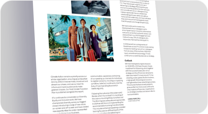 12 ITV plc Annual Report and Accounts 2023 ITV plc Annual Report and Accounts 2023 13 S CHIEF EXECUTIVE’S STATEMENT CONTINUED T R A T E G I This capability underpins our ability Cost and efficiency programmeOur Social Purpose SHETLAND is a crime drama In May 2023, we submitted our application C R produced by Silverprint to now compete for online video budgets, to Ofcom for the renewal of our Channel 3 E Our existing cost saving programme of £150 We reach millions of viewers globally, Pictures (an ITV Studios P particularly budgets allocated to platforms licenses, which expire on 31 December 2024. O million between 2019 and 2026, has delivered through our content, and in the UK, label) for the BBC. R such as YouTube, and take share in this £130 million of annualised savings to date through our linear channels and ITVX. We are fully engaged in the process, which T growing addressable advertising market. THREE LITTLE BIRDS we expect to conclude in the first half of 2024. and we are on track to deliver the full £150 We are proud of our position as a Public is a drama written by million by 2025 – one year early. Service Broadcaster (PSB) in the UK, telling Sir Lenny Henry and inspired The progress we have made in Streaming and the stories that are at the heart of culture by his mother’s journey to Colleagues against our KPIs means that we are confident Britain in the late 1950s. of delivering at least £750 million of digital We are now in the early stages of a new and society. We have the opportunity to It aired on ITV1 and ITVX Our colleagues are central to everything that strategic restructuring and efficiency advocate for positive change from social in October 2023. we do and are fundamental to the success of revenues by 2026, with the focus continuing programme across the Group to reshape the issues to environmental matters and beyond, ITV. They have played a significant role in to be ad-funded.cost base, enhance profitability, and support providing the UK public with unbiased delivering our strategy effectively this year We have started 2024 really well and will the growth drivers of Studios and Streaming. information and diverse perspectives. and I am incredibly grateful for the hard work further enhance ITVX in 2024 building on We are building on the foundations we have and commitment all our colleagues show. the momentum we have. We will increase established in digital and data and the Our Social Purpose strategy has four focus I always appreciate how our people love the depth and breadth of content, deliver significant progress we have made in areas: Better Health; Diversity, Equity and collaborating with each other and with so continuous improvements in the product transforming ITV from a linear broadcaster to Inclusion; Climate Action and Giving Back. many partners externally, and how motivated and user experience, and expand its a multi-platform broadcaster and streamer. they are to be part of making great shows distribution and marketing.2023 saw us reach the major milestone for that lift people and change people’s lives. Savings will come mainly from technology Better Health in surpassing our five-year goal Within Broadcast, we have now digitally and operational efficiencies, organisational which was to encourage audiences to take We have continued to invest in the transformed the business and will continue redesign across Group, M&E and ITV Studios over 200 million actions to support their development of our colleagues and in to do so as we become increasingly agile and and permanent reductions in discretionary mental or physical wellbeing. We hit an ensuring we have an inclusive culture where adapt to changing viewer habits. Internally spend across the Group. extraordinary 249 million actions by the everyone can be their authentic selves. I am this means we are always looking at ways to end of 2023 with our flagship mental health pleased that in our 2023 Engagement and increase our efficiency and productivity, By the end of 2024 we expect the programme campaign, Britain Get Talking, playing a Culture Survey, 75% of colleagues who whether that is through the operational use to have delivered incremental annualised significant role in achieving our target. responded, feel like they belong at ITV. of AI or ensuring our cost base is the right savings of at least £50 million gross per year, shape and size. Externally for viewers, it is giving a £30 million in year gross benefit in Our Giving Back activity in 2023 continued with In 2024 we will be running a series of ensuring we continue to engage our 2024. There will be c.£50 million of one-off our biggest fundraising event, Soccer Aid for Roadshows across ITV and I am really looking audiences through live content such as costs to deliver these savings. The ongoing UNICEF. Since its launch in 2006, over £90 forward to meeting many of our colleagues sports and successful entertainment shows programme is designed to deliver further million has been raised. As we move forward, from all areas of the business. With their to continue to deliver mass audiences which incremental material savings over a our Giving Back work will shift towards input, commitment and energy, ITV will are so valuable to advertisers, together with number of years which will further build supporting the next generation called continue to successfully execute our strategy. the personalisation and targeting that comes ITV’s resilience. We will provide further Better Futures. with ITVX. information as the programme progresses. Outlook We have made great progress towards ITV continues to be the best destination for our 2026 KPIs. 2023 was the year of peak advertisers to reach valuable mass investment for Streaming, which together audiences in the UK. Our share of those mass THE BAY returned for its fourth series on ITV in 2023. with the successful execution of our linear TV audiences continued with over 90% It is produced by Tall Story Pictures (an 
