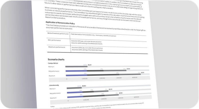 124 ITV plc Annual Report and Accounts 2023 ITV plc Annual Report and Accounts 2023 125 REMUNERATION REPORT CONTINUED G O VE R NAN Performance measures and target setting C RESTRICTED SHARES The annual bonus is assessed against financial, strategic and individual targets determined by the Committee. This enables the Committee to E Purpose and link to strategyIncentivises Executive Directors to deliver the business strategy and aligns with longer-term Company performance and the reward annual financial performance delivered for shareholders, and performance against specific financial, operational or strategic shareholder experience. objectives set for each director, which are closely linked to the strategic priorities of the business. The Committee sets targets taking into account external forecasts, internal budgets and business priorities. Acts as a retention tool to retain the executives required to deliver the business strategy. OperationAwards may be structured as conditional rights or nil-cost options (or economic equivalent). Awards will normally be A key feature of Restricted Share awards is that the successful execution of the strategy and the success of the business is ultimately reflected granted annually with vesting after three years, subject to satisfaction of a performance underpin. Awards will normally be in the share price, therefore providing strong alignment with the interests of our shareholders. The vesting of Restricted Share awards is required to be held for an additional two year holding period so that the award is released after five years. During the holding subject to a performance underpin. For 2024 awards, the Committee will retain the ability to reduce vesting on the Restricted Shares (including period awards may be reduced or cancelled in certain circumstances. Further detail is provided in the Annual Report to nil) where adjusted Return on Capital Employed is below the Company’s cost of capital. In addition, the Committee has retained a broader on Remuneration. discretion to also enable reduction in vesting levels where there is a material weakness in the underlying financial health and sustainability of Dividends (or equivalents) may be earned in respect of any vested shares. the business. These underpins have been selected as they are considered to provide a robust and sustainable safeguard against payments for Maximum potential The maximum award level is 175% of salary. failure. Further detail on performance criteria is set out in the Annual Report on Remuneration. paymentOur current operational policy is to make annual awards of 132.5% of salary to the Chief Executive and 112.5% to the When considering performance outcomes, the Committee will look beyond formulaic results to ensure the outcomes align with the overall Group CFO & COO. business or individual performance. The Committee may adjust the targets for awards or the calculation of performance measures and vesting Performance metricsThe Committee may define the terms of the performance underpin. The criteria may be based on financial and/or non- outcomes for events not foreseen at the time the targets were set to ensure they remain a fair reflection of performance over the relevant financial metrics and include reference to corporate, divisional or individual performance. When determining vesting the period. Discretion will be exercised mindful of broader performance, and any change to the outcome will be disclosed in the next Annual Remuneration Committee will take into account all factors deemed relevant at the time (e.g. progress against execution of Report on Remuneration. the strategy, the nature of the wider trading environment). As the underpin is qualitative, there are no performance condition weightings applicable, nor is there a threshold-max vesing range. Application of Remuneration Policy Information on the individual award grants is set out in the Annual Report on Remuneration. The chart below provides an indication of the level of remuneration that would be received by each Executive Director under the following three assumed performance scenarios: SHAREHOLDING GUIDELINES Below threshold performance Fixed elements of remuneration only – base salary, benefits and pension Purpose and link to strategyTo create alignment between Executive Directors and shareholders both during service and after departure. Mid-performance Assumes 50% pay-out under the annual bonus OperationShareholding guidelines are in place which encourage Executive Directors to build up a holding in Company shares during the Assumes 100% vesting of the Restricted Shares course of tenure. The shareholding guideline for the Chief Executive is 400% of base salary and for the Group CFO & COO 225%. Maximum performance Assumes 100% pay-out under the annual bonus Assumes 100% vesting of the Restricted Shares Executive Directors will normally also be expected to retain an interest in Company shares for two years following departure. The expected holding requirement following departure will be equal to two times the Executive Director’s Restricted Shares grant level. Further details of current shareholdings of the Executive Directors, together with further detail on the operation of the Scenario charts shareholding guidelines are set out in the Annual Report on Remuneration. Carolyn McCall 100% £1.2m Minimum 0 10 20 30 40 50 60 70 Detailed provisions 33% 27% 40% £3.5m Mid performance 0 10 20 30 40 5070 60 The Committee may make any remuneration payments and payments for loss of office (including exercising any discretion available to it in 26% 43% 31% £4.4m connection with such payments) notwithstanding that they are not in line with the Policy set out above, where the terms of the payment were Maximum agreed either: (i) during the term of, and was consistent with any previous policy; or (ii) at a time when the relevant individual was not a director 0 1,000,000 2,000,000 3,000,000 4,000,000 of the Company and the payme