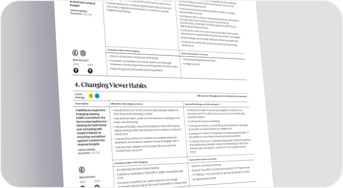 58 ITV plc Annual Report and Accounts 2023 ITV plc Annual Report and Accounts 2023 59 S RISKS AND UNCERTAINTIES CONTINUED T R A T E G I 3. Commercial 5. Content Pipeline C R E P O Link to MB Sponsor: Managing Director, Commercial Link to MB Sponsor: Managing Director, Media & Entertainment R strategy S O strategy S O T Description What this risk category covers: Some of the things we do to manage it: Description What this risk category covers: Some of the things we do to manage it: Increasing competition • How we compete for share of advertising spend in a • Continue to enhance our integrated advertising proposition Lack of diversified • How we anticipate and adapt to changes in the tastes and • Our data and insights team focuses on understanding the and challenging challenging macroeconomic environment and with the large to offer i) mass simultaneous reach, ii) data driven target commissioning habits of viewers preferences of our most commercially valuable viewers to advertising market streamers launching advertising tiers addressable and iii) the ability to integrate brands creatively pipeline (whilst • How we develop a quality and appealing content pipeline that help drive the way we commission content conditions impact • The impact redistribution of advertising budgets away from into our content and the future development of outcome- balancing/maintaining is both resilient to changes in viewer preferences, as well as • Continue to invest in content and talent our revenue stream broadcasting to online platforms could have on ad revenue based advertising products mass simultaneous being financially viable • Continue to focus on our key franchises and brands to ensure affecting our ability • How we respond to continued tightening of data protection • Continue to invest and extend Planet V to offer unrivalled reach on linear TV; • How we leverage the value of being an integrated producer, editorial protection to fund our content and privacy regulations that impact our ability to provide addressability at scale attracting light viewers broadcaster and streamer to enable us to continue to provide budget on ITVX; and managing • Continue to evolve the way we commission and acquire targeted advertising • Continue to offer a unique creative proposition to advertisers rising content costs) unrivalled viewers of scale for UK advertisers and to grow our content as well as innovating how we fund content (e.g. Link to Viability through brand partnerships, product placements, digital revenues partnerships, Advertiser Funded Programmes (AFPs) and Scenarios: 1 | 2 | 4 | 6 sponsorships, advertiser funded programmes (AFPs) and may impact total viewing • How we ensure we are commissioning content by, with co-productions) digital advertising solutions and for everyone (Diversity, Equity & Inclusion) whilst • Continue to focus on maintaining strong relationships with • Continue to invest in an outcomes proposition that enables Link to Viability also considering the impact our behaviours and those Scenarios: 1 | 2 | 3 | 6 independent studios from whom we commission content advertisers to measure the effectiveness of their campaigns portrayed through our content have on society and the • Continue to invest in live sports, high-end drama and • Build strategic partnerships with advertisers and agencies wider environment entertainment programmes to maintain mass simultaneous • Continue to monitor the actual and potential advertising reach and to attract our most commercially valuable viewers restrictions • Continue to commission content by, with and for everyone (e.g. £80 million Diversity Commissioning fund) and to Examples risks in this category: Some of the metrics we track: identify ways to make our content accessible to all (e.g. Dedicated British Sign Language (BSL) FAST channel) • Structural decline in broadcast advertising • Total Advertising Revenue (TAR) Risk direction: • Increased competition for market share from the larger • Category spend Examples risks in this category: Some of the metrics we track: 2023 2022 streamers introducing ad tiers and the growth of online video • Failure to grow monetisable streaming viewers • Increased cost of content driven by rising costs of production • Share of Commercial Viewing Risk direction: and increased competition from competitors • Share of Top 1000 commercial broadcast TV Programmes • Failing to secure the right talent at the right price 2023 2022 • Total Streaming Hours • Accelerated decline in linear viewing and growth of other • UK Subscribers 4. Changing Viewer Habits digital offerings Link to S O MB Sponsor: Managing Director, Media & Entertainment 6. Partnerships strategy Description What this risk category covers: Some of the things we do to manage it: Link to S O MB Sponsor: Chief Finance Officer / Chief Operating Officer Inability to respond to • How we attract our most commercially valuable viewers to • Continue to invest in and showcase great content on our strategy changing viewing both linear and streaming content channels and ITVX, with a focus on our most commercially Description What this risk category covers: Some of the things we do to manage it: habits and deliver the • How we drive reach, scale and simultaneous viewing across valuable viewers forecasted audiences/ linear and streaming • Continue to invest in marketing An inability to develop • How we develop and maintain strong partnerships with major • Continue to supercharge our streaming service to strengthen viewing for both linear • How we anticipate, respond and adapt to the shift towards • Continue to evolve our partnership and distribution strategy and maintain adequate platforms and distribution partners to maximise prominence our offering to our most commercially valuable viewers and and streaming will digital viewing, whilst we maintain and increase our share of to position ourselves where our vie