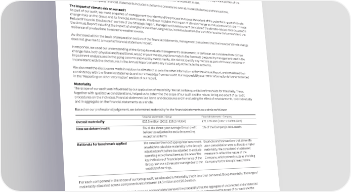 152 ITV plc Annual Report and Accounts 2023 ITV plc Annual Report and Accounts 2023 153 F I INDEPENDENT AUDITORS’ REPORT TO THE MEMBERS OF ITV PLC NAN CONTINUED C I AL Where the work was performed by component audit teams, we determined the level of involvement we needed to have in the audit work at Conclusions relating to going concern S T those components to be able to conclude whether sufficient appropriate audit evidence had been obtained as a basis for our opinion on the Our evaluation of the Directors’ assessment of the Group’s and the Company’s ability to continue to adopt the going concern basis of A T Group financial statements as a whole. Our oversight procedures included the issuance of formal, written instructions to component auditors E accounting included: M setting out the work to be performed and regular communication throughout the audit cycle including regular component calls and a site visit • A critical assessment of management’s base case and downside scenarios, challenging and obtaining corroborating evidence for the E N to the component team in the Netherlands, review of component auditor work papers and participation in audit clearance meetings. key assumptions, and verifying that the forecasts have been subject to board review and approval T • Examining the Group’s available financing, including related covenants, and maturity profile to assess liquidity through the assessment S Taken together, the components where we performed our audit work accounted for 79% of the Group’s external revenue, and 78% of the period Group’s absolute profit before tax and operating exceptional items. This was before considering the contribution to our audit evidence from • Reviewing the key inputs into the model management used to develop their scenarios to ensure that these were consistent with our performing audit work at the Group level, including disaggregated analytical review procedures, which covers a significant portion of the understanding and the inputs used in other key accounting judgements in the financial statements such as impairment Group’s smaller and lower risk components that were not directly included in our Group audit scope. • Assessing the historical reliability of management forecasting by comparing budgeted results to actual performance Our audit of the Company financial statements included substantive procedures over all material balances and transactions. • Performing our own independent sensitivity analysis to assess appropriate downside scenarios The impact of climate risk on our audit Based on the work we have performed, we have not identified any material uncertainties relating to events or conditions that, individually As part of our audit, we made enquiries of management to understand the process to assess the extent of the potential impact of climate or collectively, may cast significant doubt on the Group’s and the Company’s ability to continue as a going concern for a period of at least change risks on the Group and its financial statements. The Group explains the impact of climate change on its business within the ‘Climate twelve months from when the financial statements are authorised for issue. Related Financial Disclosures’ section of the Strategic Report. Management’s assessment considered the climate-related risks disclosed in In auditing the financial statements, we have concluded that the Directors’ use of the going concern basis of accounting in the preparation the Annual Report including the impact of changes in the advertising sector, increased costs in the transition to a low carbon world and the of the financial statements is appropriate. resilience of productions to extreme weather events. However, because not all future events or conditions can be predicted, this conclusion is not a guarantee as to the Group’s and the As disclosed within the basis of preparation section of the financial statements, management considered that the impact of climate change Company’s ability to continue as a going concern. does not give rise to a material financial statement impact. In relation to the Directors’ reporting on how they have applied the UK Corporate Governance Code, we have nothing material to add or draw In response, we used our understanding of the Group to evaluate management’s assessment; in particular, we considered how climate attention to in relation to the Directors’ statement in the financial statements about whether the Directors considered it appropriate to change risks, both physical and transitional, would impact the assumptions made in the forecasts prepared by management used in the adopt the going concern basis of accounting. impairment analysis and in the going concern and viability assessments. We did not identify any matters as part of this work which were inconsistent with the disclosures in the Annual Report or led to any material adjustments to the accounts. Our responsibilities and the responsibilities of the Directors with respect to going concern are described in the relevant sections of this report. We also read the disclosures made in relation to climate change in the other information within the Annual Report, and considered their consistency with the financial statements and our knowledge from our audit. Our responsibility over other information is further described Reporting on other information in the ‘Reporting on other information’ section of our report. The other information comprises all of the information in the Annual Report other than the financial statements and our auditors’ report Materiality thereon. The Directors are responsible for the other information. Our opinion on the financial statements does not cover the other materiality. These, information and, accordingly, we do not express an audit opinion or, except to the extent otherwise explicitly stated in this report, any form The scope of our audit was influenced by our application of mate