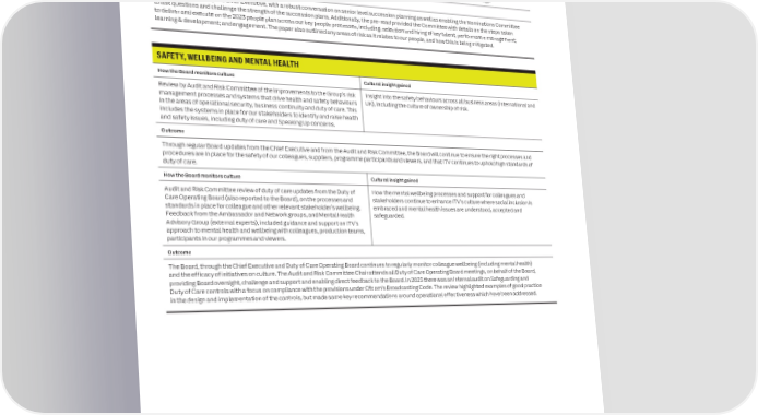 98 ITV plc Annual Report and Accounts 2023 ITV plc Annual Report and Accounts 2023 99 VALUES IN ACTION – UNDERSTANDING AND MONITORING OUR CULTURE CONTINUED G O VE R NAN C RECRUITMENT AND RETENTION SOCIAL PURPOSE, DIVERSITY EQUITY AND INCLUSION E How the Board monitors culture Cultural insight gained How the Board monitors culture Cultural insight gained Annual review session by the Nominations Committee of senior management As well as a review of succession plans, this session also provided the Board Annual review of ITV’s Social Purpose strategy, performance and plans. How ITV’s Social Purpose campaigns influence culture internally as well talent and succession planning led by the Chief Executive. with opportunity to understand how we had delivered the 2023 ITV people as externally. priorities, with focus on our key people processes, as well as how we are managing the people challenges and risks as we lean into our digital Outcome transformation and phase two of the More Than TV strategy. The Board will continue to monitor key priorities and initiatives in pursuit of ITV’s Social Purpose strategy. Outcome How the Board monitors culture Cultural insight gained The session was led by the Chief Executive, with a robust conversation on senior level succession planning as well as enabling the Nominations Committee Annual review of Diversity Equity and Inclusion. Regular updates on progress The impact the Diversity Acceleration Plan is having on colleague sentiment to ask questions and challenge the strength of the succession plans. Additionally, the pre-read provided the Committee with details on the steps taken on ITV’s Diversity Acceleration Plan and feedback from ITV’s inclusion and ITV’s reputation as having an inclusive culture, and the latter’s appeal to to deliver and execute on the 2023 people plan across our key people processes, including: selection and hiring of key talent; performance management; networks. Regular monitoring by Nominations Committee of progress against future employees. learning & development; and engagement. The paper also outlined any areas of risk as it relates to our people, and how this is being mitigated. diversity targets, with diversity on the Board agenda at least annually. How ITV’s culture is enabling progress to be accelerated through Group-wide Chief Executive attendance at ITV’s Cultural Advisory Council, comprising a diversity and inclusion initiatives. group of independent external advisers from a range of different industries and specialisms who advise, challenge and counsel ITV on its diversity, Equity SAFETY, WELLBEING AND MENTAL HEALTH and inclusion activities. How the Board monitors culture Cultural insight gained Review by Audit and Risk Committee of the improvements to the Group’s risk Insight into the safety behaviours across all business areas (international and Outcome management processes and systems that drive health and safety behaviours UK), including the culture of ownership of risk. The Nominations Committee will continue to monitor progress being made to meet diversity targets to ensure recruitment and succession initiatives support in the areas of operational security, business continuity and duty of care. This ITV’s Diversity, Equity and Inclusion strategy. See pages 37 to 39 for outcomes related to Diversity, Equity and Inclusion. includes the systems in place for our stakeholders to identify and raise health and safety issues, including duty of care and Speaking Up concerns. Outcome Through regular Board updates from the Chief Executive and from the Audit and Risk Committee, the Board will continue to ensure the right processes and SPEAKING UP procedures are in place for the safety of our colleagues, suppliers, programme participants and viewers, and that ITV continues to uphold high standards of duty of care. How the Board monitors culture Cultural insight gained How the Board monitors culture Cultural insight gained The Board receives data on Speaking Up reports received via the independent A perspective on the nature of colleague concerns and trends in the Safecall facility and other relevant channels available across ITV, at every behaviours of colleagues generally. Audit and Risk Committee review of duty of care updates from the Duty of How the mental wellbeing processes and support for colleagues and Board meeting. In addition, the Audit and Risk Committee reviews and Insight into how concerns are handled by ITV and indications of how the Care Operating Board (also reported to the Board), on the processes and stakeholders continue to enhance ITV’s culture where social inclusion is monitors the effectiveness of the Speaking Up policy, processes and alternative routes for raising all risk concerns are being utilised. standards in place for colleague and other relevant stakeholder’s wellbeing. embraced and mental health issues are understood, accepted and framework annually and receives Speaking Up reports at least twice a year Feedback from the Ambassador and Network groups, and Mental Health safeguarded. providing analysis of complaints received, those substantiated, process for Advisory Group (external experts), included guidance and support on ITV’s investigating, themes and actions taken. Feedback is given to the Board. approach to mental health and wellbeing with colleagues, production teams, Review conducted by the internal audit function in 2023 of the effectiveness participants in our programmes and viewers. of the Speaking Up process. Outcome See page 113 for the Speaking Up framework’s implementation in 2023. The Board, through the Chief Executive and Duty of Care Operating Board continues to regularly monitor colleague wellbeing (including mental health) and the efficacy of initiatives on culture. The Audit and Risk Committee Chair attends all Duty of Care Operating Board meetings, on behalf of the Board, providing Board oversight, challenge and support and enabling direct feedbac