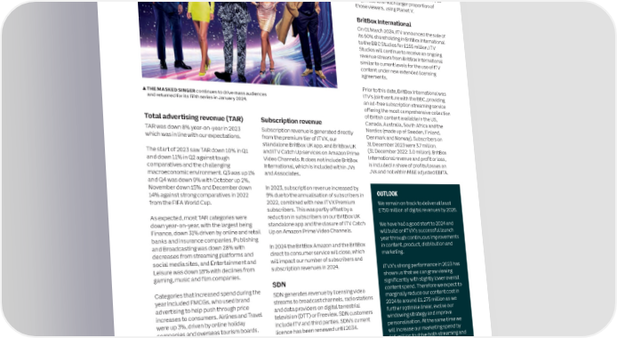 30 ITV plc Annual Report and Accounts 2023 ITV plc Annual Report and Accounts 2023 31 S OPERATING AND FINANCIAL PERFORMANCE REVIEW CONTINUED T R A T E G I With the expansion of ITVX’s online inventory Commercial and creative partnershipsnearly 400 digital-only advertisers to ITV in Partnerships and other revenue declined by C R and reach, ITV is well positioned to meet the 2023. For example: 2% in the year mainly driven by lower E ITV’s Commercial team delivers strategic P increasing demand for targeted advertising. competition revenue. O commercial and creative partnerships with • ITV AdVentures Ignite: Encouraging R We have a significant opportunity to partake advertisers who highly value ITV’s large and digitally native brands to advertise on T in the addressable market of around £6.8 targeted audiences to establish and grow television for the first time We expect Partnerships and other revenues billion in 2023 (Source: AA/WARC Q3 2023 their own brands. This includes product to decline in 2024 following our decision to Expenditure Report), and have the placement, ad-funded programming and • ITV AdVentures Invest: Through our Media revise our partnership agreements to allow foundations in place to successfully other partnerships that leverage the for Equity program, we take minority ITVX viewers to watch in HD, and allow ITV to compete for the long tail of advertisers within strength of our programme brands to help stakes in direct-to-consumer businesses target ads to a much larger proportion of the online video market which were advertisers connect with audiences in in return for advertising inventory across those viewers, using Planet V. previously inaccessible to ITV due to their unique ways. As a vertically integrated ITV’s linear TV channels and ITVX, for scale and targeting requirements. Since we producer broadcaster and streamer, we example, Flarin, a pain relief brand, and BritBox International launched Planet V we have attracted in have the advantage of having editorial, Resi, an architectural design company excess of 1,000 new advertisers to ITV.• ITV Ad Labs: This brings together all On 01 March 2024, ITV announced the sale of commercial, creative, and production teams its 50% shareholding in BritBox International working together, creating valuable innovations under one proposition and to the BBC Studios for £255 million. ITV ITVX and Planet V have helped drive opportunities for advertisers. includes data solutions which can Studios will continue to receive an ongoing growth in digital advertising revenue in the securely match client data with ITV’s revenue stream from BritBox International year, up 21%.Our Commercial team also has various existing registered first-party audience similar to current levels for the use of ITV initiatives to attract and engage advertisers, and Boots’ Advantage Card and Tesco’s content under new extended licensing attracting over 250 new brands to TV and Dunnhumby Clubcard databases. agreements. Prior to this date, BritBox International was THE MASKED SINGER continues to drive mass audiences ITV’s joint venture with the BBC, providing and returned for its fifth series in January 2024. an ad-free subscription streaming service M&E 2023 financial performance offering the most comprehensive collection of British content available in the US, 2023 2022 Change Change Total advertising revenue (TAR) Subscription revenue Canada, Australia, South Africa and the Twelve months to 31 December£m£m£m% Total advertising revenue1,7781,931(153)(8)TAR was down 8% year-on-year in 2023 Subscription revenue is generated directly Nordics (made up of Sweden, Finland, Subscription revenue595459 which was in line with our expectations. from the premium tier of ITVX, our Denmark and Norway). Subscribers on standalone BritBox UK app, and BritBox UK 31 December 2023 were 3.7 million. SDN4855(7)(13) (31 December 2022: 3.0 million). BritBox Partnerships and other revenue205209(4)(2)The start of 2023 saw TAR down 10% in Q1 and ITV Catch Up services on Amazon Prime and down 11% in Q2 against tough Video Channels. It does not include BritBox International revenue and profit or loss, M&E non-advertising revenue312318(6)(2)comparatives and the challenging International, which is included within JVs is included in share of profits/losses on Total M&E revenue2,0902,249(159)(7)macroeconomic environment. Q3 was up 1% and Associates. JVs and not within M&E adjusted EBITA. Content costs(1,293)(1,216)(77)(6)and Q4 was down 9% with October up 2%, Variable costs(153)(130)(23)(18)November down 15% and December down In 2023, subscription revenue increased by M&E infrastructure and overheads(439)(439)––14% against strong comparatives in 2022 9% due to the annualisation of subscribers in OUTLOOK Total M&E costs(1,885)(1,785)(100)(6)from the FIFA World Cup. 2022, combined with new ITVX Premium We remain on track to deliver at least subscribers. This was partly offset by a £750 million of digital revenues by 2026. Total M&E adjusted EBITA*205464(259)(56)As expected, most TAR categories were reduction in subscribers on our BritBox UK Total adjusted EBITA margin10%21%down year-on-year, with the largest being standalone app and the closure of ITV Catch We have had a good start to 2024 and * Refer to APMs for key adjustments to EBITAFinance, down 31% driven by online and retail Up on Amazon Prime Video Channels. will build on ITVX’s successful launch banks and insurance companies. Publishing year through continuous improvements and Broadcasting was down 28% with In 2024 the BritBox Amazon and the BritBox in content, product, distribution and 2023 2022 Change Change decreases from streaming platforms and direct to consumer service will close, which marketing. Twelve months to 31 December£m£m£m% Digital advertising revenue4153437221social media sites, and Entertainment and will impact our number of subscribers and Leisure was down 18% with declines from subscript