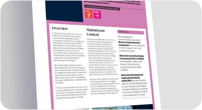 36 ITV plc Annual Report and Accounts 2023 ITV plc Annual Report and Accounts 2023 37 S SOCIAL PURPOSE CONTINUED T R A T E G I C R E Content by, with and for everyone, connecting P O Streamlined Energy and Carbon Reporting (SECR) – based on data for the year ended 31 December 2023 R 20232022Change DIVERSITY and reflecting modern audiences. T Global Global Global (excl. Equity & OUR GOALS ScopeDescriptionUnitUK(excl. UK)TotalUK(excl. UK)TotalUKUK) Emissions Champion diversity through our mainstream content, create 1from gas, Inclusion equitable opportunities at ITV and across the industry, and create refrigerants and owned vehiclestCO2e 1,448 284 1,731* 1,608 335 1,943 -10%-15% an inclusive culture at ITV. Build accessibility and disability equity Electricity emissions into everything we do at ITV. Location- using geographical basedlocationtCO2e 3,827 756 4,582* 4,261 1,101 5,361 -10%-31% 2 SUSTAINABLE DEVELOPMENT GOALS Market- Electricity emissions basedusing purchased electricity factortCO2e 1,669 794 2,463* 2,570 868 3,438 -35%-8% Location- Total 1 basedEmissionstCO2e 5,274 1,039 6,314 5,869 1,435 7,304 -10%-28% & 2Market- Total basedEmissionstCO2e 3,116 1,078 4,194 4,178 1,202 5,381 -25%-10% Direct & Indirect Energy ConsumptionkWh 24,793,533 4,417,537 29,211,070 26,975,667 5,501,408 32,477,075 -8%-20% Total revenue£m£4,260£4,345-2% Normalised Location- emissions to tCO2e/ Overview Mainstream THE RESULTS 1 basedrevenue£m 1.238 0.244 1.482 1.351 0.330 1.681 -8%-26% & 2Market- Normalised In 2023, we have continued to focus on Content basedemissions tCO2e/ We increased our to revenue£m 0.732 0.253 0.985 0.962 0.277 1.238 -24%-9%interventions that drive long-lasting commissioning spend with Purchased goods improvements. Highlights include We have committed £80 million of ITV’s 3and servicestCO2e274,626291,120-6%investing £22.8 million of our ringfenced content commissioning budget over diverse-led production 3Capital goodstCO2e2171,844-88%Diversity Commissioning Fund (DCF) three years (2022 to 2024) to drive companies by more than 50% Fuel and reaching £54.2 million over two years; racial and disability equity within our in the first year of our fund Energy-related Step Up 60 where 185 diverse creatives mainstream content. Alongside this, 3activitiestCO2e1,8562,170-14% the £500,000 Development Fund helps compared to 2021. Upstream have stepped up into more senior transportation production roles over three years; and to develop people and ideas that can 3and distributiontCO2e5581,338-58%delivering the Amplify senior leadership qualify for the DCF. As well as creating Diversity Commissioning 3WastetCO2e64623% programme for Deaf, Disabled or new content, the fund helped us Fund spend: £54.2 million 3Business traveltCO e24,07821,39213%Neurodivergent colleagues. continue investing in shows like Sorry, 2 including £41.1 million with 3CommutingtCO e8,5648,1136% I Didn’t Know, which returned for a 2 diverse-led production Upstream We made progress towards all of our fourth series in 2023. We commissioned 3leased assetstCO2e14,36114,373-0%2025 target areas at the All Colleagues diverse-led production companies companies (across 2022 3Use of sold productstCO2e487,910485,1711%level. At senior levels, progress towards including Douglas Road Productions, to 2023). 3InvestmentstCO e21,31214,56846%our targets has been slower, however we Flicker Productions, Fuuse Films, Tall 2 3Total Scope 3833,546*840,150-1%have made improvements overall. In Story Pictures and TriForce Productions. Diversity Development Total Scope 2023, we ran a successful campaign to Fund spend: Nearly 1, 2 & 3 increase diversity data completion rates We have made impactful improvements (Market- up to 82%. in the lead presenters of our biggest £400,000 has been used to Based)tCO2e837,740845,531-1% shows with Maya Jama (Love Island) and date to fund the development In 2024, we will maintain and build on our AJ Odudu (Big Brother). ITV Studios of over 30 projects including Methodology24% of our market-based Scope 1 and 2 data Where actual data was not available, ITV success, seeking out more diverse ideas, continues to make groundbreaking 2023 emissions data covers global operations set is based on estimated data, which makes spend data was multiplied by the latest CEDA diverse content including I Kissed A Boy, the pilot of Big Zuu’s 12 Dishes up 1% of the total data set. Estimates are EEIO factors. ITV will continue to monitor and production companies, and talent. We for which we have operational control. We use will continue to collaborate across the the UK’s first dating show for gay men. in 12 Hours leading to it being the Greenhouse Gases (GHG) Protocol calculated from previous consumption trends improve our emissions data quality, with an Corporate Accounting and Reporting and published benchmarks. initial focus on actual supplier specific data.industry to drive systemic change. commissioned for a series. Standard and the latest conversion factors Our Scope 2 footprint decreased in 2023 Energy efficiency initiatives from the Department for Energy Security and because of energy efficiencies in our buildings • A metering project has been launched to Net Zero to calculate Scope 1 and Scope 3 and an increase in renewable energy better understand the source of our energy Business Travel emissions, and the latest procurement. use, helping to proactively reduce energy conversion factors from the International consumption BIG ZUU’S 12 DISHES Energy Agency to calculate Scope 2 emissions The calculation methodology for the Scope 3 IN 12 HOURS in tonnes of carbon dioxide equivalents. category ‘Purchased Goods and Services’ in • The lighting in our Leeds archive has been 2023 includes actual supplier data provided swapped to LED lighting, using an estimated ‘Location-based’ calculations reflect the via the CDP (Carbon Disclosure Project), and quarter of the energy previously being used average emissions tha