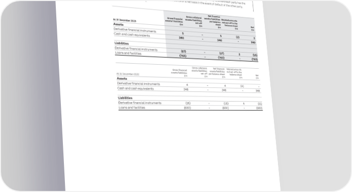 216 ITV plc Annual Report and Accounts 2023 ITV plc Annual Report and Accounts 2023 217 F I NOTES TO THE FINANCIAL STATEMENTS NAN SECTION 4: CAPITAL STRUCTURE AND FINANCING COSTS CONTINUED C I AL Keeping This table provides a reconciliation of each component of the translation reserve Netting arrangements of financial instruments S T reported within equity and an analysis of other comprehensive income in A it simple T accordance with IAS 1. Keeping This section details the Group’s financial assets and financial liabilities that are E subject to netting and set-off arrangements. Financial assets and liabilities that are M it simple E subject to set-off arrangements and disclosed on a net basis in the Group’s N T Set out below is the reconciliation of each component of the translation reserve reported in the Consolidated Statement of Financial Position relate to cash pooling arrangements. Amounts which S Statement of Changes in Equity and the analysis of other comprehensive income: do not meet the criteria for offsetting on the Consolidated Statement of Financial Position but could be settled net in certain circumstances principally relate to Cash Cost of Foreign derivative transactions executed under ISDA agreements where each party has the flow hedge hedge currency Translation option to settle amounts on a net basis in the event of default of the other party. reserve reserve reserve reserve £m £m £m £m As at 1 January 2022 3 (7) 45 41 Effective portion of changes in fair value arising from: Net financial Foreign exchange forward contracts (1) (4) – (5) Gross collateral assets/liabilities Related amounts Gross financial assets/liabilities per balance not set-off in the Cross-currency interest rate swaps – borrowings: assets/ liabilities set-off sheet balance sheet Net • Change in fair value from the effective hedge instrument 25 4 – 29 At 31 December 2023 £m £m £m £m £m Assets Amount reclassified to Income Statement Derivative financial instruments 5 – 5 (2) 3 • FX forward reclassified to cost of sales/overheads 4 – – 4 Cash and cash equivalents 340 – 340 – 340 • FX forward and swaps reclassified to finance costs (10) – – (10) • Amounts reclassified to work in progress 7 – – 7 Liabilities • CCIRS reclassified to finance costs (27) – – (27) Derivative financial instruments (17) – (17) 2 (15) Net loss on cash flow hedges and cost of hedging (2) – – (2) Loans and facilities (763) – (763) – (763) Foreign currency revaluation of the net foreign operations – – 67 67 Exchange differences on translation of foreign operations – – 67 67 Income tax credit on other comprehensive income/(expense) 1 – – 1 Gross collateral Net financial Related amounts Gross financial assets/liabilities assets/liabilities not set-off in the As at 31 December 2022 2 (7) 112 107 assets/liabilities set-off per balance sheet balance sheet Net At 31 December 2022 £m £m £m £m £m Effective portion of changes in fair value arising from: Assets Foreign exchange forward contracts (13) 4 – (9) Derivative financial instruments 4 – 4 (4) – Cross-currency interest rate swaps – borrowings: Cash and cash equivalents 348 – 348 – 348 • Change in fair value from the effective hedge instrument (9) 2 – (7) Amount reclassified to Income Statement Liabilities • FX forward reclassified to cost of sales/overheads 2 – – 2 Derivative financial instruments (15) – (15) 4 (11) • FX forward and swaps reclassified to finance costs 15 – – 15 Loans and facilities (830) – (830) – (830) • CCIRS reclassified to finance costs 11 – – 11 Net gain on cash flow hedges and cost of hedging 6 6 – 12 Foreign currency revaluation of the net foreign operations – – (38) (38) Exchange differences on translation of foreign operations – – (38) (38) Income tax charge on other comprehensive income/(expense) (1) (2) – (3) As at 31 December 2023 7 (3) 74 78