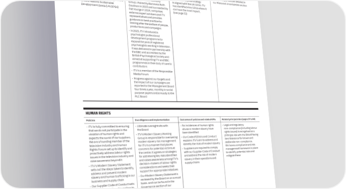 52 ITV plc Annual Report and Accounts 2023 ITV plc Annual Report and Accounts 2023 53 S T NON-FINANCIAL AND SUSTAINABILITY INFORMATION STATEMENT R A T E G I The table below, and the information it refers to, sets out our compliance C R SOCIAL IMPACT E P with the non‑financial reporting requirements in accordance with Sections O Policies Due diligence and implementation Outcomes of policies and related KPIs Related principal risks (pages 57 to 64) R 414CA and 414CB of the Companies Act 2006. T • Social Purpose is a core enabler in • We evaluate and monitor all • Our Social Purpose strategy • Social impact matters are not delivering ITV’s overall strategy. We our Social Purpose campaigns has four priorities relating to considered to be a standalone use ITV’s scale and creativity to and progress against our goals. Mental Wellbeing, Better Futures, principal risk, however social shape culture for good not just 2023 carbon emissions data has Climate Action and Diversity, Equity impact matters which influence Refer to page 2 for details on our Business Model.within ITV but across the UK and been independently verified by and Inclusion, (see pages 32) other principal risks are detailed in other markets that we might a third party • The Social Purpose strategy our Risks and Uncertainties section impact. We have set and published • ITV’s Mental Health Advisory is aligned with the UN SDGs. ITV ENVIRONMENT ambitious targets which align to the Group, chaired by Baroness Ruth has identified nine SDGs where it United Nations Sustainable Davidson in 2023 and succeeded by can have the most impact, PoliciesDue diligence and implementationOutcomes of policies and related KPIsRelated principal risks (pages 57 to 64)Development Goals (UN SDGs)Pat Younge in 2024, comprises (see page 32) external expert advisers and ITV • Our Environmental Management • We evaluate and monitor climate • Climate Action is one of the • Climate change is not currently representatives and provides Policy sets out our commitment to change risks and progress against priorities of ITV’s Social Purpose recognised as a principal risk of the guidance on best practice for reaching our Science Based Targets our environmental targets through strategy (see page 35). See more on Group, but is categorised as an looking after the welfare of people, on carbon emissions by 2030. In our governance structure, which this and our GHG dataemerging risk and kept under productions and campaigns addition, we are part of the includes the Climate Action • We are active members of the regular review through our risk • In 2023, ITV introduced a Business Ambition for 1.5 degrees, Delivery Group, and is referenced in industry sustainability body BAFTA management framework. However, psychologist professional setting additional 2050 goals for further detail in our TCFD report albert, and are committed to principal risks are assessed with a development programme to 90% carbon emissions reduction (see page 65)reducing the impact of production climate risk lens. We have identified expand the pool of registered across all Scopes• Progress against our environmental emissions by ensuring all the specific climate risks for ITV psychologists working in television. • We disclose against the Task targets is reported to the Studios, programmes produced or through climate scenario analysisIt was delivered in partnership with Force on Climate-related Financial Media & Entertainment, and commissioned in the UK are • For our TCFD report see page 65the BBC and accredited by the Disclosures (TCFD) framework Management Boards up to four albert certifiedBritish Psychological Society and our exposure to climate-related times a year, and annually to the aimed at supporting ITV and BBC risks and processes to mitigate PLC Board. The Audit and Risk programmes in their duty of care to these risksCommittee also has oversight contributors • ITV’s commitment to climate of environmental matters (see • ITV is a member of the Responsible action has been assessed by the page 114) Media Forum Carbon Disclosure Project and • All colleagues and Board • Progress against our targets and given an A rating, putting ITV in the members are required to the impact of our campaigns are top 2% of disclosing companies for complete mandatory training reported to the Management Board leadership in transparency and on climate action four times a year, monthly in social corporate reporting purpose papers and annually to the • Our Supplier Code of Conduct sets PLC Board out our expectation of our suppliers to align with our 2030 environmental targets HUMAN RIGHTS Policies Due diligence and implementation Outcomes of policies and related KPIs Related principal risks (pages 57 to 64) COLLEAGUES • ITV is fully committed to ensuring • Ultimate oversight sits with • No incidences of human rights • Legal and regulatory PoliciesDue diligence and implementationOutcomes of policies and related KPIsRelated principal risks (pages (57 to 64)that we do not participate in the the Boardabuse or modern slavery have non-compliance (including labour violation of human rights and • ITV’s Modern Slavery Working been identified rights issues) is recognised as a • Our Code of Ethics and Conduct • All colleagues and Board members • The Speaking Up framework has • Non-compliance with laws and expects the same of our suppliers. Group is responsible for overseeing • Our Code of Ethics and Conduct principal risk with the Board having (Our Code) promotes the highest complete annual mandatory been enhanced, making it easier to regulations is recognised as a We are a founding member of the modern slavery risk management explains ITV’s aim to address and zero tolerance for known and standards of ethical business, training aligned with Our Code.raise concerns and support ITV’s principal risk. The Board has zero television Industry and Human for ITV in a manner that 