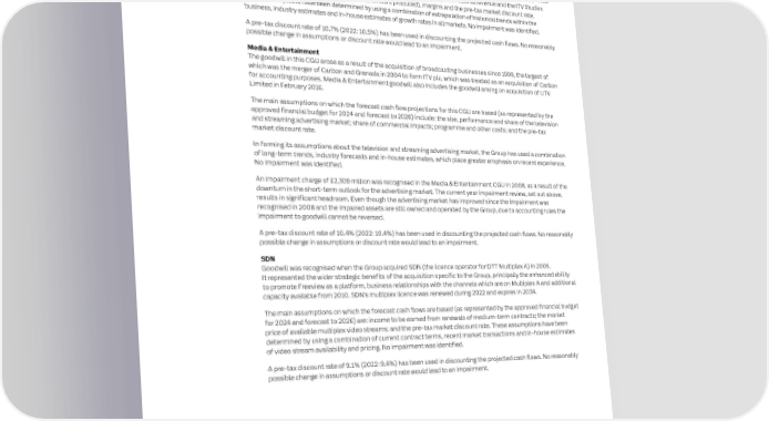 190 ITV plc Annual Report and Accounts 2023 ITV plc Annual Report and Accounts 2023 191 F I NOTES TO THE FINANCIAL STATEMENTS NAN SECTION 3: OPERATING ASSETS AND LIABILITIES CONTINUED C I AL Intangible assets ITV Studios S T Intangible assets can be analysed as follows: The goodwill for ITV Studios has arisen as a result of the acquisition of production businesses since 1999. Significant A T balances were created from the acquisition by Granada of United News and Media’s production businesses in 2000 E M Customer Software and the merger of Granada and Carlton in 2004 to form ITV plc. ITV Studios goodwill also includes the goodwill E Formats contracts and Contractual Libraries licences and N arising from acquisitions since 2012, with the largest acquisitions being Leftfield in 2014, followed by Talpa in 2015 T Goodwill and brands relationships arrangements Licences and other development Total and Plimsoll in 2022. S £m £m £m £m £m £m £m £m Cost At 1 January 2022 3,893 527 441 11 176 104 240 5,392 The key assumptions on which the forecast cash flows for the whole CGU were based (as represented by the approved financial budget for 2024 and forecast to 2026) include revenue (including international revenue and the ITV Studios Additions – – – – – – 44 44 share of ITV output, growth in commissions and hours produced), margins and the pre-tax market discount rate. Acquisitions 107 1 13 – – – – 121 These assumptions have been determined by using a combination of extrapolation of historical trends within the Disposals – – – – – – (5) (5) business, industry estimates and in-house estimates of growth rates in all markets. No impairment was identified. Foreign exchange 37 21 8 – – 2 1 69 At 31 December 2022 4,037 549 462 11 176 106 280 5,621 A pre-tax discount rate of 10.7% (2022: 10.5%) has been used in discounting the projected cash flows. No reasonably possible change in assumptions or discount rate would lead to an impairment. Additions – – – – – – 39 39 Disposals – – (1) – – – (63) (64) Media & Entertainment Foreign exchange (18) (9) (4) – – (1) – (32) The goodwill in this CGU arose as a result of the acquisition of broadcasting businesses since 1999, the largest of At 31 December 2023 4,019 540 457 11 176 105 256 5,564 which was the merger of Carlton and Granada in 2004 to form ITV plc, which was treated as an acquisition of Carlton for accounting purposes. Media & Entertainment goodwill also includes the goodwill arising on acquisition of UTV Amortisation and Limited in February 2016. impairment At 1 January 2022 2,654 460 433 11 129 93 134 3,914 The main assumptions on which the forecast cash flow projections for this CGU are based (as represented by the Charge for the year – 41 6 – 2 – 27 76 approved financial budget for 2024 and forecast to 2026) include: the size, performance and share of the television Reclassifications – – – – – – (5) (5) and streaming advertising market; share of commercial impacts; programme and other costs; and the pre-tax Foreign exchange – 19 7 – – – 1 27 market discount rate. At 31 December 2022 2,654 520 446 11 131 93 157 4,012 In forming its assumptions about the television and streaming advertising market, the Group has used a combination Charge for the year – 17 4 – 2 – 64 87 of long-term trends, industry forecasts and in-house estimates, which place greater emphasis on recent experience. Disposals – – (1) – – – (63) (64) No impairment was identified. Foreign exchange – (8) (4) – – (1) – (13) An impairment charge of £2,309 million was recognised in the Media & Entertainment CGU in 2008, as a result of the At 31 December 2023 2,654 529 445 11 133 92 158 4,022 downturn in the short-term outlook for the advertising market. The current year impairment review, set out above, Net book value results in significant headroom. Even though the advertising market has improved since the impairment was At 31 December 2023 1,365 11 12 – 43 13 98 1,542 recognised in 2008 and the impaired assets are still owned and operated by the Group, due to accounting rules the At 31 December 2022 1,383 29 16 – 45 13 123 1,609 impairment to goodwill cannot be reversed. Goodwill impairment tests A pre-tax discount rate of 10.4% (2022: 10.4%) has been used in discounting the projected cash flows. No reasonably possible change in assumptions or discount rate would lead to an impairment. The carrying amount of goodwill for each CGU is represented as follows: SDN 2023 2022 Goodwill was recognised when the Group acquired SDN (the licence operator for DTT Multiplex A) in 2005. £m £m ITV Studios 903 921 It represented the wider strategic benefits of the acquisition specific to the Group, principally the enhanced ability to promote Freeview as a platform, business relationships with the channels which are on Multiplex A and additional Media & Entertainment 386 386 capacity available from 2010. SDN’s multiplex licence was renewed during 2022 and expires in 2034. SDN 76 76 1,365 1,383 The main assumptions on which the forecast cash flows are based (as represented by the approved financial budget for 2024 and forecast to 2026) are: income to be earned from renewals of medium-term contracts; the market There has been no impairment charge for any CGU during the year (2022: £nil). price of available multiplex video streams; and the pre-tax market discount rate. These assumptions have been determined by using a combination of current contract terms, recent market transactions and in-house estimates When assessing impairment, the recoverable amount of each CGU is based on value in use calculations. These of video stream availability and pricing. No impairment was identified. calculations require the use of estimates, specifically: pre-tax cash flow projections; long-term growth rates; and a pre-tax market discount rate. Cash flow projections are based on the Group’s curren