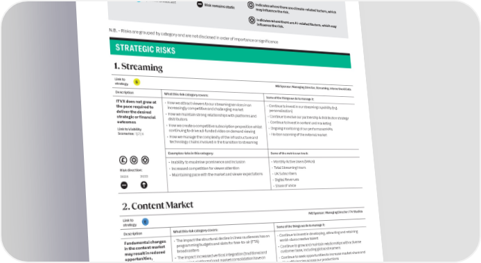 56 ITV plc Annual Report and Accounts 2023 ITV plc Annual Report and Accounts 2023 57 S RISKS AND UNCERTAINTIES CONTINUED T R A T E G I Principal risks and mitigations C R OUR RISK OVERSIGHT AND GOVERNANCE STRUCTURE AT A GLANCE E Set out below is a description of each of our principal risks and how they are being managed and mitigated. P O R T ITV PLC BoardAudit and Risk Key Link to strategy Risk direction of travel Emerging risks Committee (after current mitigations) (ARC) E Expand Studios globally Risk is increasing Indicates where there are macroeconomic related factors, which may influence the risk. S Supercharge Streaming Risk is reducing Indicates where there are climate-related factors, which O Optimise Broadcast Risk remains static may influence the risk. Management BoardRisk & Indicates where there are AI-related factors, which may Compliance influence the risk. Steering Committee (RCSC) N.B. – Risks are grouped by category and are not disclosed in order of importance or significance STRATEGIC RISKS Studios M&E Climate Action BoardBoardDelivery Group (CADG) 1. Streaming Link to S MB Sponsor: Managing Director, Streaming, Interactive & Data strategy Description What this risk category covers: Some of the things we do to manage it: ITVX does not grow at • How we attract viewers to our streaming services in an • Continue to invest in our streaming capability (e.g. the pace required to increasingly competitive and challenging market personalisation) Corporate Studios M&E deliver the desired • How we maintain strong relationships with platforms and • Continue to evolve our partnership & distribution strategy FunctionsRisk Working Risk Working strategic or financial distributors GroupGroup outcomes • Continue to invest in content and marketing • How we create a competitive subscription proposition whilst • Ongoing monitoring of our performance KPIs Link to Viability continuing to drive ad-funded video on demand viewing Scenarios: 1 | 2 | 6 • Horizon scanning of the external market • How we manage the complexity of the infrastructure and technology chains involved in the transition to streaming Examples risks in this category: Some of the metrics we track: • Inability to maximise prominence and inclusion • Monthly Active Users (MAUs) KeyDirection and managementReporting and escalationAdvice and oversightRisk direction:• Increased competition for viewer attention • Total Streaming Hours 2023 2022 • Maintaining pace with the market and viewer expectations • UK Subscribers • Digital Revenues • Share of Voice Risk Management EffectivenessChanges to principal risks • The addition of ‘Third-Party Risk 2. Content Market The PLC Board continues to monitor the during the yearManagement’ to recognise the increasing effectiveness of risk management at ITV. An complexity and importance of our Link to MB Sponsor: Managing Director. ITV Studios The ongoing management and monitoring of third-party relationships and the potential strategyE independent assessment of ITV’s risk ITV’s most critical risks throughout the year these have to cause significant damage management framework and practices was has led to changes to the principal risks from to our reputationDescriptionWhat this risk category covers: Some of the things we do to manage it: conducted during Q4 2023 as part of the the previous reporting period (H1 2023). 2023 internal audit plan. The review • Promoting ‘Operational Resilience’ Fundamental changes • The impact the structural decline in linear audiences has on • Continue to invest in developing, attracting and retaining These included: in the content market programming budgets and slots for free-to-air (FTA) world-class creative talent concluded that significant progress has been to recognise the importance of being • Splitting ‘cyber-attack or data breach able to withstand and recover from may result in reduced broadcasters • Continue to grow and maintain relationships with a diverse made over the last year to achieve an opportunities, • The impact increased vertical integration (traditional and customer base, including global streamers effective state for principal risk management incident’ into two separate principal risks our technology and/or services non-renewal of to enhance transparency, improve being compromised. streaming platforms) and market consolidation have on • Continue to seek opportunities to increase market share and within ITV, with a number of opportunities to premium programmes, intensifying market competition drive efficiencies across our productions enhance the framework and practices accountability and enable us to establish and/or impact the more focused mitigation strategiesprofitability of ITV • The impact that market changes could have on the demand identified and reflected in our risk for, and profitability of ITV’s content management plans for 2024.• Removing ‘Pensions Deficit’ as the Studios content ITV pension scheme position has Link to Viability Examples risks in this category: Some of the metrics we track: significantly improved Scenarios: N/A • Content spend cuts from FTA broadcasters and streamers • ITV Studios total organic revenue growth • Inability to grow streamer customer base as they become • ITV Studios adjusted EBITA margin % a growing part of the content market • Total high-end scripted hours Risk direction: • Increased pressure on our pricing, rights and 2023 2022 • Number of formats sold in three or more countries production premium • % of ITV Studios total revenue from streaming platforms