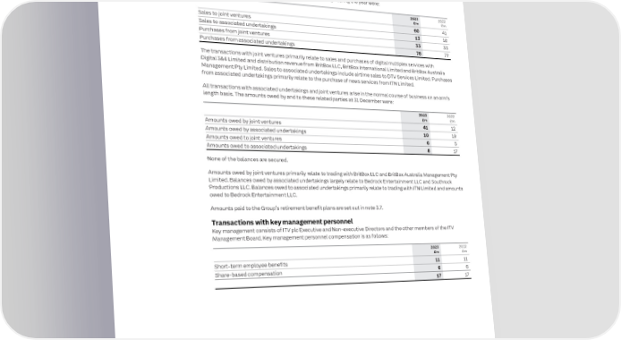 224 ITV plc Annual Report and Accounts 2023 ITV plc Annual Report and Accounts 2023 225 F I NOTES TO THE FINANCIAL STATEMENTS NAN SECTION 4: CAPITAL STRUCTURE AND FINANCING COSTS CONTINUED SECTION 5: OTHER NOTES C I AL Of the options still outstanding, the range of exercise prices and weighted average remaining contractual life of these 5.1 Keeping The related parties identified by the Directors include joint ventures, associated S T options can be analysed as follows: it simple undertakings, fixed asset investments and key management personnel. A Related T E 2023 2022 party To enable users of our financial statements to form a view about the effects of M E Weighted Weighted transactions related party relationships on the Group, we disclose the Group’s transactions with N Weighted average Weighted average T average Number remaining average Number remaining those related parties during the year and any associated year end trading balances. S exercise price of options contractual life exercise price of options contractual life Range of exercise prices (pence) (pence) (‘000) (years) (pence) (‘000) (years) Transactions with joint ventures and associated undertakings Nil – 49,386 0.33 – 59,056 0.29 20.00 – 49.99 49.17 15,330 1.17 49.17 29,225 1.81 Transactions with joint ventures and associated undertakings during the year were: 50.00 – 69.99 58.51 21,454 2.79 61.73 10,878 3.44 2023 2022 70.00 – 99.99 79.42 3,965 2.12 85.22 5,351 1.35 £m £m 100.00 – 109.99 105.98 61 0.92 105.98 90 1.46 Sales to joint ventures 60 41 120.00 – 149.99 135.20 38 0.33 130.61 129 0.94 Sales to associated undertakings 13 16 Purchases from joint ventures 33 33 Assumptions Purchases from associated undertakings 78 77 ESP, DSA, LTIP and PSP options are valued directly by reference to the share price at date of grant. The transactions with joint ventures primarily relate to sales and purchases of digital multiplex services with The options granted in the current and prior year for the HMRC approved SAYE scheme, are valued using the Black–Digital 3&4 Limited and distribution revenue from BritBox LLC, BritBox International Limited and BritBox Australia Scholes model, using the assumptions below: Management Pty Limited. Sales to associated undertakings include airtime sales to DTV Services Limited. Purchases from associated undertakings primarily relate to the purchase of news services from ITN Limited. Gross Share price Exercise Expected Expected dividend Risk-free All transactions with associated undertakings and joint ventures arise in the normal course of business on an arm’s at grant price volatility life yield rate Fair value length basis. The amounts owed by and to these related parties at 31 December were: Scheme name Date of grant (pence) (pence) % (years) % % (pence) 3 Year 12 April 2022 79.08 67.72 47.00 3.25 – 1.55 21.19 2023 2022 5 Year 12 April 2022 79.08 67.72 40.05 5.25 – 1.58 18.45 £m £m 3 Year 5 September 2022 62.74 57.73 47.80 3.25 – 2.97 14.95 Amounts owed by joint ventures 41 12 5 Year 5 September 2022 62.74 57.73 41.03 5.25 – 2.85 12.63 Amounts owed by associated undertakings 10 19 3 Year 5 April 2023 79.78 70.12 45.43 3.25 – 3.40 21.53 Amounts owed to joint ventures 6 5 5 Year 5 April 2023 79.78 70.12 42.41 5.25 – 3.28 20.99 Amounts owed to associated undertakings 8 17 3 Year 13 September 2023 72.34 56.37 40.60 3.25 – 4.47 20.17 None of the balances are secured. 5 Year 13 September 2023 72.34 56.37 42.27 5.25 – 4.29 20.57 Employees’ Benefit Trust Amounts owed by joint ventures primarily relate to trading with BritBox LLC and BritBox Australia Management Pty Limited. Balances owed by associated undertakings largely relate to Bedrock Entertainment LLC and Southrock The Group has investments in its own shares as a result of shares purchased by the ITV Employees’ Benefit Trust Productions LLC. Balances owed to associated undertakings primarily relate to trading with ITN Limited and amounts (EBT). Transactions with the Group-sponsored EBT are included in these financial statements and consist of the owed to Bedrock Entertainment LLC. EBT’s purchases of shares in ITV plc, which is accounted for as a reduction to retained earnings. Amounts paid to the Group’s retirement benefit plans are set out in note 3.7. The table below shows the number of ITV plc shares held in the EBT at 31 December 2023 and the releases from the EBT made in the year to satisfy awards under the Group’s share schemes: Transactions with key management personnel Key management consists of ITV plc Executive and Non-executive Directors and the other members of the ITV Number of shares Nominal value Management Board. Key management personnel compensation is as follows: Scheme Shares held at (released)/purchased £ 1 January 2023 14,587,379 1,458,738 2023 2022 LTIP releases (93,835) £m £m DSA releases (3,115,726) Short-term employee benefits 11 11 ESP releases (226,277) Share-based compensation 6 6 PSP releases (5,995,984) 17 17 SAYE releases (13,150,667) Market purchased shares 9,510,276 Newly issued shares 27,000,000 31 December 2023 28,515,166 2,851,517 The total number of shares held by the EBT at 31 December 2023 represents 0.77% (2022: 0.36%) of ITV’s issued share capital. The market value of own shares held at 31 December 2023 is £18 million (2022: £11 million). The shares will be held in the EBT until such time as they may be transferred to participants of the various Group share schemes. Rights to dividends have been waived by the EBT in respect of shares held that do not relate to restricted shares under the DSA. In accordance with the Trust Deed, the Trustees of the EBT have the power to exercise all voting rights in relation to any investment (including shares) held within that trust. The Trust is accounted for as a separate entity and therefore is only accounted for in the consolidated financial statements and not included in the ITV plc Company financial statements.