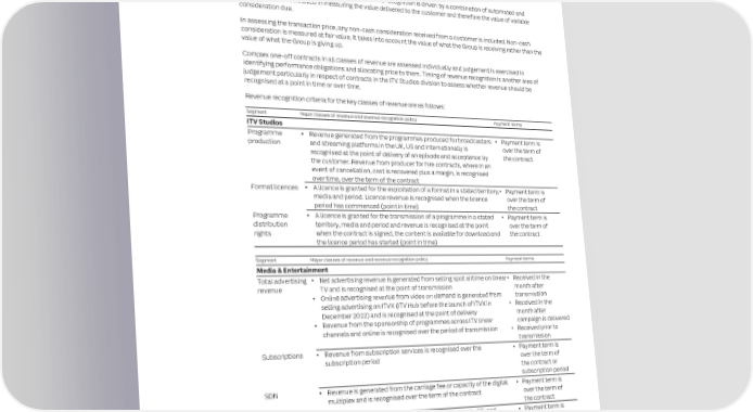 166 ITV plc Annual Report and Accounts 2023 ITV plc Annual Report and Accounts 2023 167 F I NOTES TO THE FINANCIAL STATEMENTS NAN SECTION 2: RESULTS FOR THE YEAR C I AL In this This section focuses on the results and performance of the Group. On the following The transaction price, being the amount to which the Group expects to be entitled and has rights to under the S T section pages, you will find disclosures explaining the Group’s results for the year, contract is allocated to the identified performance obligations. The transaction price will also include an estimate of A T segmental information, exceptional items, taxation and earnings per share. any variable consideration where the Group’s performance may result in additional revenues. Variable consideration E M is estimated based on the achievement of agreed targets, such as audience targets. Variable consideration is E N recognised only to the extent that it is highly probable that a significant reversal of revenue recognised will not occur T 2.1 Profit Keeping This section analyses the Group’s profit before tax by reference to the activities when the uncertainty associated with the variable consideration is subsequently resolved. S before tax it simple performed by the Group and an analysis of key operating costs. Total revenue and adjusted earnings before interest, tax and amortisation (adjusted Revenue is stated exclusive of VAT and equivalent sales taxes. EBITA) (both as defined in the APMs section of the Annual Report) are the Group’s Complexity in advertising revenue measurement and recognition is driven by a combination of automated and key performance and profit indicators. They reflect the way the business is managed manual processes involved in measuring the value delivered to the customer and therefore the value of variable and how the Directors assess the performance of the Group. This section therefore consideration due. also shows each division’s contribution to total revenue and adjusted EBITA. In assessing the transaction price, any non-cash consideration received from a customer is included. Non-cash The Group is a vertically integrated producer broadcaster and streamer, consisting of ITV Studios and Media & consideration is measured at fair value. It takes into account the value of what the Group is receiving rather than the Entertainment (M&E). value of what the Group is giving up. ITV Studios Complex one-off contracts in all classes of revenue are assessed individually and judgement is exercised in ITV Studios is a scaled and global creator, owner and distributor of high-quality TV content. ITV Studios is the largest identifying performance obligations and allocating price to them. Timing of revenue recognition is another area of producer in the UK, one of the largest unscripted producers in the US and one of the top three producers in the judgement particularly in respect of contracts in the ITV Studios division to assess whether revenue should be majority of the international markets in which it operates. ITV Studios has established relationships with key content recognised at a point in time or over time. buyers and leading creative talent in those markets; and with a combined content library of over 90,000 hours, it is Revenue recognition criteria for the key classes of revenue are as follows: also one of the pre-eminent global distributors. Segment Major classes of revenue and revenue recognition policy Payment terms ITV Studios UK, the largest producer in the UK, produces programming for the Group’s own channels, accounting ITV Studios for 70% of ITV main channel spend on commissioned programming (2022: 65%). Programming is also sold to other UK broadcasters, networks and streaming platforms. Programme • Revenue generated from the programmes produced for broadcasters • Payment term is production and streaming platforms in the UK, US and internationally is over the term of ITV Studios US is one of the largest unscripted producers in the US and continues to grow its scripted presence by recognised at the point of delivery of an episode and acceptance by the contract investing in high-profile dramas. the customer. Revenue from producer for hire contracts, where in an event of cancellation, cost is recovered plus a margin, is recognised ITV Studios also operates in ten other international locations, together called ITV Studios International, being over time, over the term of the contract Australia, Germany, France, Italy, Spain, the Netherlands, Sweden, Norway, Finland and Denmark where content is • A licence is granted for the exploitation of a format in a stated territory, Format licences • Payment term is produced for local and international broadcasters, networks and streaming platforms. This content is either locally media and period. Licence revenue is recognised when the licence over the term of created IP or formats that have been created elsewhere by ITV, primarily in the UK, the Netherlands and in Israel. period has commenced (point in time) the contract ITV Studios Global Partnerships license ITV’s finished programmes, formats and third-party content internationally. Programme • A licence is granted for the transmission of a programme in a stated • Payment term is Within this business, the Group also finances productions both on and off ITV to acquire global distribution rights. distribution territory, media and period and revenue is recognised at the point over the term of rights when the contract is signed, the content is available for download and the contract Media & Entertainment the licence period has started (point in time) ITV is the largest commercial broadcaster and streamer in the UK, delivering unrivalled audience scale and reach. Segment Major classes of revenue and revenue recognition policy Payment terms Media & Entertainment (M&E) includes Streaming and Broadcast through which we distribute content via ITVX, our free advertiser-funded streaming service, and