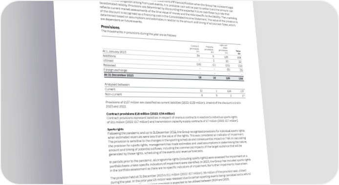 194 ITV plc Annual Report and Accounts 2023 ITV plc Annual Report and Accounts 2023 195 F I NOTES TO THE FINANCIAL STATEMENTS NAN SECTION 3: OPERATING ASSETS AND LIABILITIES CONTINUED C I AL 3.6 Keeping A provision is recognised by the Group where an obligation exists relating to events Legal and other provisions £126 million (2022: £126 million) S T in the past and it is probable that cash will be paid to settle it. Represents provisions for potential liabilities (arising from legal disputes and claims) and their related legal costs. A Provisions it simple T These include £52 million (2022: £52 million) for the potential liability that may arise as a result of the Box Clever E A provision is made where the Group is not certain how much cash will be required to M Financial Support Directions (FSDs) issued by the Pensions Regulator (tPR), employee-related tax and other E settle a liability, so an estimate is required. The main estimates relate to the cost of N provisions of £61 million (2022: £59 million) and other legal and related costs. T holding properties that are no longer in use by the Group, the likelihood of settling S legal claims and contracts the Group has entered into that are now unprofitable. Box Clever Pension Scheme Box Clever Technology Limited (Box Clever) was a TV rental business joint venture set up by Granada Rental and Accounting policies Retail Limited and Carmelite Investments Limited (parent company of Thorn Limited (Thorn) in 1999. The business A provision is recognised in the Consolidated Statement of Financial Position when the Group has a present legal went into administrative receivership in 2003. The Box Clever Pension Scheme (the Scheme) was managed from its or constructive obligation arising from past events, it is probable cash will be paid to settle it and the amount can establishment by an independent Trustee and the Group has not had any commercial connection with the Box be estimated reliably. Provisions are determined by discounting the expected future cash flows by a rate that Clever business since it went into administrative receivership in 2003. After proceedings in the Upper Tribunal and reflects current market assessments of the time value of money and the risks specific to the liability. The unwinding Court of Appeal were dismissed, certain companies within ITV were issued with FSDs by tPR on 17 March 2020. of the discount is recognised as a financing cost in the Consolidated Income Statement. The value of the provision is An FSD does not set out what form any financial support should take, nor its amount, and those issues have not yet determined based on assumptions and estimates in relation to the amount and timing of actual cash flows, which been resolved as part of the legal process. are dependent on future events. The legislation provides that any contribution that ITV may make must be considered reasonable. If an agreement is Provisions reached with tPR there may not be an immediate cash flow impact. If an agreement cannot be reached, further legal proceedings could take several years to resolve. The movements in provisions during the year are as follows: At 31 December 2003, the Scheme was estimated to have had a deficit on a buyout basis of £25 million. An estimate Legal and of the deficit in the Box Clever Group Pension Scheme was calculated at £110 million as at 31 March 2021. This Contract Property other provisions provisions provisions Total estimate was calculated on a buyout basis based on membership data as of February 2020. This estimate has been £m £m £m £m updated based on 31 December 2023 market conditions and has reduced to £78 million primarily due to the increase At 1 January 2023 34 9 126 169 in gilt yields and recent changes in inflation. All of these valuations were of the whole Scheme, encompassing Additions – 2 20 22 liabilities in respect of former employees of Granada's joint venture partner, Thorn, as well as former employees Utilised (16) (1) (15) (32) of the Group. Released – – (5) (5) As reported previously, in 2022 the Group received a warning notice from tPR that it was considering exercising Foreign exchange – – – – its power to issue a contribution notice for the amount of £133 million, which is based on a buyout estimate as at At 31 December 2023 18 10 126 154 31 March 2021 provided by the Scheme’s actuarial adviser, plus a prudent margin. The Group made representations in relation to the warning notice on 31 October 2022, tPR responded on 28 July 2023 and the Group replied on Analysed between: 14 November 2023. ITV has continued to engage with tPR during the relevant period. Current 12 1 124 137 There remains a significant number of undecided issues as to the quantum and form of financial support and the Non-current 6 9 2 17 Directors continue to believe there are many important factors which need to be taken into account in any decision, and therefore there remains uncertainty around the financial support to be provided. The provision remains at Provisions of £137 million are classified as current liabilities (2022: £139 million). Unwind of the discount is £nil in £52 million, and represents the offer made to settle the matter and is based on an IAS 19 valuation to transfer certain 2023 and 2022. liabilities into the existing ITV pension scheme, which we consider to be the most likely form of settlement. We are Contract provisions £18 million (2022: £34 million) continuing to engage with tPR to resolve the matter. Contract provisions represent liabilities in respect of onerous contracts in relation to individual sports rights Employee-related of £11 million (2022: £17 million) and transmission capacity supply contracts of £7 million (2022: £17 million). The determination of the employment tax status of some individuals contracted by the Group is complex. HMRC has issued assessments to the Group for several individuals engaged by the Group during the tax years 2016/