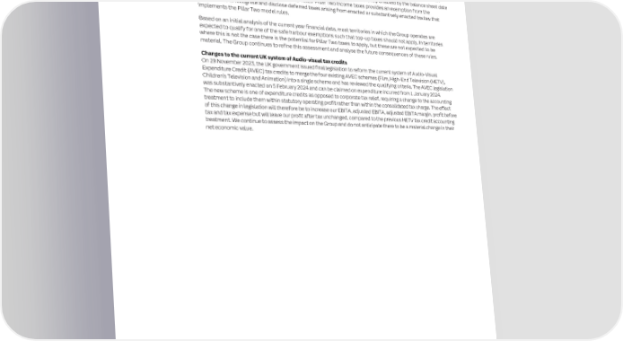 176 ITV plc Annual Report and Accounts 2023 ITV plc Annual Report and Accounts 2023 177 F I NOTES TO THE FINANCIAL STATEMENTS NAN SECTION 2: RESULTS FOR THE YEAR CONTINUED C I AL Taxation – Other comprehensive income (OCI) and equity Subsidiaries of ITV plc Group have undistributed earnings of £42 million (2022: £26 million) which, if paid out as S T As analysed in the table below a deferred tax charge of £2 million (2022: £23 million charge) has been recognised on dividends, would be subject to tax in the hands of the recipient. An assessable temporary difference exists, but no A T deferred tax liability has been recognised as ITV plc Group is able to control the timing of the distributions from E actuarial movements on pensions. Other temporary differences recognised in other comprehensive income include, M no deferred tax (2022: credit of £5 million) on gilts, £1 million deferred tax charge on derivatives (2022: £1 million these subsidiaries and is not expected to distribute these profits in the foreseeable future. E N credit) and £2 million deferred tax charge on the cost of hedging (2022: £nil). A deferred tax charge of £3 million T (2022: £7 million charge) has been recognised in equity in respect of share-based payments. Finance (No 2) Bill and Pillar Two impact on financial statements S the UK, introducing a global minimum On 20 June 2023, Finance (No.2) Act 2023 was substantively enacted in There has been £11 million current tax credit recognised in other comprehensive income in the current year on pensions. effective tax rate of 15% for large groups and for financial years beginning on or after 31 December 2023. Taxation There has been no current tax on foreign exchange movements net of hedging (2022: £nil). There has been £1 million balances are adjusted for a change in tax law if the change has been substantively enacted by the balance sheet date current tax credit recognised in equity in the current year in relation to share-based compensation (2022: £nil). however the amendments to IAS 12 ‘Income Taxes’ Pillar Two income taxes provides an exemption from the requirement to recognise and disclose deferred taxes arising from enacted or substantively enacted tax law that Taxation – Consolidated Statement of Financial Position implements the Pillar Two model rules. Statement of The table below outlines the deferred tax assets/(liabilities) that are recognised in the Consolidated Financial Position, together with their movements in the year: Based on an initial analysis of the current year financial data, most territories in which the Group operates are expected to qualify for one of the safe harbour exemptions such that top-up taxes should not apply. In territories At Recognised in Recognised At where this is not the case there is the potential for Pillar Two taxes to apply, but these are not expected to be 1 January the income in OCI Foreign 31 December material. The Group continues to refine this assessment and analyse the future consequences of these rules. 2023 statement and equity Other exchange 2023 £m £m £m £m £m £m Changes to the current UK system of Audio-visual tax credits Tangible assets 1 (6) – – – (5) the current system of Audio-Visual On 29 November 2023, the UK government issued final legislation to reform Intangible assets (49) (1) – – 1 (49) Expenditure Credit (AVEC) tax credits to merge the four existing AVEC schemes (Film, High-End Television (HETV), Pension scheme (56) (1) (2) – – (59) Children’s Television and Animation) into a single scheme and has reviewed the qualifying criteria. The AVEC legislation Tax losses 27 7 – – (2) 32 was substantively enacted on 5 February 2024 and can be claimed on expenditure incurred from 1 January 2024. Share-based compensation 9 (1) (3) – – 5 The new scheme is one of expenditure credits as opposed to corporate tax relief, requiring a change to the accounting Other temporary differences 30 (5) (3) 1 – 23 treatment to include them within statutory operating profit rather than within the consolidated tax charge. The effect (38) (7) (8) 1 (1) (53) of this change in legislation will therefore be to increase our EBITA, adjusted EBITA, adjusted EBITA margin, profit before tax and tax expense but will leave our profit after tax unchanged, compared to the previous HETV tax credit accounting treatment. We continue to assess the impact on the Group and do not anticipate there to be a material change in their At Recognised in Recognised At net economic value. 1 January the income in OCI Foreign 31 December 2022 statement and equity Other exchange 2022 £m £m £m £m £m £m Tangible assets 4 (3) – – – 1 Intangible assets (45) 1 – (3) (2) (49) Pension scheme (6) (27) (23) – – (56) Tax losses 32 (8) – – 3 27 Share-based compensation 11 5 (7) – – 9 Other temporary differences 29 (12) 6 4 3 30 25 (44) (24) 1 4 (38) At 31 December 2023, the net deferred tax liability position is £53 million (2022: £38 million liability), consisting of total deferred tax assets of £106 million (2022: £133 million) and total deferred tax liabilities of £159 million (2022: £171 million). The Consolidated Statement of Financial Position presents deferred tax after netting off balances within countries – a deferred tax asset of £6 million and a deferred tax liability of £59 million (2022: deferred tax asset of £19 million and a deferred tax liability of £57 million). The deferred tax balances relate to: • Property, plant and equipment temporary differences arising on assets qualifying for tax depreciation • Temporary differences on intangible assets, including those arising on business combinations • Programme rights – temporary differences on intercompany profits on stock • Pension scheme temporary differences on the IAS 19 pension surplus and SDN and LTVC pension funding partnerships • Temporary differences arising from the timing of the use of tax losses • Sh