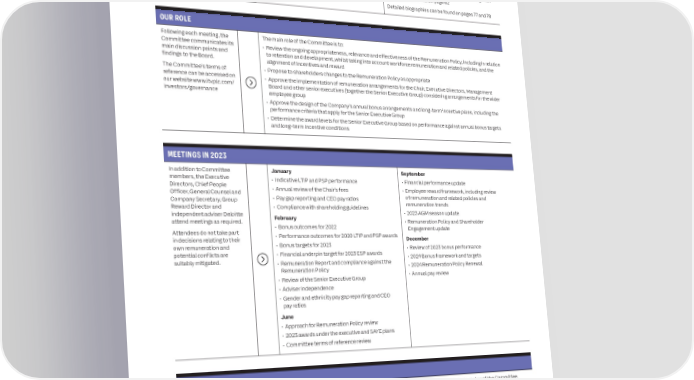 118 ITV plc Annual Report and Accounts 2023 ITV plc Annual Report and Accounts 2023 119 REMUNERATION REPORT CONTINUED G O VE R NAN As our strategic transformation continues Salary increases were scaled from 6% for Incentive outcomes Remuneration Committee C and given that the Restricted Share scheme The Company’s resilient performance lower paid employees, 5% for low-mid tier E is only in its third year of operation, the despite economic headwinds was reflected roles, 4% for mid-senior roles and 3% for the WHO IS ON THE COMMITTEE Remuneration Committee has concluded in the incentive outturns. The 2023 annual more senior executives. As detailed in last that the current remuneration structure bonus was based on adjusted EBITA (60%), year’s report, a similar approach was taken The Committee is composed The current members are:Anna Manz and Duncan Painter stepped down as continues to support our strategic goals and for the 2023 salary increases, with uplifts of independent • Sharmila Nebhrajani (Chair) members of the Committee in the year. Edward Bonham enables the business to remain agile in a cash conversion (10%), individual strategic of up to 6% applied for lower paid staff. Non-executive Directors.Carter joined as a Committee member in April 2023 targets (20%), as well as a scorecard of • Salman Amin dynamic and cyclical sector where viewer ESG priorities (10%). Financial targets were In January 2023, a one-off cost of living • Andrew Cosslett Full details of attendance at Committee meetings can behaviours continue to evolve. We therefore payment was made providing £1,000 to • Edward Bonham Carter be found in the table on page 82 propose to roll forward the previous policy set in the context of advertising market all our staff earning up to £75,000. Although uncertainty, with targets set to be Detailed biographies can be found on pages 77 and 78 with only minor amendments. stretching but realistic. the 2023 Employee Bonus outcome of £764 for wider staff was lower than prior years, As part of the policy renewal process we While adjusted EBITA achievement was at reflecting the lower than expected EBITA, engaged with a number of our major the lower end of the targeted range, cash management elected to make a one-off OUR ROLE investors. Consistent with the messaging conversion was ahead of planned results additional payment to staff of £636. This received in prior years, it was clear that while combined payment of £1,400 reflects the Following each meeting, the The main role of the Committee is to: the majority of investors and mainstream and progress was made against our ESG exceptional levels of commitment shown by Committee communicates its • Review the ongoing appropriateness, relevance and effectiveness of the Remuneration Policy, including in relation proxy voting agencies continue to support scorecard measures. As noted above, the employees in delivering the transformation main discussion points and to retention and development, whilst taking into account workforce remuneration and related policies, and the business also made significant progress on findings to the Board. alignment of incentives and reward our approach to pay, a minority of investors executing our strategic goals in response to of the business. retain reservations. Although we are mindful The Committee’s terms of • Propose to shareholders changes to the Remuneration Policy as appropriate of the diverse views of our investors, we have the evolving marketplace. The overall bonus Reflecting our broader ethos, ITV remains reference can be accessed on • Approve the implementation of remuneration arrangements for the Chair, Executive Directors, Management outcome for the Executive Directors was committed to ensuring all colleagues earn our website www.itvplc.com/Board and other senior executives (together the Senior Executive Group) considering arrangements for the wider opted to retain the current pay approach as it 56.41% of maximum, with one-third of the investors/governance continues to support our strategy. The 2021 at least the real Living Wage. The Company employee group policy represented a major shift in approach bonus award deferred into shares for three remains similarly committed to Diversity and • Approve the design of the Company’s annual bonus arrangements and long-term incentive plans, including the and the first Restricted Share awards under years. This represents a significantly lower in addition to its gender pay gap data, ITV has performance criteria that apply for the Senior Executive Group this policy will not be released until 2026; outturn than the 81.72% achieved by both voluntarily published its ethnicity pay gap • Determine the award levels for the Senior Executive Group based on performance against annual bonus targets it therefore feels premature to make further directors for 2022, primarily reflecting information since 2018, one of only a small and long-term incentive conditions radical change at this stage. the economic backdrop impacting number of FTSE companies to do so. ITV has financial performance. also been calculating its disability and The Board continues to maintain dialogue This is also the first year in which the LGBTQ+ pay gaps since 2020 and published MEETINGS IN 2023 with investors, and the Remuneration Restricted Share awarded to our Executive this information for the first time in 2023. Committee has engaged with them on Directors will vest. Although the single figure In addition to Committee January September numerous occasions over recent years. includes a value for the first award granted in Concluding remarksmembers, the Executive • Indicative LTIP and PSP performance• Financial performance update In many cases remuneration proposals Directors, Chief People • Annual review of the Chair’s fees • Employee reward framework, including review have been adapted in direct response to 2021, in practice these awards will only be As a Committ