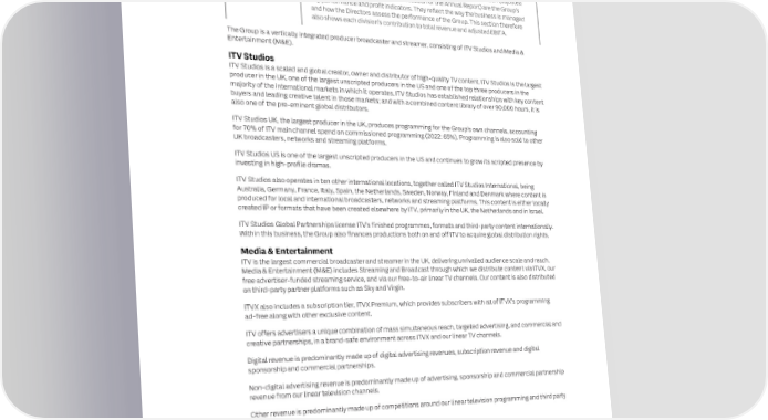 166 ITV plc Annual Report and Accounts 2023 ITV plc Annual Report and Accounts 2023 167 F I NOTES TO THE FINANCIAL STATEMENTS NAN SECTION 2: RESULTS FOR THE YEAR C I AL In this This section focuses on the results and performance of the Group. On the following The transaction price, being the amount to which the Group expects to be entitled and has rights to under the S T section pages, you will find disclosures explaining the Group’s results for the year, contract is allocated to the identified performance obligations. The transaction price will also include an estimate of A T segmental information, exceptional items, taxation and earnings per share. any variable consideration where the Group’s performance may result in additional revenues. Variable consideration E M is estimated based on the achievement of agreed targets, such as audience targets. Variable consideration is E N recognised only to the extent that it is highly probable that a significant reversal of revenue recognised will not occur T 2.1 Profit Keeping This section analyses the Group’s profit before tax by reference to the activities when the uncertainty associated with the variable consideration is subsequently resolved. S before tax it simple performed by the Group and an analysis of key operating costs. Total revenue and adjusted earnings before interest, tax and amortisation (adjusted Revenue is stated exclusive of VAT and equivalent sales taxes. EBITA) (both as defined in the APMs section of the Annual Report) are the Group’s Complexity in advertising revenue measurement and recognition is driven by a combination of automated and key performance and profit indicators. They reflect the way the business is managed manual processes involved in measuring the value delivered to the customer and therefore the value of variable and how the Directors assess the performance of the Group. This section therefore consideration due. also shows each division’s contribution to total revenue and adjusted EBITA. In assessing the transaction price, any non-cash consideration received from a customer is included. Non-cash The Group is a vertically integrated producer broadcaster and streamer, consisting of ITV Studios and Media & consideration is measured at fair value. It takes into account the value of what the Group is receiving rather than the Entertainment (M&E). value of what the Group is giving up. ITV Studios Complex one-off contracts in all classes of revenue are assessed individually and judgement is exercised in ITV Studios is a scaled and global creator, owner and distributor of high-quality TV content. ITV Studios is the largest identifying performance obligations and allocating price to them. Timing of revenue recognition is another area of producer in the UK, one of the largest unscripted producers in the US and one of the top three producers in the judgement particularly in respect of contracts in the ITV Studios division to assess whether revenue should be majority of the international markets in which it operates. ITV Studios has established relationships with key content recognised at a point in time or over time. buyers and leading creative talent in those markets; and with a combined content library of over 90,000 hours, it is Revenue recognition criteria for the key classes of revenue are as follows: also one of the pre-eminent global distributors. Segment Major classes of revenue and revenue recognition policy Payment terms ITV Studios UK, the largest producer in the UK, produces programming for the Group’s own channels, accounting ITV Studios for 70% of ITV main channel spend on commissioned programming (2022: 65%). Programming is also sold to other UK broadcasters, networks and streaming platforms. Programme • Revenue generated from the programmes produced for broadcasters • Payment term is production and streaming platforms in the UK, US and internationally is over the term of ITV Studios US is one of the largest unscripted producers in the US and continues to grow its scripted presence by recognised at the point of delivery of an episode and acceptance by the contract investing in high-profile dramas. the customer. Revenue from producer for hire contracts, where in an event of cancellation, cost is recovered plus a margin, is recognised ITV Studios also operates in ten other international locations, together called ITV Studios International, being over time, over the term of the contract Australia, Germany, France, Italy, Spain, the Netherlands, Sweden, Norway, Finland and Denmark where content is • A licence is granted for the exploitation of a format in a stated territory, Format licences • Payment term is produced for local and international broadcasters, networks and streaming platforms. This content is either locally media and period. Licence revenue is recognised when the licence over the term of created IP or formats that have been created elsewhere by ITV, primarily in the UK, the Netherlands and in Israel. period has commenced (point in time) the contract ITV Studios Global Partnerships license ITV’s finished programmes, formats and third-party content internationally. Programme • A licence is granted for the transmission of a programme in a stated • Payment term is Within this business, the Group also finances productions both on and off ITV to acquire global distribution rights. distribution territory, media and period and revenue is recognised at the point over the term of rights when the contract is signed, the content is available for download and the contract Media & Entertainment the licence period has started (point in time) ITV is the largest commercial broadcaster and streamer in the UK, delivering unrivalled audience scale and reach. Segment Major classes of revenue and revenue recognition policy Payment terms Media & Entertainment (M&E) includes Streaming and Broadcast through which we distribute content via ITVX, our free advertiser-funded streaming service, and