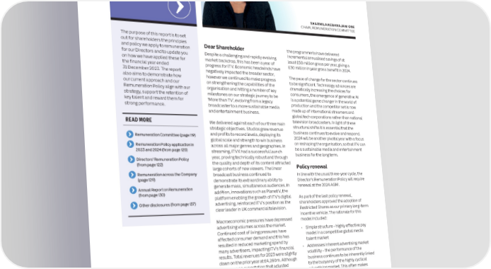 116 ITV plc Annual Report and Accounts 2023 ITV plc Annual Report and Accounts 2023 117 AUDIT AND RISK COMMITTEE REPORT CONTINUED G REMUNERATION REPORT O VE R NAN • Internal evaluation session: Drawing the Audit tender and rotation Committee conclusions and C above assessments together, and key to PwC was appointed as the external auditor confirmations E the determination of a high-quality audit, for ITV effective from 1 January 2021, In this report was a formal internal assessment session Fair, balanced and understandable following a formal competitive tender attended by the Committee members and process, including seeking investor views The Board is required to provide its opinion the Group CFO & COO. This session was and agreement. The current PwC lead audit on whether it considers that the Company’s informed by circulating in advance themes partner, Jonathan Lambert, has led the audit 2023 Annual Report and Accounts, taken for discussion, including the audit plan and since the beginning of PwC’s tenure at ITV. as a whole, are fair, balanced and strategy, execution of the agreed plan and The Company will put the external audit understandable, and provide the information conclusion, team performance and contract out to public tender at least every necessary for shareholders to assess the communications, firm-wide procedures ten years and will seek the rotation of the Company’s position and performance, (including resources, support and culture), audit partner in line with regulation and business model and strategy. and insights and the reporting PwC shared professional and ethical guidance. SHARMILA NEBHRAJANI OBE with the Committee. The Group CFO & The Committee discussed the preparation CHAIR, REMUNERATION COMMITTEE COO’s input to this session was informed The Company confirms that it has complied of the Company’s 2023 Annual Report and by a prior meeting with relevant members with the provisions of the CMA‘s Statutory Accounts with the Board. To support the of the finance team, and other relevant Audit Services for Large Companies Market Board in providing its opinion, the Committee The purpose of this report is to set teams, to ensure that feedback was Investigation (Mandatory Use of Competitive considered the assigned responsibilities for out for shareholders the principles obtained from all levels and divisions Tender Processes and Audit Committee content and overall cohesion and clarity of and policy we apply to remuneration Dear Shareholder the programme to have delivered of the Group that interacted with PwC. Responsibilities) Order 2014 for the financial the Annual Report and Accounts and for our Directors and to update you Despite a challenging and rapidly evolving incremental annualised savings of at The Committee spent time discussing year under review.assessed the quality of reporting through on how we have applied these for market backdrop, this has been a year of least £50 million gross per year, giving a the degree of challenge and robustness discussion with Management and the the financial year ended progress for ITV. Economic headwinds have £30 million in year gross benefit in 2024. of approach to the audit.Independence and objectivityexternal auditor. Specific areas of challenge 31 December 2023. The report negatively impacted the broader sector, included the presentation of exceptional also aims to demonstrate how however we continued to make progress The pace of change for the sector continues The assessments above enabled the In addition to the above assessment of the items, the equal prominence of GAAP and to be significant. Technology advances are effectiveness and quality of the audit, the our current approach and our on strengthening the capabilities of the Committee to conclude that PwC has non-GAAP financial measures within the Remuneration Policy align with our organisation and hitting a number of key dramatically increasing the choices for continued to provide a high-quality robust Committee seeks to assess and ensure the front half of the Annual Report and Accounts consumers, the emergence of generative AI objectivity and independence of the external strategy, support the retention of milestones on our strategic journey to be audit, which it conducted with rigour and and the description of going concern and key talent and reward them for ‘More than TV’, evolving from a legacy is a potential game changer in the world of effective and constructive challenge, auditor through:viability statement assumptions. production and the competitor set is now strong performance. broadcaster to a more sustainable media including questioning key accounting issues, • Focus on the assignment and rotation of and entertainment business. made up of international streamers and and exercising professional scepticism in its key personnelThe process included considering each global tech corporations rather than national review of management’s assumptions, • The adequacy of audit resourceof the elements (fair, balanced and READ MORE We delivered against each of our three main television broadcasters. In light of these judgements and assertions. understandable) on an individual basis to strategic objectives. Studios grew revenue structural shifts it is essential that the The Policy on the Independence and ensure ITV’s reporting was comprehensive and profits to record levels, deploying its business continues to evolve and respond. The Committee appreciated, in particular, in a clear and consistent way, and in Remuneration Commiee (page 119) 2024 will be another pivotal year with a focus Objectivity of External Auditors (approved in global scale and strength to win business the understanding of the business and the February 2024), which includes restrictions compliance with accounting standards and Remuneration Policy application in across all major genres and geographies. In on reshaping the organisation, so that ITV can regulatory and legal requirements 