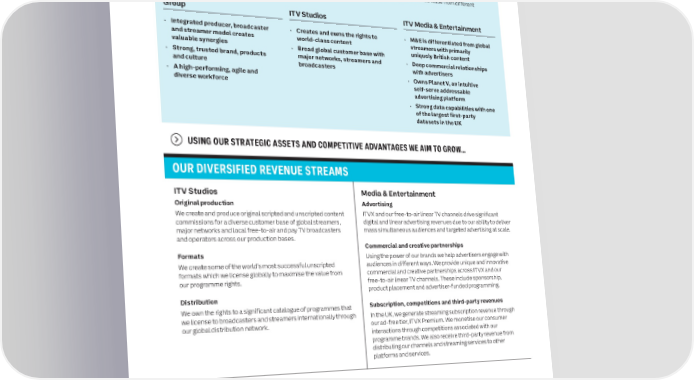 2 ITV plc Annual Report and Accounts 2023 ITV plc Annual Report and Accounts 2023 3 S T AN INTRODUCTION TO ITV AND ITS BUSINESS MODEL R A T E G I C R E WHO WE ARE OUR STRATEGIC ASSETS AND COMPETITIVE ADVANTAGES P O R T ITV is a vertically integrated producer broadcaster and streamer, ITV’s business model is based on a unique set of strategic assets and competitive advantages which enable us to grow our diversified consisting of ITV Studios and Media & Entertainment (M&E). revenue streams and create value for our shareholders. ITV TOTAL REVENUE By developing, owning, managing and distributing the rights to content, ITV can maximise the value of its programme brands across ITV Studios, Streaming and Broadcast. This ensures ITV is a more diversified business and enables it to drive value from different revenue models. ITV Studios M&E* Group ITV Studios ITV Media & Entertainment £2,170m £2,090m 1 * Includes £490 million of digital revenues (2022: £411 million)• Integrated producer, broadcaster • Creates and owns the rights to • M&E is differentiated from global (2022: £2,096m)(2022: £2,249m) and streamer model creates world-class content streamers with primarily valuable synergies • Broad global customer base with uniquelyBritish content • Strong, trusted brand, products major networks, streamers and • Deep commercial relationships and culture broadcasters with advertisers ** ITV GROUP ADJUSTED EBITA • A high-performing, agile and • Owns Planet V, an intuitive diverseworkforce self-serveaddressable advertisingplatform ITV StudiosM&E • Strong data capabilities with one of the largest first-party ** A full reconciliation between our adjusted and statutory datasets in the UK £286m £205m numbers is included in our APMs section (2022: £259m)(2022: £464m) USING OUR STRATEGIC ASSETS AND COMPETITIVE ADVANTAGES WE AIM TO GROW… 1. M&E digital revenue includes revenue from digital advertising, subscription, linear addressable advertising, digital sponsorship and commercial partnerships, ITV Win (digital competitions platform) and other revenues from digital business ventures OUR DIVERSIFIED REVENUE STREAMS OUR TWO DIVISIONS ITV Studios Media & Entertainment Originalproduction Advertising ITV StudiosMedia & Entertainment We create and produce original scripted and unscripted content ITVX and our free-to-air linear TV channels drive significant commissions for a diverse customer base of global streamers, digital and linear advertising revenues due to our ability to deliver ITV Studios is a scaled and global creator, owner and distributor ITV is the largest commercial broadcaster and streamer in the major networks and local free-to-air and pay TV broadcasters mass simultaneous audiences and targeted advertising at scale. of high-quality TV content. It operates in 13 countries, across over UK, delivering unrivalled audience scale and reach. M&E includes and operators across our production bases. 60 labels and has a global distribution network. It is diversified by Streaming and Broadcast through which we distribute content via Commercial and creative partnerships genre, geography and customer in the key creative markets ITVX, our free advertiser-funded streaming service, and via our Formats Using the power of our brands we help advertisers engage with around the world. free-to-air linear TV channels. Our content is also distributed on We create some of the world’s most successful unscripted audiences in different ways. We provide unique and innovative third-party partner platforms, such as Sky and Virgin.formats which we license globally to maximise the value from commercial and creative partnerships across ITVX and our ITV Studios is the largest producer in the UK, one of the largest our programme rights. free-to-air linear TV channels. These include sponsorship, unscripted producers in the US and one of the top three ITVX also includes a subscription tier, ITVX Premium, which product placement and advertiser-funded programming. producers in the majority of the international markets in which it provides subscribers with all of ITVX’s programming ad-free Distribution operates. ITV Studios has established relationships with key along with other exclusive content. We own the rights to a significant catalogue of programmes that Subscription, competitions and third-party revenues content buyers and leading creative talent in those markets; and we license to broadcasters and streamers internationally through In the UK, we generate streaming subscription revenue through with a combined content library of over 90,000 hours, it is also ITV offers advertisers a unique combination of mass our global distribution network. our ad-free tier, ITVX Premium. We monetise our consumer one of the pre-eminent global distributors.simultaneous reach, targeted advertising, and commercial and interactions through competitions associated with our creative partnerships, in a brand safe environment across ITVX programme brands. We also receive third-party revenue from and our linear TV channels. distributing our channels and streaming services to other platforms and services. Refer to the Operating and Financial Performance Review for further details on our divisions SUPPORTED BY OUR… 58% 19 12.5m 1,505m of revenue generated formats sold in 3+ monthly active users total streaming hours RISK MANAGEMENTFRAMEWORK outside the UK countries (2022: 10.5m)(2022: 1,192m) (2022: 60%)(2022: 19) ITV operates in an increasingly complex Management and the Board can adapt Our business model enables us to create business environment and our risk the strategy to ensure we are striking the value for all our key stakeholders, see page 32%37% 91%32.6% management framework provides the rightbalance between risk-takingandrisk 6 for further detail. business with the tools to identify, mitigation, that any underlying risks in the total revenue from of revenue from scripted of the top 1,000 commercial share of commercia