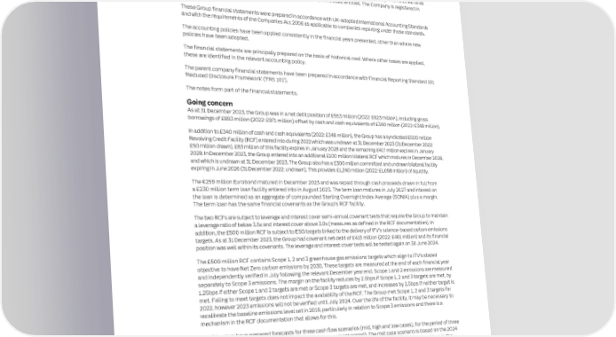 162 ITV plc Annual Report and Accounts 2023 ITV plc Annual Report and Accounts 2023 163 F I NOTES TO THE FINANCIAL STATEMENTS NAN SECTION 1: BASIS OF PREPARATION C I AL In this This section sets out the Group’s accounting policies that relate to the financial After considering the severe but plausible scenarios, the Group remains able to operate within its financial S T section statements as a whole. Where an accounting policy is specific to one note, the covenants and will have sufficient liquidity during the going concern period to 30 June 2025. A T policy is described in the note to which it relates. This section also shows new UK- E The Directors propose a final dividend of 3.3 pence per share (2022: 3.3 pence), which equates to a full year dividend M adopted accounting standards, amendments and interpretations, and whether they E N are effective in 2023 or later years. We explain how these changes are expected to of 5.0 pence per share, subject to approval by shareholders at the AGM on 2 May 2024. The Directors intend to at T impact the financial position and performance of the Group. least maintain this dividend over the medium term (this was included in all scenarios modelled). The Directors will S continue to balance shareholder returns with a commitment to maintain investment grade credit metrics over the medium term and to continue to invest in the Group’s strategy. The financial statements consolidate those of ITV plc (‘the Company’) and its subsidiaries (together referred to as the ‘Group’) and the Group’s interests in associates and jointly controlled entities. The Company is registered in Consequently, the Directors are confident that the Group will have sufficient funds to continue to meet its liabilities England and Wales. as they fall due for at least 12 months from the date of approval of these consolidated financial statements and therefore have prepared the consolidated financial statements on a going concern basis. These Group financial statements were prepared in accordance with UK-adopted International Accounting Standards and with the requirements of the Companies Act 2006 as applicable to companies reporting under those standards. Subsidiaries, joint ventures, associates and investments The accounting policies have been applied consistently in the financial years presented, other than where new Subsidiaries are entities that are directly or indirectly controlled by the Group. Control exists where the Group is policies have been adopted. exposed, or has rights to variable returns from its involvement with the investee and has the ability to affect those returns through its power over the investee. In assessing control, potential voting rights that are currently exercisable The financial statements are principally prepared on the basis of historical cost. Where other bases are applied, or convertible are taken into account. these are identified in the relevant accounting policy. A joint venture is a joint arrangement in which the Group holds an interest under a contractual arrangement where The parent company financial statements have been prepared in accordance with Financial Reporting Standard 101 the Group and one or more other parties undertake an economic activity that is subject to joint control. The Group ‘Reduced Disclosure Framework’ (‘FRS 101’). accounts for its interests in joint ventures using the equity method. Under the equity method, the investment in the entity is stated as one line item at cost plus the investor’s share of retained post-acquisition profits or losses, less The notes form part of the financial statements. any dividends received and other changes in net assets. Going concern An associate is an entity, other than a subsidiary or joint venture, over which the Group has significant influence. As at 31 December 2023, the Group was in a net debt position of £553 million (2022: £623 million), including gross Significant influence is the power to participate in, but not control or jointly control, the financial and operating borrowings of £893 million (2022: £971 million) offset by cash and cash equivalents of £340 million (2022: £348 million). decisions of an entity. These investments are also accounted for using the equity method. In addition to £340 million of cash and cash equivalents (2022: £348 million), the Group has a syndicated £500 million Investments are entities where the Group concludes it does not have significant influence and are held at fair value Revolving Credit Facility (RCF) entered into during 2022 which was undrawn at 31 December 2023 (31 December 2022: unless the investment is a start-up business, in which case it is valued initially at cost as a proxy for fair value. £50 million drawn). £83 million of this facility expires in January 2028 and the remaining £417 million expires in January 2029. In December 2023, the Group entered into an additional £100 million bilateral RCF which matures in December 2028, Current/non-current distinction and which is undrawn at 31 December 2023. The Group also has a £300 million committed and undrawn bilateral facility Current assets include assets held primarily for trading purposes, cash and cash equivalents, and assets expected to expiring in June 2026 (31 December 2022: undrawn). This provides £1,240 million (2022: £1,098 million) of liquidity. be realised in, or intended for sale or use in, the course of the Group’s operating cycle. All other assets are classified as non-current assets. The €259 million Eurobond matured in December 2023 and was repaid through cash proceeds drawn in full from a £230 million term loan facility entered into in August 2023. The term loan matures in July 2027 and interest on Current liabilities include liabilities held primarily for trading purposes, liabilities expected to be settled in the course the loan is determined as an aggregate of compounded Sterling Overnight Index Average (SONIA) plus a margin. o