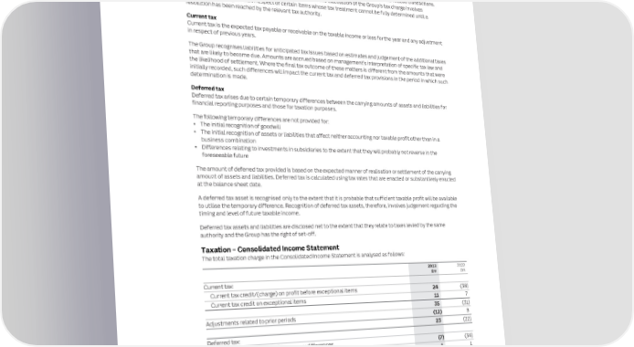 174 ITV plc Annual Report and Accounts 2023 ITV plc Annual Report and Accounts 2023 175 F I NOTES TO THE FINANCIAL STATEMENTS NAN SECTION 2: RESULTS FOR THE YEAR CONTINUED C I AL 2.3 Keeping This section sets out the Group’s tax accounting policies, the current and deferred tax In order to understand how, in the Consolidated Income Statement, a tax credit of £16 million (2022: £66 million S T it simple charges or credits in the year (which together make up the total tax charge or credit in charge) arises on a profit before tax of £193 million (2022: £501 million), the taxation charge that would arise at the A Taxation T the Consolidated Income Statement), a reconciliation of profit before tax to the tax standard rate of UK corporation tax is reconciled to the actual tax credit as follows: E M charge for the year and the movements in deferred tax assets and liabilities. E 2023 2022 N T £m £m S Accounting policies Profit before tax 193 501 The tax charge for the year is recognised in the Consolidated Income Statement, the Consolidated Statement of Notional taxation charge at UK corporation tax rate of 23.5% (2022: 19%) on profit Comprehensive Income and directly in equity, according to the accounting treatment of the related transactions. before tax (45) (95) The tax charge comprises both current and deferred tax. The calculation of the Group’s tax charge involves Non-taxable income/non-deductible expenses (10) (15) estimation and judgement in respect of certain items whose tax treatment cannot be fully determined until a Prior year adjustments (14) 4 resolution has been reached by the relevant tax authority. Other taxes (8) (8) Current tax Previously unrecognised deferred tax assets 6 – Current tax is the expected tax payable or receivable on the taxable income or loss for the year and any adjustment Current year losses not recognised (17) (8) in respect of previous years. Impact of overseas tax rates 2 (1) The Group recognises liabilities for anticipated tax issues based on estimates and judgement of the additional taxes Impact of changes in tax rates 1 (6) that are likely to become due. Amounts are accrued based on management’s interpretation of specific tax law and Movement on tax provisions (1) (1) the likelihood of settlement. Where the final tax outcome of these matters is different from the amounts that were Production tax credits 102 64 initially recorded, such differences will impact the current tax and deferred tax provisions in the period in which such Statutory taxation credit/(charge) in the Consolidated Income Statement 16 (66) determination is made. Non-deductible expenses are expenses that are not expected to be allowable for tax purposes. Similarly, non- Deferred tax taxable income is income that is not expected to be taxable. Deferred tax arises due to certain temporary differences between the carrying amounts of assets and liabilities for financial reporting purposes and those for taxation purposes. Adjustments to prior periods primarily arise where an outcome is obtained on certain tax matters, which differs from expectations held when the related provision was made. Where the outcome is more favourable than the provision The following temporary differences are not provided for: made, the difference is released, lowering the current year tax charge. Where the outcome is less favourable than our • The initial recognition of goodwill provision, an additional charge to current year tax will occur. The total current tax credit of £23 million (2022: £22 • The initial recognition of assets or liabilities that affect neither accounting nor taxable profit other than in a million charge) includes a £12 million charge (2022: £9 million credit) relating to prior years, and the deferred tax business combination charge of £7 million (2022: £44 million charge) includes a £2 million charge (2022: £5 million charge) relating to prior • Differences relating to investments in subsidiaries to the extent that they will probably not reverse in the years. This adjustment has arisen following changes in estimates of taxes that have already become due, or will foreseeable future become due in the future. The amount of deferred tax provided is based on the expected manner of realisation or settlement of the carrying Other taxes of £8 million charge (2022: £8 million charge) includes state taxes of £3 million in the US, local taxes of amount of assets and liabilities. Deferred tax is calculated using tax rates that are enacted or substantively enacted £1 million in Italy and France plus £4 million of irrecoverable withholding tax in the UK. at the balance sheet date. A previously unrecognised deferred tax asset of £6 million relating to historical capital losses, has been recognised A deferred tax asset is recognised only to the extent that it is probable that sufficient taxable profit will be available in 2023, as they will be utilised against the capital profits realised on the sale of BritBox International, announced to utilise the temporary difference. Recognition of deferred tax assets, therefore, involves judgement regarding the on 1 March 2024. timing and level of future taxable income. The tax impact of current year losses not recognised is £17 million (2022: £8 million), this relates to £2 million in Deferred tax assets and liabilities are disclosed net to the extent that they relate to taxes levied by the same Australia, £1 million in France, £13 million in Italy and £1 million in other overseas jurisdictions. No deferred tax on authority and the Group has the right of set-off. these losses has been recognised as we do not have certainty over future taxable profits in those jurisdictions nor are they suitable taxable temporary differences against which the losses can unwind. Taxation – Consolidated Income Statement The total taxation charge in the Consolidated Income Statement is analysed as follows: The impact of overseas tax rates reflects t