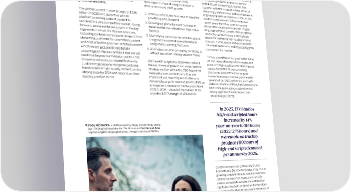 20 ITV plc Annual Report and Accounts 2023 ITV plc Annual Report and Accounts 2023 21 S OPERATING AND FINANCIAL PERFORMANCE REVIEW CONTINUED T R A T E G I ITV Studios benefits from scale, being the Over the last six years ITV Studios revenue Growing our C R largest producer in the UK, one of the (excluding acquisitions) has grown by around E P largest unscripted producers in the US and 5% CAGR, faster than the market of around O scripted business R one of the top three in the majority of the 4% CAGR (Source: Ampere Analysis – based T remaining international markets in which it on the ITVS addressable market). Growing our scripted business is operates. ITV Studios is a trusted supplier ITV with well established relationships with ITV Studios’ ambition is to be a leading force one of our key strategic priorities key content buyers and leading creative in the creation and ownership of intellectual Scripted content plays a key role in attracting talent in those markets; and with a property (IP), global content production and and retaining viewers and subscribers on combined content library of over 90,000 distribution. We are achieving this by both FTA and streaming platforms. This hours, it is also one of the pre-eminent focusing on our four strategic priorities to together with the increase in the number of global distributors. drive revenue and profit growth: streaming platforms has led to an increase in original scripted commissions in the UK, US, STUDIOS The global content market is large, (c.$226 1. Growing our scripted business to meet the Australia and Europe. Furthermore, over billion in 2023) and attractive with all growth in global demand recent years there has been increasing platforms needing a mix of content to 2. Growing our global formats business to demand for locally produced non-English succeed in a very competitive market. Going maximise the monetisation of high-value language scripted content. With our global forward, we expect to see growth in the key formats production presence and a strong track segments in which ITV Studios operates, 3. Diversifying our customer base to capture record for delivering high-quality scripted including content licensing and demand from the growth in content spend from local content, ITV Studios is well-positioned to streaming platforms for unscripted content and global streaming platforms cater to this demand, and importantly grow and cost effective premium scripted content its share of the market. which we are well positioned to take 4. All of which is underpinned by our ability to advantage of. We are confident that we will attract and retain leading creative talent. ITV has a portfolio of scripted labels in the continue to grow our market share to 2026 UK and internationally, which creates and driven by our scale; our diversification by We have KPI targets for 2026 which reflect produces high-quality content with global customer; geography and genre; a strong the key drivers of growth and value. See the appeal for both FTA and streaming track record of high-quality content; a very Strategy section within the CEO Report for platforms. We continue to see good strong slate for 2024 and beyond; and our more details on our KPIs, why they are momentum in our creative pipeline with leading creative talent. important and how they will enable us to several of our 2023 deliveries, such as Mr deliver total organic revenue growth of 5% on Bates vs The Post Office, Fool Me Once and average per annum over the five years from One Piece gaining global attention and 2021 to 2026 – ahead of the market, at an driving significant audiences on their adjusted EBITA margin of 13% to 15%. respective platforms. In 2023, ITV Studios high‑end scripted hours increased by 14% FOOL ME ONCE is a thriller made by Quay Street Productions year‑on‑year to 316 hours (an ITV Studios label) for Netflix. It is one of Netflix’s all-time top ten English language dramas. Image courtesy of Netflix. (2022: 276 hours) and we remain on track to produce 400 hours of high‑end scripted content per annum by 2026. ITV Studios is a scaled and global creator, owner and distributor Global Partnerships (previously Global of high-quality TV content operating in 13 countries and across Formats and Distribution) plays a key role in 60+ labels; diversified by genre, geography and customer in the growing scripted value across the business. Global Partnerships invests around £70 key creative markets around the world. million annually to acquire the distribution rights (across both scripted and unscripted genres) in ITV Studios-produced content and selective third-party content. Having the integrated producer-distributor relationship enables Global Partnerships to make strategic investment decisions around content funding. By finding co-production partners and licensees around the world for our scripted catalogue (of more than 22,000 ONE PIECE is based on a hours), Global Partnerships maximises the Japanese manga series and value of these projects over a long-term produced by Tomorrow Studios in the US (a partnership with sales lifecycle. ITV Studios) for Netflix. It has been recommissioned for a second season. Image courtesy of Netflix.