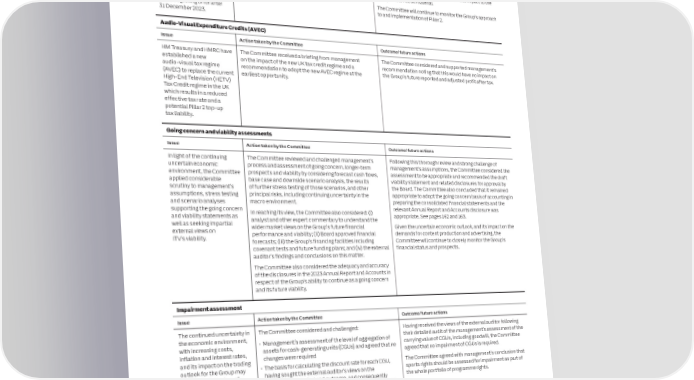 110 ITV plc Annual Report and Accounts 2023 ITV plc Annual Report and Accounts 2023 111 AUDIT AND RISK COMMITTEE REPORT CONTINUED G O VE R NAN C OTHER SIGNIFICANT ISSUES IMPACTING FY23 AND/OR FUTURE YEARS OTHER SIGNIFICANT ISSUES IMPACTING FY23 AND/OR FUTURE YEARS E Acquisitions and related liabilities Organisation for Economic Co-operation and Development (OECD) Base Erosion Profit Shifting (BEPS 2.0) Agreement – Pillar 2 IssueAction taken by the CommitteeOutcome/future actionsIssueAction taken by the Committee Outcome/future actions Acquisition liabilities are The Committee reviewed management’s process to The Committee agreed with management’s assessment The UK substantively The Committee received a briefing on the anticipated The Committee concluded that management was in a good amounts payable to former determine the expected future payments and the related of expected future payments for Plimsoll and other previous enacted Finance (No2) Act financial and compliance impact of Pillar 2, informed position to perform accurate and detailed Pillar 2 calculations owners of businesses year end liability, including the classification of those costs acquisitions.2023 in June 2023 by advice from professional advisers engaged to assist in 2024 and was comfortable that the financial impact to the acquired for remaining linked to employment as exceptional. The Committee was pleased to note that the integration introducing a global minimum management in navigating the detailed and Group would not be material. minority shareholdings. In 2022 the Group acquired a majority stake in Plimsoll of Plimsoll with ITV had been successful, including adoption effective tax rate of 15% for complex legislation.The Committee will continue to monitor the Group’s approach The payments are linked to Productions. During 2023, the Committee considered of ITV’s policies, a good controls environment and ongoing large groups and for financial to and implementation of Pillar 2. the financial and/or management’s post-acquisition review and, in light of the transition to ITV corporate network and systems. years beginning on or after operating performance of review, the appropriateness of the anticipated future 31 December 2023. the business over future payments. In addition, the Committee reviewed the periods and are usually conclusions of EY’s internal audit of Plimsoll’s production Audio-Visual Expenditure Credits (AVEC) linked to continued financial controls and compliance with ITV’s Group policies. employment. Issue Action taken by the Committee Outcome/future actions HM Treasury and HMRC have The Committee received a briefing from management The Committee considered and supported management’s Pensions risk managementestablished a new on the impact of the new UK tax credit regime and a recommendation noting that this would have no impact on IssueAction taken by the CommitteeOutcome/future actionsaudio-visual tax regime recommendation to adopt the new AVEC regime at the the Group’s future reported and adjusted profit after tax. (AVEC) to replace the current earliest opportunity. Managing the impact of The Committee received an update on the management of The Committee noted the update and was confident that High-End Television (HETV) economic turbulence in the the Group’s pension risks, with a focus on investment the actions taken meant that the risks identified continued Tax Credit regime in the UK year on the investment governance and strategy. Strong risk management and to be managed and maintained as previously agreed with which results in a reduced strategy of the ITV Pension maintaining the risk exposure in balance were fundamental the Committee. effective tax rate and a Scheme and the valuation of objectives.potential Pillar 2 top-up pension assets and liabilities.tax liability. Treasury and financial risk managementGoing concern and viability assessments IssueAction taken by the CommitteeOutcome/future actionsIssueAction taken by the Committee Outcome/future actions During 2023 the Committee The Committee reviewed the Group’s debt maturity profile The Committee considered, supported and approved In light of the continuing The Committee reviewed and challenged management’s Following this thorough review and strong challenge of considered updates from and the options to address the short-term refinancing needs management’s proposed policy changes and the actions uncertain economic process and assessment of going concern, longer-term management’s assumptions, the Committee considered the management on the impact of the business, with a term loan from relationship banks taken to mitigate other financial risk.environment, the Committee prospects and viability by considering forecast cash flows, assessment to be appropriate and recommended the draft of financial risks affecting being proposed. Subsequently, an assessment was The Committee also recommended to the Board the applied considerable base case and downside scenario analysis, the results viability statement and related disclosures for approval by the business.considered on management of the longer-term financing approval of the financing proposals of management to scrutiny to management’s of further stress testing of those scenarios, and other the Board. The Committee also concluded that it remained requirements, which included a proposal to implement an ensure the Group retains appropriate liquidity to support assumptions, stress testing principal risks, including continuing uncertainty in the appropriate to adopt the going concern basis of accounting in Euro Medium Term Note programme (during H1 2024).delivery of the Group’s strategy, particularly in the current and scenario analyses macro environment. preparing the consolidated financial statements and the The annual review of treasury policies focused on mitigation uncertain and volatile economic and political environment.supporting the going concern In reaching its vie