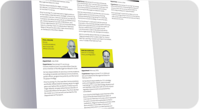 80 ITV plc Annual Report and Accounts 2023 ITV plc Annual Report and Accounts 2023 81 MANAGEMENT BOARD CONTINUED G CORPORATE GOVERNANCE O VE R NAN KYLA MULLINS ADE RAWCLIFFE SIMON The wrien responsibilities of the Chair, Senior Independent C General Counsel and Group Director of FARNSWORTH E Company Secretary Diversity and Chief Technology Director and Chief Executive are available on the ITV plc website: Inclusion Officer www.itvplc.com OUR GOVERNANCE STRUCTURE Appointed: January 2019 Appointed: September 2020 Appointed: January 2024 Experience: Kyla joined ITV as General Counsel Experience: Ade joined ITV as Head of Diversity Experience: Simon joined ITV as Chief Technology and Company Secretary and member of the Commissioning in 2017. She was later promoted to officer and member of the Management Board in Management Board in 2019. Director of Creative Diversity, before taking on the January 2024. He has overall responsibility for role of Group Director of Diversity and Inclusion technology strategy and implementation The PLC Board She has responsibility for legal, company and joining the Management Board in 2020. secretariat, compliance and regulatory matters Prior to joining ITV, he served as News UK’s EVP, Responsible for providing leadership to the Group’s business, including setting the Group’s purpose, strategy and values and promoting its across the ITV Group. Ade has responsibility for all diversity and inclusion Chief Technology Officer and prior to that held key long‑term sustainable success. Prior to joining ITV, Kyla held senior legal positions related matters across the Group, including roles at Discovery Globecast Australia and Telstra in the media, entertainment, strategic outsourcing leading, developing and growing ITV’s Diversity, Broadcast Services. and aviation sectors. She was General Counsel and Equity and Inclusion strategy on and off screen. Company Secretary at easyJet plc and Mitie Group Prior to joining ITV, Ade spent over ten years at PLC Board Committees plc; Global General Counsel of EMI Music; and Channel 4, most recently leading Creative Diversity, The terms of reference for each Committee are documented and agreed by the PLC Board. These terms of reference are reviewed annually Group Legal Director at ITV plc and Granada Media. where she supported and nurtured the careers of and are available on our website: www.itvplc.com/investors/governance/terms‑of‑reference. Kyla is currently Chair of Independent Television diverse creative talent and sought out and News (ITN) and is also a Non-executive Director commissioned a slate of developments which on the Board of Northern Ballet. encouraged diversity, risk-taking and innovation. Ade is currently a Board Member of Independent Nominations Remuneration Audit and Risk Disclosure Our Ambassador Television News (ITN) Trustee of BAFTA, Chair of Committee Committee Committee Committee Network BAFTA’s Learning, Inclusion and Talent Committee, See the See the See the Audit and Risk Committee Consists of the Chair of Discusses and PAUL MOORE and a Trustee of the National Trust. Nominations Remuneration Report. the Board, Chief inputs into Group Committee Report. Executive, Audit and Risk significant Communications Report. Committee Chair, Group proposals and and Corporate CFO & COO, and General initiatives Affairs Director MAGNUS BROOKE Counsel and Company impacting our Director of Strategy, Secretary. The Director colleagues. of Investor Relations Policy and Regulation Our designated Duty of Care Operating Board also attends meetings. Workforce The Committee assists Engagement Consisting of key Management Board the Company in meeting Appointed: July 2018 members, including the Chief its disclosure Director reports Executive and the independent Chief obligations, and reviews back to the Board Experience: Paul joined ITV as Group on the Network’s Communications and Corporate Affairs Director Psychological Officer. The Operating and approves regulatory Board oversees the Group’s duty of and other activities and his and a member of the Management Board in 2018. engagement with Appointed: February 2021 care processes on screen and across announcements before He has responsibility for all Group communications ITV, monitors and assesses the publication but post the the Network. including corporate and internal communications, Experience: Magnus joined ITV in 2006 and processes in place to ensure they Board’s approval given public affairs, programme publicity and the Social was promoted to the Management Board in continue to be effective and evolve subject to final agreed Purpose strategy. February 2021. as necessary. The Operating Board changes. Prior to joining ITV, Paul was the Communications He has Board responsibility for ITV’s strategy, meetings are chaired by the Chief and Public Affairs Director at easyJet plc for eight policy and regulatory teams, which includes Executive, and the Audit and Risk years and before this worked for FirstGroup and overseeing ITV’s corporate strategy development Committee Chair attends on behalf Virgin Atlantic Airways where he was Director of and leading on interaction with UK and European of the Board. Corporate Affairs for ten years. Paul first started regulators, government and parliamentary his career as a civil servant and worked for the committees. Department of Transport. Chief Executive From 2014 to 2019 Magnus was Chairman of the Board of the Brussels based Association of Responsible for the day‑to‑day running of the Group’s business and performance, the development and implementation of strategy and Commercial Television in Europe, which represents promoting our culture and standards. Europe’s commercial broadcasters to the EU institutions. Magnus is a Director and Chair of the Remuneration Committee of Everyone TV (formerly DUK) which runs the Freeview and Management Board Freesat platforms and he was a Non-executive Led by the Chief Executive,