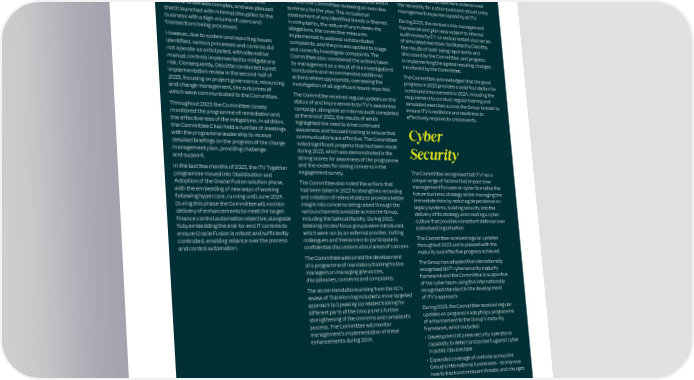112 ITV plc Annual Report and Accounts 2023 ITV plc Annual Report and Accounts 2023 113 AUDIT AND RISK COMMITTEE REPORT CONTINUED G O VE R NAN C RISK MANAGEMENT AND INTERNAL CONTROLSITV Speaking Crisis E Our roleCommittee reviewed: • Assist the Board to establish and articulate overall risk • Biannually, management’s conclusions regarding principal and emerging risks and Together Upanagement M appetite and oversee and advise the Board on specific uncertainties and associated mitigations strategic risk exposures and mitigations• Progress in implementing the enhanced ERM framework, including enhancements to the Oracle Fusion went live on 11 April 2023, The Board continued to receive regular reports Over the past year, a series of significant • Review the risk identification and mitigation processes and risk governance structurechanging the operations and interaction of on issues raised during 2023 via Safecall, the external, non-ITV specific incidents and the undertake deep dives into high-risk business areas or • Progress in improving operational risk management capability for security, duty of care, and colleagues, HR, Finance and Production independent whistleblowing facility, and other evolving global landscape have underscored processescrisis management Finance processes. complaint notification channels available within the necessity for a structured and robust crisis • Review the effectiveness of the internal control and risk • Insurance arrangements and policies, including how those support mitigation of principal The Committee noted that a change of this ITV, with the Committee reviewing an overview management response capability at ITV. management processesand other financial risksnature and size was complex, and was pleased summary for the year. This included an During 2023, the revised crisis management • Oversee appropriate compliance, speaking up and fraud that it launched with minimal disruption to the assessment of any identified trends or themes framework and plan was subject to internal • Progress in implementing the financial controls framework and effectiveness review for the in complaints, the nature of any noteworthy prevention arrangementsITV Together programmebusiness with a high volume of users and audit review by EY, as well as tested via a series transactions being processed. allegations, the corrective measures of simulated exercises facilitated by Deloitte, • Ongoing programme of improvements to technology and IT-related controls and implemented to address substantiated governance environment However, due to system and reporting issues complaints, and the process applied to triage the results of both being reported to and identified, various processes and controls did and correctly investigate complaints. The discussed by the Committee, and progress • Mapping of the internal audit plan to key principal and operational risk areas to understand in implementing the agreed resulting changes assurance coverage not operate as anticipated, with alternative Committee also considered the actions taken monitored by the Committee. • Outcome of the risk focused audits undertaken by the internal auditors, including manual controls implemented to mitigate any by management as a result of the investigations’ implementation of agreed actions to address audit conclusions risk. Consequently, Deloitte conducted a post conclusions and recommended additional The Committee acknowledged that the good implementation review in the second half of actions where appropriate, overseeing the progress in 2023 provides a solid foundation for • Enhancements to the Speaking Up policy and report on ongoing actions taken to 2023, focusing on project governance, resourcing investigation of all significant issues reported. continued improvement in 2024, including the strengthen Speaking Up processes and further increase awareness across the organisation, and change management, the outcomes of requirement to conduct regular training and including reflection of the relevant recommendations arising from the Committee’s deep which were communicated to the Committee.The Committee received regular updates on the simulated exercises across the Group in order to dive review in July 2023 and the external review by Jane Mulcahy KC status of and improvements to ITV’s awareness ensure ITV’s resilience and readiness to • Progress in implementation of data privacy and governance enhancements, including Throughout 2023 the Committee closely campaign, alongside an internal audit completed effectively respond to crisis events. actions arising from the internal audit of the effectiveness of relevant processes monitored the programme of remediation and at the end of 2022, the results of which the effectiveness of the mitigations. In addition, highlighted the need to drive continued • Biannually, effectiveness of compliance framework and monitoringthe Committee Chair held a number of meetings awareness and focused training to ensure that Cyber • The M&A approvals process and approved amendmentswith the programme leadership to receive communications are effective. The Committee • Fraud risk and fraud prevention, detection and controls framework and its effectiveness detailed briefings on the progress of the change noted significant progress that had been made • Transformation Programme updates, particularly in respect of ITV Togethermanagement plan, providing challenge during 2023, which was demonstrated in the Security and support. strong scores for awareness of the programme • Deep dives on the Group’s resilience to key risks, including cyber, crisis management, and the routes for raising concerns in the duty of care and Speaking UpIn the last few months of 2023, the ITV Together engagement survey. The Committee recognises that ITV has a • The internal audit conclusions and recommendations regarding the effectiveness and programme moved into Stabilisation and unique 