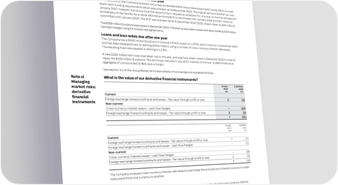 234 ITV plc Annual Report and Accounts 2023 ITV plc Annual Report and Accounts 2023 235 F I NOTES TO THE ITV PLC COMPANY FINANCIAL STATEMENTS CONTINUED NAN C I AL The Directors manage the Group’s capital structure as disclosed in section 4 to ch which allows the recognition of the value of S Under IFRS 9, the Company has adopted the ‘cost of hedging’ approa Note v Keeping T it simple the consolidated financial statements. Borrowings, cash and derivative financial the currency basis at inception of the hedge to be recorded on the Statement of Financial Position and amortised A Net debt T instruments are mainly held by ITV plc and disclosed in these Company through net financing costs in the Income Statement over the life of the bond. Any mark-to-market change in fair E M financial statements. value of the currency basis is recognised in ‘cost of hedging’ in the Statement of Comprehensive Income. E N T Undiscounted financial liabilities S Cash and cash equivalents The Company is required to disclose the expected timings of cash outflows for each of its derivative financial liabilities. At 31 December 2023, the Company has a cash position of £226 million (2022: £197 million). The amounts disclosed in the table are the contractual undiscounted cash flows (including interest), so will not always reconcile with the amounts disclosed on the Statement of Financial Position. Loans and facilities due within one year Total In January 2022, the Company entered into a new syndicated £500 million Revolving Credit Facility (RCF) to meet Carrying contractual Less than Between Between short-term funding requirements which was undrawn at 31 December 2023. The original terms of the RCF ran until value cash flows 1 year 1 and 2 years 2 and 5 years Over 5 years January 2027; however, the Group took the opportunity to request an extension for one year on the first and second At 31 December 2023* £m £m £m £m £m £m anniversary of the facility. As a result, £83 million of the RCF is committed until January 2028 and £417 million is Non-current and current committed until January 2029. The RCF was undrawn as at 31 December 2023 (2022: drawn-down by £50 million). Cross-currency swaps – cash flow hedges The €259 million Eurobond was repaid in December 2023. The sterling-equivalent repayment value, totalling £233 million, Inflow – 542 7 7 528 – had been hedged using FX forward rate agreements. Outflow (15) (580) (16) (16) (548) – Loans and loan notes due after one year Foreign exchange forward contracts The Company has a €600 million Eurobond in issue at a fixed coupon of 1.375%, which matures in September 2026 and swaps – fair value through profit and has been swapped back to sterling (£533 million) using a number of cross-currency interest rate swaps. or loss The resulting fixed rate payable in sterling is c.2.9%. Inflow 7 614 514 100 – – Outflow (6) (614) (514) (100) – – A new £230 million term loan was taken out in the year, and was fully drawn-down in December 2023 in order to (14) (38) (9) (9) (20) – repay the €259 million Eurobond. The term loan matures in July 2027. Interest on the loan is determined as an aggregate of compounded SONIA plus a margin. See section 4.1 of the Group Notes for further details of borrowings and available facilities. Total Carrying contractual Less than Between Between value cash flows 1 year 1 and 2 years 2 and 5 years Over 5 years Note vi What is the value of our derivative financial instruments? At 31 December 2022* £m £m £m £m £m £m Managing Non-current and current Assets Liabilities Foreign exchange forward contracts market risks: 2023 2023 and swaps – cash flow hedges derivative £m £m financial Current Inflow – 233 233 – – – instruments Foreign exchange forward contracts and swaps – fair value through profit or loss 5 (5) Outflow (1) (236) (236) – – – Non-current Cross-currency swaps – cash flow Cross-currency interest swaps – cash flow hedges – (15) hedges Foreign exchange forward contracts and swaps – fair value through profit or loss 2 (1) Inflow – 560 7 7 546 – 7 (21) Outflow (8) (596) (16) (16) (564) – Foreign exchange forward contracts and swaps – fair value through profit Assets Liabilities 2022 2022 or loss £m £m Inflow 9 570 403 136 31 – Current Outflow (9) (570) (403) (136) (31) – Foreign exchange forward contracts and swaps – fair value through profit or loss 7 (7) (9) (39) (12) (9) (18) – Foreign exchange forward contracts and swaps – cash flow hedges – (1) Non-current * The Company is jointly and severally liable for VAT at 31 December 2023 of £43 million (31 December 2022: £35 million) Cross-currency interest swaps – cash flow hedges – (8) Foreign exchange forward contracts and swaps – fair value through profit or loss 2 (2) Allotted, issued Allotted, issued 9 (18) Note vii and fully paid and fully paid Share capital 2023 2022 The Company employs cross-currency interest rate swaps to exchange the principal and interest coupons in a debt £m £m instrument from one currency to another. Allotted, issued and fully paid ordinary shares of 10 pence each 406 403 Currency risk Total 406 403 The Company’s foreign exchange policy is to use forward foreign exchange contracts and cross-currency interest The Company’s ordinary shares give shareholders equal rights to vote, receive dividends and to the repayment of capital. rate swaps both to manage foreign currency cash flow timing differences and to hedge foreign currency denominated monetary items. The Company issued 27 million ordinary shares in the year to the ITV Employees’ Benefit Trust (EBT) to satisfy the share-based compensation awards. See note 4.8 for further details. Cash flow hedges In order to fix the sterling cash outflows associated with the commitments and interest payments – which are mainly denominated in euros – the Company has taken out forward foreign exchange contracts and cross-