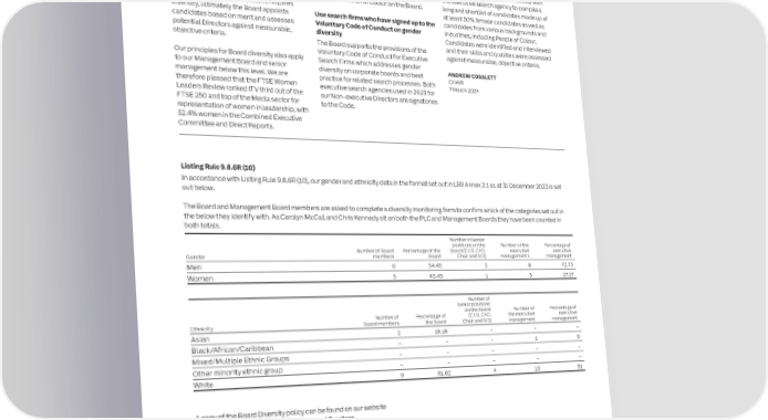 104 ITV plc Annual Report and Accounts 2023 ITV plc Annual Report and Accounts 2023 105 NOMINATIONS COMMITTEE REPORT CONTINUED G O VE R NAN Board searchesSet out below are the objectives of our Maintain at least 30% female Directors on Maintain at least 10% Directors who are Ensure the Non-executive Director search C BOARD DIVERSITYThe Committee approved the appointment Board Diversity Policy and our assessment the Board over the short to medium termPeople of Colour on the Board over the pool is sufficiently wide and covers E of SRI/Mission Bay for the search for a of performance against them. These As at 31 December 2023, the Board had short to medium term candidates who are People of Colour and 45.45% Non‑executive Director with specialised objectives ensure that both appointments 45.45% female representation, including one As at 31 December 2023, the Board had candidates with a wide range of expertise, creative industry skills experience and Lygon and succession planning support the Executive Director and two Committee 18.18% representation of People of Colour skills and backgrounds, and that shortlists female Board representationGroup for the search for a Non‑executive development of a diverse pipeline. Chairs. We have therefore exceeded the with two Directors represented on the Board. include at least 50% female candidates In line with Parker Review, the Listing Director with financial expertise. Other than target of 40% of women on the Board set by We therefore also comply with the When conducting a Non-executive Director the provision of search services, neither SRI/Ensure ITV has a development pipeline of ITV and the FCA Listing Rules, as well as the recommendation of the Parker Review and search, the Committee works closely with Rules and Hampton‑Alexander Review Mission Bay or Lygon Group have any other high calibre senior executive candidates Hampton-Alexander target of 33%. Whilst the FCA Listing Rule requirement to have at the executive search agency to compile a recommendationsconnection with the Company or any and encourage senior executives to obtain the Board recognises that an effective Board least one director of colour on the Board. long and shortlist of candidates made up of individual director. SRI/Mission Bay had external board experiencewith broad strategic perspective requires at least 50% female candidates as well as 18.18% previously supported the recruitment of The ongoing development of senior leaders, diversity, ultimately the Board appoints Use search firms who have signed up to the candidates from various backgrounds and Non‑executive Directors to the Board. to ensure we retain the best talent to candidates based on merit and assesses Voluntary Code of Conduct on gender industries, including People of Colour. People of Colour Board representationbroaden their skill sets and experience to potential Directors against measurable, diversity Candidates were identified and interviewed The specifications for both vacancies set prepare them for future senior roles, is objective criteria. The Board supports the provisions of the and their skills and qualities were assessed out the agreed key skills, experience and important to us. ITV runs a high potential Voluntary Code of Conduct for Executive against measurable, objective criteria. Board composition and character profile being sought to fit with the leadership programme, building a pipeline of Our principles for Board diversity also apply Search Firms which addresses gender succession planningcurrent balance, membership and dynamics diverse talent for senior level roles. The Rise to our Management Board and senior diversity on corporate boards and best ANDREW COSSLETT of the Board and were approved by the Programme launched in 2020 continues to management below this level. We are practice for related search processes. Both CHAIR CompositionCommittee. As in prior years, the Committee promote People of Colour talent progression therefore pleased that the FTSE Women 7 March 2024 During the year, the Committee undertook executive search agencies used in 2023 for focused on diversity as part of the selection at the manager level by providing People of Leaders Review ranked ITV third out of the our Non-executive Directors are signatories an analytical review of Board composition, criteria, selecting the highest calibre Colour colleagues greater visibility with FTSE 250 and top of the Media sector for to the Code. assessing the range and balance of skills, candidates for appointment to the Board, senior leaders through networking and representation of women in leadership, with experience, diversity, knowledge and based on merit and objective criteria. sponsorship, alongside career coaching. 52.4% women in the Combined Executive independence to identify any gaps and inform The programme also works with managers Committee and Direct Reports. the Non‑executive Director searches. The In each case a shortlist of candidates was and Senior Leadership Team advocates to review concluded that the representation of interviewed by all the members of the build race confidence and accelerate an Board diversity was strong and the Directors Nominations Committee (led by the inclusive culture change at ITV. as a whole had the right skills, knowledge and Chairman), the Chief Executive and Group experience to enable ITV to execute its CFO and COO. Following this, the Committee Bespoke development initiatives are in Listing Rule 9.8.6R (10) strategy. However, the departure of Sir Peter recommended the appointments of Marjorie place for senior executives who have been In accordance with Listing Rule 9.8.6R (10), our gender and ethnicity data in the format set out in LR9 Annex 2.1 as at 31 December 2023 is set Bazalgette in 2022 meant there was a Kaplan and Dawn Allen, which the Board identified as potential successors, based out below. requirement for specialised creative industry subsequently approved. on particular development 