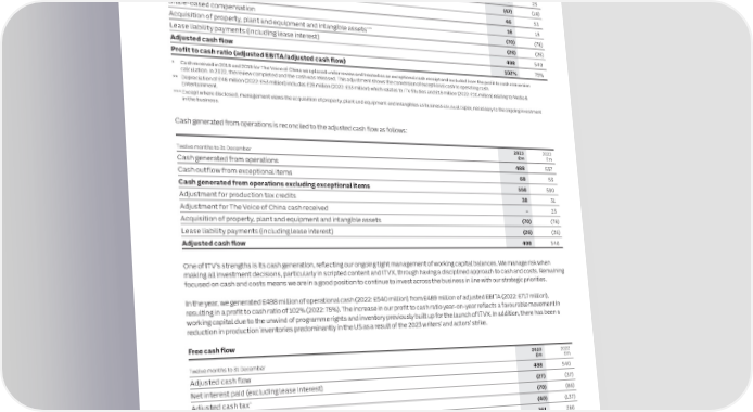 48 ITV plc Annual Report and Accounts 2023 ITV plc Annual Report and Accounts 2023 49 S FINANCE REVIEW CONTINUED T R A T E G I Tax strategyStatutory EPS decreased by 51% to 5.2p We have generally structured our deals with Cash generation C R (2022: 10.7p).earnouts or with put and call options in place E ITV is a responsible business, and we take a Profit to cash conversion P for the remainder of the equity, capping the O responsible attitude to tax, recognising that R it affects all of our stakeholders. To allow A full reconciliation between statutory and maximum consideration payable by basing a 2023 2022 T adjusted EPS is included in the Alternative significant part of the consideration on Twelve months to 31 December £m £m those stakeholders to understand our Adjusted EBITA 489 717 approach to tax, we have published our Performance Measures section.future performance. This has allowed us to Global Tax Strategy, which is available on lock in creative talent and ensure our Working capital movement 90 (150) our corporate website.Dividend per shareincentives are aligned, and also reduce our Adjustment for The Voice of China cash received* – 23 The Board recognises the importance of the risk by only paying for the actual, not expected, performance delivered over time. Adjustment for production tax credits (47) (18) www.itvplc.com/investors/ ordinary dividend to ITV shareholders. ** governance/policiesReflecting its confidence in the business and Depreciation 46 53 its strategy, as well as the continued strong The majority of earnouts or put and call Share-based compensation 16 19 We have four key strategic tax objectives:cash generation, in line with ITV’s dividend options are dependent on the seller Acquisition of property, plant and equipment and intangible assets*** (70) (78) policy, the Board has declared a final remaining within the business. Where future 1. Engage with tax authorities in an open and payments are directly related to the seller Lease liability payments (including lease interest) (26) (26) transparent way to minimise uncertaintydividend of 3.3p (2022: 3.3p), giving an remaining with the business, these payments ordinary dividend of 5.0p per share for the Adjusted cash flow 498 540 2. Proactively partner with the business to full year 2023 (2022: 5.0p), a total payout are treated as employment costs and, Profit to cash ratio (adjusted EBITA/adjusted cash flow) 102% 75% provide clear, timely, relevant and business of around £200 million. The Board remains therefore, are part of our statutory results. focused advice across all aspects of taxHowever, we exclude these payments from * Cash received in 2018 and 2019 for The Voice of China was placed under review and treated as an exceptional cash receipt and excluded from the profit to cash conversion committed to paying a total dividend of at adjusted profits and adjusted EPS as an calculation. In 2022, the review completed and the cash was released. This adjustment shows the conversion of exceptional cash to operating cash. 3. Take an appropriate and balanced least 5.0p in 2024, which it expects to grow ** Depreciation of £46 million (2022: £53 million) includes £28 million (2022: £33 million) which relates to ITV Studios and £18 million (2022: £20 million) relating to Media & approach when considering how to over the medium term, whilst balancing exceptional item, as in our view, for the Entertainment. structure tax sensitive transactionsfurther investment to support our strategy reasons set out above, these items are part *** Except where disclosed, management views the acquisition of property, plant and equipment and intangibles as business as usual capex, necessary to the ongoing investment of the capital consideration reflecting how in the business. 4. Manage ITV’s tax risk by operating and our commitment to investment grade we structure our transactions and do not effective tax governance and metrics over the medium term. form part of the core operations. understanding our tax control framework Cash generated from operations is reconciled to the adjusted cash flow as follows: with a view to continuously adjusting our Dividends are distributed based on the Acquisition-related liabilities or approach to be compliant with our tax realised distributable reserves (within performance-based employment-linked 2023 2022 obligations. retained earnings) of ITV plc (the Company) Twelve months to 31 December £m £m and not based on the Group’s retained earnouts are amounts estimated to be Cash generated from operations 488 537 Our tax strategy is aligned with that of the earnings. payable to previous owners. The estimated future payments as at 31 December 2023 are Cash outflow from exceptional items 68 53 business and its commercial activities and £105 million and are sensitive to forecast Cash generated from operations excluding exceptional items 556 590 establishes a clear Group-wide approach The dividend timetable profits as they are based on a multiple of based on openness and transparency in all is as follows:Adjustment for production tax credits 38 31 aspects of tax reporting and compliance, earnings. The range of reasonably possible Adjustment for The Voice of China cash received – 23 wherever the Company and its subsidiaries Thursday outcomes for the liability is between £86 Announcement 7 March 2024million and £147 million. The estimated Acquisition of property, plant and equipment and intangible assets (70) (78) operate. The strategy confirms that ITV does future payments, treated as employment not engage in or condone tax evasion or the Thursday Lease liability payments (including lease interest) (26) (26) Ex-dividend date11 April 2024costs, are accrued over the period the sellers facilitation of tax evasion in any form and Friday are required to remain with the business, and Adjusted cash flow 498 540 that we have in place reasonable procedures Record date12 April 2024those not linked to employmen