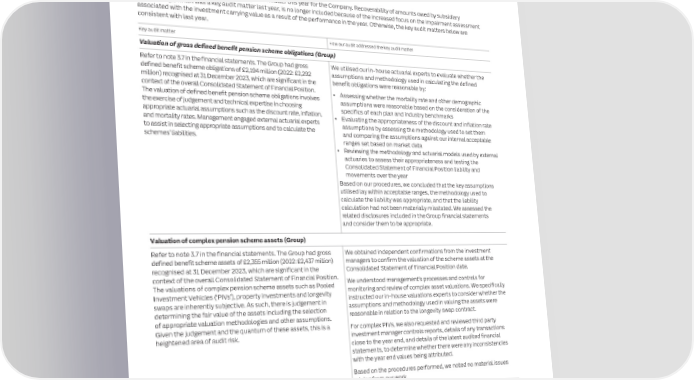 150 ITV plc Annual Report and Accounts 2023 ITV plc Annual Report and Accounts 2023 151 F I INDEPENDENT AUDITORS’ REPORT TO THE MEMBERS OF ITV PLC NAN CONTINUED C I AL Key audit matters Key audit matter How our audit addressed the key audit matter S T Key audit matters are those matters that, in the auditors’ professional judgement, were of most significance in the audit of the financial A Presentation of exceptional items, including valuation of the Box Clever provision (Group) T statements of the current period and include the most significant assessed risks of material misstatement (whether or not due to fraud) E M identified by the auditors, including those which had the greatest effect on: the overall audit strategy; the allocation of resources in the audit; Refer to notes 2.2 and 3.6 in the financial statements. The Group We substantiated a sample of exceptional items to corroborating E N and directing the efforts of the engagement team. These matters, and any comments we make on the results of our procedures thereon, recorded significant exceptional items of £77 million (2022: evidence. We assessed management’s rationale for the designation T were addressed in the context of our audit of the financial statements as a whole, and in forming our opinion thereon, and we do not provide £65 million) which were included on the face of the Consolidated of certain items as exceptional against the Group’s policy, S a separate opinion on these matters. Income Statement and disclosed within the Annual Report. considering the nature and impact of these items. We assessed the The presentation of items as exceptional can be judgemental appropriateness and completeness of the disclosures included in This is not a complete list of all risks identified by our audit. and have a significant impact on the readers of the financial the Group financial statements and the levels of equal prominence Recoverability of investments is a new key audit matter this year for the Company. Recoverability of amounts owed by subsidiary statements. Due to the quantum and number of exceptional of GAAP and non-GAAP measures within the Annual Report. undertakings, which was a key audit matter last year, is no longer included because of the increased focus on the impairment assessment items in the year, we focused on the presentation of these Specifically, with respect to the Box Clever provision, we enquired associated with the investment carrying value as a result of the performance in the year. Otherwise, the key audit matters below are items to ensure they were treated consistently with the Group’s of management and their external legal counsel on the latest consistent with last year. accounting policy. The Group had recorded a provision of status of the dispute and their views as to the most likely outcome, £52 million (2022: £52 million) for the liability that might arise including the form and quantum of any potential settlement. Key audit matter How our audit addressed the key audit matter as a result of the Box Clever Financial Support Directions issued by We assessed the basis for management’s estimate of the provision, the Pensions Regulator, which is unchanged since the prior year. and utilised our in-house actuarial experts to evaluate whether the Valuation of gross defined benefit pension scheme obligations (Group) There is continued uncertainty as to the quantum of the amount for which ITV may be liable. assumptions and methodology used in estimating the deficit Refer to note 3.7 in the financial statements. The Group had gross We utilised our in-house actuarial experts to evaluate whether the amounts were reasonable. defined benefit scheme obligations of £2,194 million (2022: £2,292 assumptions and methodology used in calculating the defined million) recognised at 31 December 2023, which are significant in the benefit obligations were reasonable by: We noted that consistent assumptions were used for the ITV context of the overall Consolidated Statement of Financial Position. pension arrangements, all of which were in our acceptable ranges. The valuation of defined benefit pension scheme obligations involves • Assessing whether the mortality rate and other demographic We noted that there remains a significant amount of uncertainty the exercise of judgement and technical expertise in choosing assumptions were reasonable based on the consideration of the related to this matter including the timing, amount and form of appropriate actuarial assumptions such as the discount rate, inflation, specifics of each plan and industry benchmarks settlement. We therefore reviewed the disclosures to ensure they and mortality rates. Management engaged external actuarial experts • Evaluating the appropriateness of the discount and inflation rate provide appropriate details on the developments and the range of to assist in selecting appropriate assumptions and to calculate the assumptions by assessing the methodology used to set them possible outcomes. schemes’ liabilities. and comparing the assumptions against our internal acceptable ranges set based on market data Based on our procedures, we were satisfied that the treatment and • Reviewing the methodology and actuarial models used by external classification of exceptional items is consistent with the Group’s actuaries to assess their appropriateness and testing the policy, and the Annual Report disclosures, including the Box Clever Consolidated Statement of Financial Position liability and matter, are appropriate. movements over the year Recoverability of investments (Company) Based on our procedures, we concluded that the key assumptions utilised lay within acceptable ranges, the methodology used to Refer to Note iii in the Company financial statements. At 31 December We performed the following procedures: calculate the liability was appropriate, and that the liability 2023 the Company held investments in subsidiaries with a carrying • Unders