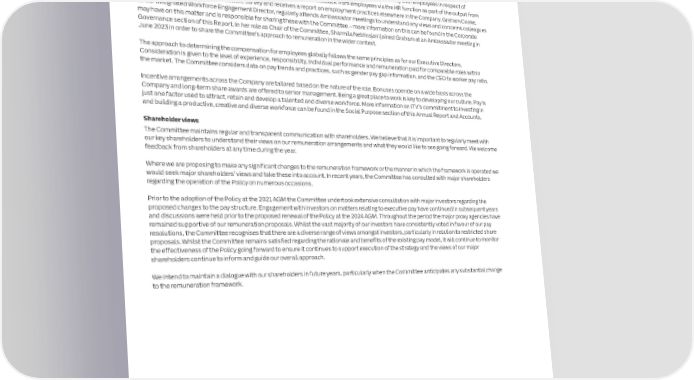 128 ITV plc Annual Report and Accounts 2023 ITV plc Annual Report and Accounts 2023 129 REMUNERATION REPORT CONTINUED G O VE R NAN Each Non-executive Director, including the Chair, has a contract of service or letter of appointment with the Company. Non-executive C Directors will serve for an initial term of three years, subject to election and annual re-election by shareholders, unless otherwise terminated CASCADE OF REMUNERATION THROUGH THE ORGANISATION E earlier by and at the discretion of either party upon one month’s written notice (12 months for the Chair). The Directors’ service contracts and letters of appointment are available for inspection at the Company’s registered office. Employment conditions elsewhere in the Company The table below summarises how remuneration compares across the different groups of employees The Committee has responsibility for ensuring effective engagement and alignment with the workforce in relation to remuneration and throughout the company. related policies and practices. When setting the policy for Directors’ remuneration, the Committee considers the pay and employment EMPLOYEES AT ALL LEVELS conditions of employees to ensure fairness across the organisation. Although it does not consult directly with employees in respect of determining the Directors’ Remuneration Policy, it receives general feedback from employees via the HR function as part of the output from Element of pay Description the employee Engagement and Culture survey and receives a report on employment practices elsewhere in the Company. Graham Cooke, Base salary Salaries are reviewed annually, with Executive Directors normally receiving a salary increase in line with that received by the as our designated Workforce Engagement Director, regularly attends Ambassador meetings to understand any views and concerns colleagues wider workforce. In 2024 there was a tiered approach to the annual pay review based on salary level. Lower earners in the business may have on this matter and is responsible for sharing these with the Committee – more information on this can be found in the Corporate received 6%, higher earners including the Executive Directors and Management Board received 3%, and all other employees received Governance section of this Report. In her role as Chair of the Committee, Sharmila Nebhrajani joined Graham at an Ambassador meeting in between 4-5%. June 2023 in order to share the Committee’s approach to remuneration in the wider context. ITV has held the Living Wage accreditation since 2014 and was the first broadcaster to do so. We pay the London Living Wage in London and the Living Wage outside of London. This means that we pay everyone, from employees and apprentices to contractors The approach to determining the compensation for employees globally follows the same principles as for our Executive Directors. and temporary workers, at least the hourly rate set independently and updated annually by the Living Wage Foundation, which is Consideration is given to the level of experience, responsibility, individual performance and remuneration paid for comparable roles within higher than the government’s National Minimum Wage and National Living Wage rates. the market. The Committee considers data on pay trends and practices, such as gender pay gap information, and the CEO to worker pay ratio. Flexible benefits A range of benefits are available to all employees, providing financial security, encouraging a healthy and balanced lifestyle, and Incentive arrangements across the Company are tailored based on the nature of the role. Bonuses operate on a wide basis across the helping individuals make their pay go further. Company and long-term share awards are offered to senior management. Being a great place to work is key to developing our culture. Pay is All employees receive the following benefits: just one factor used to attract, retain and develop a talented and diverse workforce. More information on ITV’s commitment to investing in • Five weeks holiday each year, plus bank holidays, and an extra two days after five years’ service and building a productive, creative and diverse workforce can be found in the Social Purpose section of this Annual Report and Accounts. • Enhanced Company sick pay and family friendly policies, including maternity, paternity, adoption and shared parental leave • Income protection cover of 50% of salary Shareholder views • Life assurance cover at four times annual basic salary The Committee maintains regular and transparent communication with shareholders. We believe that it is important to regularly meet with • Wellbeing benefits, including an annual wellbeing day, a range of digital health services and an Employee Assistance Programme our key shareholders to understand their views on our remuneration arrangements and what they would like to see going forward. We welcome (EAP) providing a confidential helpline and additional support feedback from shareholders at any time during the year. There are also voluntary benefits available for employees to choose from, including the opportunity to buy up to six weeks’ extra holiday, a Cycle to Work scheme, a salary sacrifice car benefit, gym membership, private healthcare and a health cash plan, which Where we are proposing to make any significant changes to the remuneration framework or the manner in which the framework is operated we includes optional hospital treatment insurance. would seek major shareholders’ views and take these into account. In recent years, the Committee has consulted with major shareholders We continually look for opportunities to evolve our employee benefits in cost effective ways that support both the needs of the regarding the operation of the Policy on numerous occasions. business and our diverse workforce. Prior to the adoption of the Policy at the 2021 AGM the Committee undertook extensive consultation with major investors regarding the Pension Employ