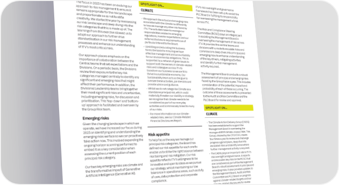 54 ITV plc Annual Report and Accounts 2023 ITV plc Annual Report and Accounts 2023 55 S NON-FINANCIAL AND SUSTAINABILITY INFORMATION STATEMENT CONTINUED T RISKS AND UNCERTAINTIES R A T E G I Risk Landscape C R ANTI-CORRUPTION AND ANTI-BRIBERY E P O PoliciesDue diligence and implementationOutcomes of policies and related KPIsRelated principal risks (pages 57 to 64) R The increasing pace of change in the market and the continued impact of the T • Our Code of Ethics and Conduct • All colleagues and Board members • We take a zero-tolerance approach • Legal and regulatory macroeconomic environment and global uncertainty means we must continue to (Our Code) promotes the highest are required to complete annual to bribery and corruption and are non-compliance (including with standards of ethical business and mandatory training aligned with committed to acting professionally, the Bribery Act 2010) is recognised be agile in the way we implement our strategy and manage the resulting risks. reinforces the importance of Our Code, and systems are in place fairly and with integrity in all our as a principal risk. We have a awareness of compliance through the Speaking Up business dealings and relationships compliance programme in place requirementsframework to enable employees to wherever we operate, as well as to mitigate the risk of bribery, • Our Anti-Bribery Policy sets out our identify and raise issues, including implementing and enforcing which is articulated in our responsibilities and provides suspected wrongdoing, fraud or effective systems to counter Anti-Bribery PolicyOur approachSPOTLIGHT ON… ITV’s risk oversight and governance information and guidance on what malpractice in the workplace bribery and corruptionThe focus in 2023 has been on evolving our framework has been set up to assist the bribery is and how to deal with • Bespoke training on the approach to risk management to ensure it CLIMATE PLC Board in fulfilling its responsibility bribery and corruption issues. Anti-Bribery Policy is provided to remains appropriate for the risk landscape for overseeing the management of risk Those working for or with us must employees working in roles or • We approach the actual and emerging risks across ITV. observe and uphold the policy territories at higher risk of bribery and proportionate so as not to stifle and corruption issuescreativity. We started the year by reassessing associated with the climate no differently • Our Sanctions Policy ensures that to how we manage any other risk faced by The Risk and Compliance Steering the business complies with all • Compliance with the Anti-Bribery our risk landscape and deep diving into the ITV. The activities taken to manage our Committee (RCSC) plays an integral part relevant international and financial Policy is kept under review and risk categories that this is made up of. The responsibilities related to emerging in assisting the Management Board in sanctions in force at the time by the reported to the Management Board learnings from this exercise allowed us to regulations, investor expectations and our overseeing the management of risk across US, UN, EU or UK governmentand Audit and Risk Committee adapt our approach to further drive external disclosure requirements are of • Our Supplier Code of Conduct sets biannually standardisation in our risk management particular interest to the Board. ITV. It provides the central teams and out our expectation of our suppliers • Bribery and corruption risks are processes and enhance our understanding divisions with a route to escalate risks and • Upskilling and educating the business commissions deep dives into principal and to comply with all anti-bribery lawsreviewed annually by the Audit of ITV’s most critical risks.forms the basis for ensuring we have and Risk Committee, as is wider effective management and accountability emerging risks to enhance understanding policy compliance Our approach places emphasis on the for our environmental obligations. This is of the key drivers, mitigating activities importance of collaboration between the supported by a network of green leads to and identify further management Central teams that set expectations and the support both the owners of climate-related activity required. risks and colleagues across ITV to Divisions. On a periodic basis, the Divisions transform our business so we are fit to The Management Board conducts a robust review their exposure to the key risk thrive in a sustainable economy. Our assessment of principal and emerging risks categories managed centrally to identify any Sustainability team acts as the glue to significant and emerging risks that might oversee these activities, join the dots and faced by the Group twice a year. This includes affect their performance. In addition, the provide advice and guidance. consideration of the potential impact and Divisional Leadership teams bring together • Whilst we do not categorise Climate as a probability of each of these occurring. The their most significant risks and uncertainties, standalone principal risk, which could outcome of these assessments is presented including emerging risks, for discussion and materially threaten our viability or strategy, to the Audit and Risk Committee and the we recognise that climate needs to be PLC Board for review and approval. prioritisation. This ‘top-down’ and ‘bottom- considered as part of our everyday up’ approach is facilitated and overseen by activities and is intrinsically linked to many the Group Risk team. of our risks. SPOTLIGHT ON… • For more information on our climate- CLIMATE Emerging risks related risks, see our Climate-Related Financial Disclosures Report. Given the changing landscape in which we • The Climate Action Delivery Group (CADG) operate, we have increased our focus during has been established to support the 2023 on identifying and understanding the Management Board in overseeing the emerging risks w