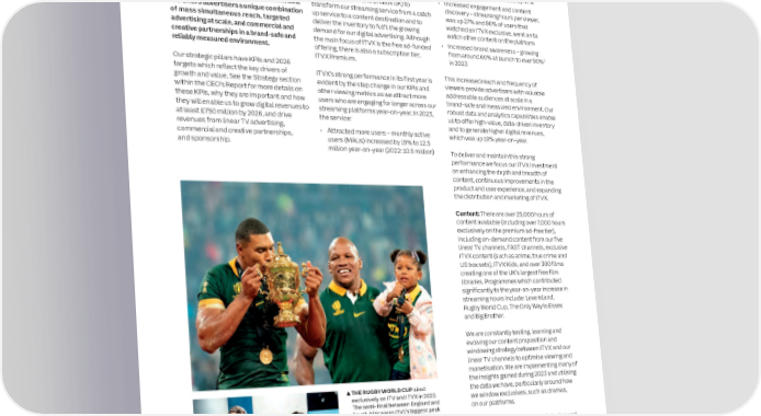 26 ITV plc Annual Report and Accounts 2023 ITV plc Annual Report and Accounts 2023 27 S OPERATING AND FINANCIAL PERFORMANCE REVIEW CONTINUED T R A T E G I ITV’s M&E strategy recognises and Supercharge • Attracted a larger audience – total C R capitalises on the change in viewer streaming hours were up 26% to 1,505 E P 1 O behaviour and the evolving needs of million (2022: 1,192 million ) Streaming R advertisers. It is based on two strategic • Increased viewing by our target audience T MEDIA & pillars: Supercharge Streaming and Growing and enhancing our – streaming hours amongst light viewers Optimise Broadcast. Our focus is to retain who are harder to reach, increased by 65%, our existing viewers and advertisers while streaming service ITVX and streaming hours among the 25-54 age also attracting new ones. ITV offers viewers We successfully launched ITVX in December group demographic increased by 47% the choice to watch whenever and however 2022 (which combined our previous offerings • Increased engagement and content they wish, with a strong reputation for ITV Hub, ITV Hub+ and BritBox UK) to discovery – streaming hours per viewer, brilliant content suited to British audiences. transform our streaming service from a catch was up 27% and 90% of users that ENTERTAINMENT ITV offers advertisers a unique combination up service to a content destination and to watched an ITVX exclusive, went on to of mass simultaneous reach, targeted deliver the inventory to fulfil the growing watch other content on the platform advertising at scale, and commercial and demand for our digital advertising. Although creative partnerships in a brand-safe and the main focus of ITVX is the free ad-funded • Increased brand awareness – growing 2 reliably measured environment. offering, there is also a subscription tier, from around 60% at launch to over 90% ITVX Premium. in 2023 Our strategic pillars have KPIs and 2026 targets which reflect the key drivers of ITVX’s strong performance in its first year is This increased reach and frequency of growth and value. See the Strategy section evident by the step change in our KPIs and viewers provide advertisers with valuable within the CEO’s Report for more details on other viewing metrics as we attract more addressable audiences at scale in a these KPIs, why they are important and how users who are engaging for longer across our brand-safe and measured environment. Our they will enable us to grow digital revenues to streaming platforms year-on-year. In 2023, robust data and analytics capabilities enable at least £750 million by 2026, and drive the service: us to offer high-value, data-driven inventory revenues from linear TV advertising, and to generate higher digital revenues, commercial and creative partnerships, • Attracted more users – monthly active which was up 19% year-on-year. and sponsorship. users (MAUs) increased by 19% to 12.5 million year-on-year (2022: 10.5 million) To deliver and maintain this strong performance we focus our ITVX investment on enhancing the depth and breadth of content, continuous improvements in the product and user experience, and expanding the distribution and marketing of ITVX. Content: There are over 25,000 hours of content available (including over 7,000 hours exclusively on the premium ad-free tier), including on-demand content from our five linear TV channels, FAST channels, exclusive ITVX content (such as anime, true crime and US box sets), ITVX Kids, and over 300 films creating one of the UK’s largest free film libraries. Programmes which contributed significantly to the year-on-year increase in streaming hours include: Love Island, Rugby World Cup, The Only Way Is Essex and Big Brother. We are constantly testing, learning and evolving our content proposition and Media & Entertainment (M&E) is the largest commercial windowing strategy between ITVX and our linear TV channels to optimise viewing and broadcaster and streamer in the UK, delivering unrivalled monetisation. We are implementing many of the insights gained during 2023 and utilising audience scale and reach. It includes Streaming and Broadcast, THE RUGBY WORLD CUP aired the data we have, particularly around how exclusively on ITV and ITVX in 2023. we window exclusives, such as dramas, distributing content through ITVX, our free advertiser-funded The semi-final between England and on our platforms. South Africa was ITV1’s biggest peak streaming service, and our free-to-air linear TV channels. audience of the year. ITV NEWS ITV has been News is an important driver of viewing and providing trusted and impartial our ITV News proposition is now fully news for more than 60 years. embedded within ITVX, with News streaming hours up 20% year-on-year and we have launched exclusive 90-second ITV News bulletins, a new News category page on the service and regional short and long-form catch up. MR BATES VS THE POST OFFICE is a drama series based on true events. It was produced by ITV Studios and was ITV’s biggest new drama 1. The full year 2022 comparative for total streaming hours has been restated from 1,139 million due to it including some in over a decade. estimates of total streaming viewing from third-party data providers. This has since been updated to accurately reflect the actual outcome 2. ITV / YouGov – base: 4,659 Nat Rep UK Adults – Dec 2023