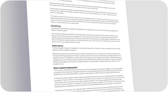 232 ITV plc Annual Report and Accounts 2023 ITV plc Annual Report and Accounts 2023 233 F I NOTES TO THE ITV PLC COMPANY FINANCIAL STATEMENTS CONTINUED NAN C I AL Derivatives and other financial instruments Exercises of share options granted to employees can be satisfied by market purchase or issue of new shares. No new S T nstruments to hedge its exposure to fluctuations in shares may be issued to satisfy exercises under the terms of the DSA. A The Company uses a limited number of derivative financial i T E interest and other foreign exchange rates. The Company does not hold or issue derivative instruments for During the year, all exercises were satisfied by using shares held in the ITV Employees’ Benefit Trust. The Trust is M speculative purposes. E accounted for as a separate entity and therefore is only accounted for in the consolidated ITV financial statements. N T Derivative financial instruments are initially recognised at fair value and are subsequently remeasured at fair value S with the movement recorded in the profit and loss account within net financing costs, except where derivatives Dividends to shareholders qualify for cash flow hedge accounting. In this case, the effective portion of cash flow hedge is recognised in other Dividends payable to shareholders are recognised through equity on the earlier of their approval by the Company’s reserves within equity. The cumulative gain or loss is later reclassified to the profit and loss account in the same shareholders or their payment. Dividends are distributed based on the realised distributable reserves (within period as the relevant hedged transaction is realised. Derivatives with positive fair values are recorded as assets retained earnings) of ITV plc (Company) and not based on the Group’s retained earnings. and negative fair values as liabilities. The fair value of foreign currency forward contracts is determined by using the difference between the contract Note ii Employees ctors) were employees of the Company during the year, exchange rate and the quoted forward exchange rate at the balance sheet date. Employees and Two (2022: two) Directors of ITV plc (i.e. the Executive Dire share-based both of whom remain employed at the year end. The costs relating to these Directors are disclosed in the The fair value of interest rate swaps is the estimated amount that the Company would receive or pay to terminate compensation Remuneration Report. the swap at the balance sheet date, taking into account current interest rates and the current creditworthiness of swap counterparties. Share-based compensation Third-party valuations are used to fair value the Company’s derivatives. The valuation techniques use inputs such as The weighted average share price of share options exercised during the year was 49.3 pence (2022: 50.6 pence) interest rate yield curves and currency prices/yields, volatilities of underlying instruments and correlations between (excluding nil priced share options). The options outstanding at the year end have an exercise price in the range of nil inputs. For financial assets and liabilities classified at fair value through profit or loss, the fair value change and to 135.20 pence (2022: nil to 130.61 pence) and a weighted average contractual life of one year (2022: two years) for interest income/expense are not separated. all the schemes in place for the Group. Current tax Note iii The carrying value of the Company’s investments in subsidiary undertakings at 31 December 2023 was £3,224 million Investments (2022: £3,224 million). Current tax is the expected tax payable or receivable on the taxable income or loss for the year and any adjustment in in subsidiary respect of previous years. The carrying value of the Company’s investments in subsidiary undertakings is assessed for impairment on an annual undertakings basis. Determining whether the carrying amount has any indication of impairment requires judgement. In testing The Company recognises liabilities for anticipated tax issues based on estimates of the additional taxes that are for impairment, estimates are used in deriving cash flows and the discount rates. The estimation process is complex likely to become due, which require judgement. Amounts are accrued based on management’s interpretation of due to the inherent risks and uncertainties associated with long-term forecasting. The outcome of the value in use specific tax law and the likelihood of settlement. Where the final tax outcome of these matters is different from the calculation including borrowings supports the carrying value of the investments in subsidiary undertakings. amounts that were initially recorded, such differences will impact the current tax and deferred tax provisions in the period in which such determination is made. Due to the significant headroom, there is no reasonably possible scenario that would result in a material adjustment to the amounts reported in the financial statements. Deferred tax The tax charge for the year is recognised in the Income Statement or directly in equity according to the accounting The Company’s review resulted in no impairment for 2023 (2022: no impairment). treatment of the related transaction. The listing of subsidiary undertakings and investments is listed on page 238 to 242. Deferred tax arises due to certain temporary differences between the carrying amount of assets and liabilities for financial reporting purposes and those for taxation purposes. The amount of deferred tax provided is based on the Note iv The Company operates an intra-group cash pool policy with certain 100% owned UK subsidiaries. The pool applies expected manner of realisation or settlement of the carrying amount of assets and liabilities. A deferred tax asset is Amounts to bank accounts where there is an unconditional right of set off and involves the daily closing cash position for recognised only to the extent that it is probable that sufficient taxable profit will 