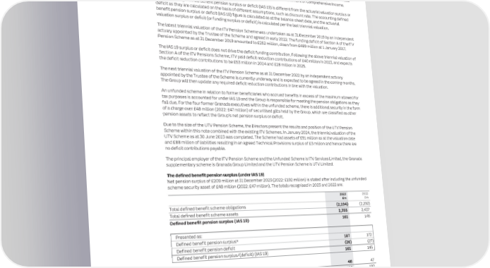 196 ITV plc Annual Report and Accounts 2023 ITV plc Annual Report and Accounts 2023 197 F I NOTES TO THE FINANCIAL STATEMENTS NAN SECTION 3: OPERATING ASSETS AND LIABILITIES CONTINUED C I AL 3.7 Keeping In this note, we explain the accounting policies governing the Group’s pension Unless otherwise stated, references to Defined Benefit Schemes (‘the Schemes’) within this note refer to the ITV S T it simple schemes, followed by analysis of the components of the net defined benefit Pension Scheme, the Unfunded Scheme and the UTV Pension Scheme combined. Details on each scheme are A Pensions T pension surplus or deficit, including assumptions made, and where the related provided below. E M movements have been recognised in the financial statements. In addition, we have E N placed text boxes to explain some of the technical terms used in the disclosure. The liabilities of the Schemes are measured by discounting the best estimate of future cash flows to be paid using T the ‘projected unit’ method. These calculations are complex and are performed by a qualified actuary. There are S What are the Group’s pension schemes? many judgements and estimates necessary to calculate the Group’s estimated liabilities, the main assumptions are There are two types of pension schemes. A ‘Defined Contribution’ scheme that is set out later in this note. Movements in assumptions during the year are called ‘actuarial gains and losses’ and these open to ITV employees, and a number of ‘Defined Benefit’ schemes that have been are recognised in the period in which they arise through the Consolidated Statement of Comprehensive Income. closed to new members since 2006 and closed to future accrual in 2017. In 2016, on acquisition of UTV Limited, the Group took over the UTV Defined Benefit Scheme, The accounting defined benefit pension surplus or deficit (IAS 19) is different from the actuarial valuation surplus or which closed to future accrual at the end of March 2019. deficit as they are calculated on the basis of different assumptions, such as discount rate. The accounting defined benefit pension surplus or deficit (IAS 19) figure is calculated as at the balance sheet date, and the actuarial What is a Defined Contribution scheme? valuation surplus or deficit (or funding surplus or deficit) is calculated per the last triennial valuation. The Defined Contribution scheme is where the Group makes fixed payments into a separate fund on behalf of those employees participating in saving for their The latest triennial valuation of the ITV Pension Scheme was undertaken as at 31 December 2019 by an independent retirement. ITV has no further obligation to the participating employee and the risks actuary appointed by the Trustee of the Scheme and agreed in early 2022. The funding deficit of Section A of the ITV and rewards associated with this type of scheme are assumed by the members Pension Scheme as at 31 December 2019 amounted to £252 million, down from £489 million at 1 January 2017. rather than the Group. Although the Trustee of the scheme makes available a range of investment options, it is the members’ responsibility to make investment The IAS 19 surplus or deficit does not drive the deficit funding contribution. Following the above triennial valuation of decisions relating to their retirement benefits. Section A of the ITV Pensions Scheme, ITV paid deficit reduction contributions of £40 million in 2023, and expects the deficit reduction contributions to be £53 million in 2024 and £28 million in 2025. What is a Defined Benefit scheme? In a Defined Benefit scheme, members receive payments during retirement, the value The next triennial valuation of the ITV Pension Scheme as at 31 December 2022 by an independent actuary of which is dependent on factors such as salary and length of service. The Group appointed by the Trustee of the Scheme is currently underway and is expected to be agreed in the coming months. makes contributions to the scheme, a separate Trustee-administered fund that is not The Group will then update any required deficit reduction contributions in line with the valuation. consolidated in these financial statements, but is reflected on the defined benefit pension surplus or deficit line in the Consolidated Statement of Financial Position. An unfunded scheme in relation to former beneficiaries who accrued benefits in excess of the maximum allowed for tax purposes is accounted for under IAS 19 and the Group is responsible for meeting the pension obligations as they The Trustee, appointed according to the terms of the Schemes’ documentation, fall due. For the four former Granada executives within the unfunded scheme, there is additional security in the form is required to act in the best interest of the beneficiaries and is responsible of a charge over £48 million (2022: £47 million) of securitised gilts held by the Group, which are classified as other for managing and investing the assets of the Scheme and its funding position. pension assets to reflect the Group’s net pension surplus or deficit. Schemes can be funded, where regular cash contributions are made by the employer into a fund which is invested. In the event of poor investment returns or Due to the size of the UTV Pension Scheme, the Directors present the results and position of the UTV Pension increases in liabilities, the Group may need to address this through increased levels Scheme within this note combined with the existing ITV Schemes. In January 2024, the triennial valuation of the of contribution. Alternatively, schemes can be unfunded, where no regular money or UTV Scheme as at 30 June 2023 was completed. The Scheme had assets of £91 million as at the valuation date assets are required to be put aside to cover future payments but in some cases, and £88 million of liabilities resulting in an agreed Technical Provisions surplus of £3 million and hence there are security is required. no deficit contri