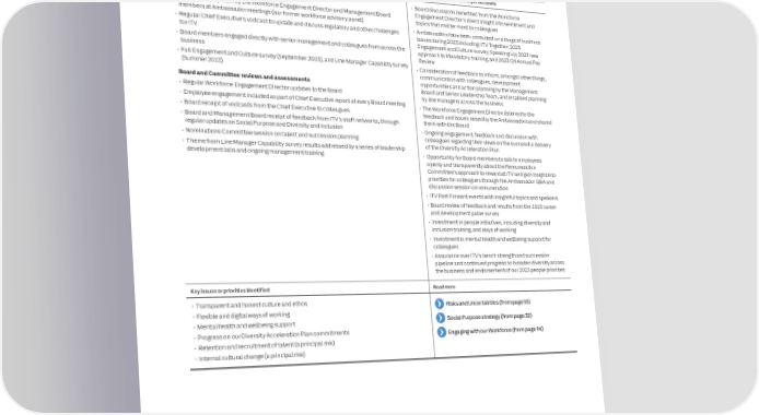 90 ITV plc Annual Report and Accounts 2023 ITV plc Annual Report and Accounts 2023 91 STAKEHOLDER ENGAGEMENT CONTINUED G O VE R NAN C SHAREHOLDERS (INDIVIDUAL AND INSTITUTIONAL), BOND HOLDERS AND OTHER PROVIDERS OF DEBT AND ANALYSTSCOLLEAGUES E DescriptionLink to strategic prioritiesDescription Link to strategic priorities Delivering for our investors (equity and debt) and understanding their views and interests ensures Deliver value for shareholders: The workforce is integral to the day-to-day operations and the practical execution of strategy. Delivery of strategy: the business continues to be successful in the long term and therefore can deliver for all our see Our Strategy Effective engagement mechanisms provide the Board with important insights and priorities, as see Our Strategy stakeholders. well as ensuring the workforce voice is considered in the Board’s decision-making. Forms of engagementOutcomes and impact on principal decisionsForms of engagement Outcomes and impact on principal decisions Meetings and presentations • Consideration of feedback to inform, amongst other things, Meetings and presentations • Board discussions benefited from the Workforce • Chief Executive and Group CFO & COO presented the full year results and the Interim ITV’s long-term strategy, five year plan, dividend policy, • Regular participation by the Workforce Engagement Director and Management Board Engagement Director’s direct insight into sentiment and results and took questions from analystscapital allocation and approach to ESG and other members at Ambassador meetings (our former workforce advisory panel)topics that matter most to colleagues • Chair, Chief Executive and Group CFO & COO held regular meetings with our largest governance issues• Regular Chief Executive’s vodcast to update and discuss regulatory and other challenges • Ambassadors have been consulted on a range of business shareholders • Board discussion on investor sentiment and action for for ITV issues during 2023 including: ITV Together; 2023 • The Chief Executive and Group CFO & COO held meetings with target investors based in the management to conduct further analysis of ITV’s existing • Board members engaged directly with senior management and colleagues from across the Engagement and Culture survey; Speaking Up; 2023 new UK, US and parts of Europeand prospective investor base with the evolution of the business approach to Mandatory training; and 2023/24 Annual Pay equity story Review • The Chief Executive and Group CFO & COO both attended investor conferences during the • Announcement of the Board’s intention to pay an interim • Full Engagement and Culture survey (September 2023), and Line Manager Capability survey • Consideration of feedback to inform, amongst other things, year. These included the Citi, UBS, JP Morgan TMT, Barclays TMT and Morgan Stanley TMT dividend of 1.7p and propose a final dividend of 3.3p for 2023(Summer 2023)communication with colleagues, development conferences opportunities and action planning by the Management • Chair, Chief Executive and Group CFO & COO held a Fund Managers’ dinner in November • Maintained investment grade credit ratings; refinanced the Board and Committee reviews and assessments £230 million bond which matured in December 2023 with a • Regular Workforce Engagement Director updates to the Board Board and Senior Leadership Team, and localised planning with a small group of senior fund managers£230 million Term Loan maturing July 2027; extended the by line managers across the business • Chief Executive and Group CFO & COO held meetings with equity sales teams and analystsmaturity of the £500 million RCF; and agreed a new £100 • Employee engagement included as part of Chief Executive report at every Board meeting• The Workforce Engagement Director listened to the • The Board attended the AGM, with an opportunity for shareholders to ask questions RCF with Lloyds which mature across 2028 and 2029• Board receipt of vodcasts from the Chief Executive to colleaguesfeedback and issues raised by the Ambassadors and shared before, during and after the meeting• Board and Management Board receipt of feedback from ITV’s staff networks, through them with the Board • The Remuneration Committee Chair met with Columbia Threadneedle, Dimensional Fund regular updates on Social Purpose and Diversity and Inclusion • Ongoing engagement, feedback and discussion with Advisors and Schroders to discuss the Remuneration Policy renewal• Nominations Committee session on talent and succession planningcolleagues regarding their views on the successful delivery • Regular dialogue throughout 2023 between the Group CFO & COO, Group Finance Director • Theme from Line Manager Capability survey results addressed by a series of leadership of the Diversity Acceleration Plan and Group Treasurer, and the Rating Agencies and The Core Banking Group development labs and ongoing management training• Opportunity for Board members to talk to employees openly and transparently about the Remuneration Board and Committee reviews and assessments Committee’s approach to reward at ITV and gain insight into • Group CFO & COO reports on analyst consensus, latest shareholder feedback, changes in priorities for colleagues through the Ambassador Q&A and share register and key shareholder engagement activities undertaken by the Executive discussion session on remuneration Directors and Investor Relations team • ITV Fast Forward events with insightful topics and speakers • Board updates from the Company’s brokers and advisers on market performance, bid • Board review of feedback and results from the 2023 career defence and capital structure, and on shareholder sentiment regarding ITV’s performance, and development pulse survey strategy and dividend policy • Investment in people initiatives, including diversity and • Board members’ careful scrutiny