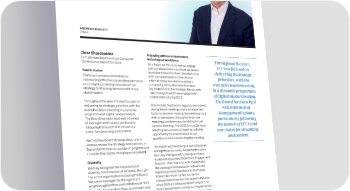 74 ITV plc Annual Report and Accounts 2023 ITV plc Annual Report and Accounts 2023 75 LONG-TERM VIABILITY STATEMENT (LTVS) DISCLOSURE CONTINUED G CHAIR’S GOVERNANCE STATEMENT O VE R NAN Viability assessmentPotential MitigationsViability Statement C Our balance sheet and liquidity position In the unlikely event that all scenarios were to Based on the above, the Board has a E remains strong. At 31st December 2023, this impact ITV concurrently, ITV would breach reasonable expectation that ITV will remain comprised unrestricted cash of £340.5 it’s RCF Net Debt / EBITDA covenant in H2 viable and be able to continue operations million; undrawn Revolving Credit Facilities 2026 with a ratio of 3.94x compared to the and meet its liabilities as they fall due over (RCF) of £500 million and £100 million threshold of 3.5x. The threshold is not the three year-period ending 31 December available throughout the viability period; and breached in any other half-yearly period 2026. The assessment has been made with undrawn bilateral facility/CDS of £300 during the assessment period. ITV could reference to ITV’s strategy and the current million maturing in June 2026 (assumed to eliminate the need for any further position and prospects and risks. be replaced with a new facility). management action in H2 2026 by exercising its option under the terms of the RCF to The Strategic Report was approved by the During the viability period, the €600 million increase the covenant threshold to 4.0x for Board and signed on its behalf by: Eurobond maturing September 2026 is up to 2 consecutive half-yearly periods. assumed to be refinanced. Interest cover remains greater than 3.0x CHRIS KENNEDY throughout the viability period.GROUP CFO & COO We have considered both the individual 07 March 2024 scenarios and various combinations of the scenarios in order to assess viability. Our ANDREW COSSLETT modelling concludes that If all scenarios CHAIR were to occur concurrently (considered implausible), management action would be required to ensure the leverage covenant in the Revolving Credit Facility (RCF) is not breached in 2026. Dear Shareholder Engaging with our stakeholders, I am pleased to present our Corporate including our workforce Throughout the year, Governance Report for 2023. As a Board we focus on how we engage ITV was focused on with our stakeholders and how we deliver Year in review a positive impact for them. Relationships delivering its strategic The Board remains committed to with our stakeholders in the UK and priorities, with the maintaining effective corporate governance internationally are vital to building a executive team investing and integrity, enabling us to deliver our successful and sustainable business. strategy for the long-term benefit of our My statement in the Strategic Report sets in a dynamic programme stakeholders. out the ways in which we engaged with of digital modernisation. stakeholders during 2023. Throughout the year, ITV was focused on The Board has been kept delivering its strategic priorities, with the Shareholder feedback is regularly considered well informed of executive team investing in a dynamic during Board meetings and is an important programme of digital modernisation. factor in decision-making. We meet regularly Management’s plans, The Board has been kept well informed with shareholders, through one-to-one particularly following of management’s plans, particularly meetings, conferences and at the Annual following the launch of ITVX and our General Meeting. The 2023 Annual General the launch of ITVX and vision for streaming and content. Meeting was a physical meeting, with the our vision for streaming opportunity for shareholders to ask and content. We held two Board Strategy days, one in questions before and during the meeting. June to review the Strategy and a second in December to hear an update on progress and The health and wellbeing of our colleagues consider the rapidly changing environment. is a significant priority. As part of the open two-way dialogue with colleagues there Diversity is a Board appointed Workforce Engagement We fully recognise the importance of Director. Their role is to work closely with diversity and inclusion at all levels, through the colleague Ambassador network and the entire organisation including the Board. regularly provide feedback to the Board. We are encouraged by the significant Edward Bonham Carter, our Senior progress against the core initiatives of ITV’s Independent Director, has acted in this role Diversity Acceleration Plan, launched in July since 2019 and stepped down in April. The 2020. It’s encouraging to see management’s Board would like to convey our thanks to him commitment and achievements receive for serving in this role for the past four years. public recognition. We are pleased with our Graham Cooke has taken over the position gender and ethnic diversity representation and for information on Graham’s role and on the Board, 45.45% and 18.2% work, and the Board’s workforce engagement respectively, exceeding the FCA Listing activities, please see pages 94 to 95. Rules, Hampton-Alexander and Parker targets. For more detail you can refer to our The Board sought to balance the interests of UK workforce diversity data in the Diversity all stakeholders throughout the year. Please and Inclusion report. see page 83 for examples of key strategic issues considered and Board decisions taken in 2023, and pages 92 to 93 for an explanation of how the Board has had regard to the section 172 matters (including certain key stakeholder considerations).