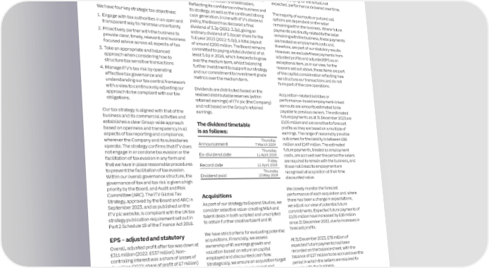 48 ITV plc Annual Report and Accounts 2023 ITV plc Annual Report and Accounts 2023 49 S FINANCE REVIEW CONTINUED T R A T E G I Tax strategy Statutory EPS decreased by 51% to 5.2p We have generally structured our deals with Cash generation C R (2022: 10.7p). earnouts or with put and call options in place E ITV is a responsible business, and we take a Profit to cash conversion P for the remainder of the equity, capping the O responsible attitude to tax, recognising that R it affects all of our stakeholders. To allow A full reconciliation between statutory and maximum consideration payable by basing a 2023 2022 T adjusted EPS is included in the Alternative significant part of the consideration on Twelve months to 31 December £m £m those stakeholders to understand our Adjusted EBITA 489 717 approach to tax, we have published our Performance Measures section. future performance. This has allowed us to Global Tax Strategy, which is available on lock in creative talent and ensure our Working capital movement 90 (150) our corporate website. Dividend per share incentives are aligned, and also reduce our Adjustment for The Voice of China cash received* – 23 The Board recognises the importance of the risk by only paying for the actual, not expected, performance delivered over time. Adjustment for production tax credits (47) (18) www.itvplc.com/investors/ ordinary dividend to ITV shareholders. ** governance/policies Reflecting its confidence in the business and Depreciation 46 53 its strategy, as well as the continued strong The majority of earnouts or put and call Share-based compensation 16 19 We have four key strategic tax objectives: cash generation, in line with ITV’s dividend options are dependent on the seller Acquisition of property, plant and equipment and intangible assets*** (70) (78) policy, the Board has declared a final remaining within the business. Where future 1. Engage with tax authorities in an open and payments are directly related to the seller Lease liability payments (including lease interest) (26) (26) transparent way to minimise uncertainty dividend of 3.3p (2022: 3.3p), giving an remaining with the business, these payments ordinary dividend of 5.0p per share for the Adjusted cash flow 498 540 2. Proactively partner with the business to full year 2023 (2022: 5.0p), a total payout are treated as employment costs and, Profit to cash ratio (adjusted EBITA/adjusted cash flow) 102% 75% provide clear, timely, relevant and business of around £200 million. The Board remains therefore, are part of our statutory results. focused advice across all aspects of tax However, we exclude these payments from * Cash received in 2018 and 2019 for The Voice of China was placed under review and treated as an exceptional cash receipt and excluded from the profit to cash conversion committed to paying a total dividend of at adjusted profits and adjusted EPS as an calculation. In 2022, the review completed and the cash was released. This adjustment shows the conversion of exceptional cash to operating cash. 3. Take an appropriate and balanced least 5.0p in 2024, which it expects to grow ** Depreciation of £46 million (2022: £53 million) includes £28 million (2022: £33 million) which relates to ITV Studios and £18 million (2022: £20 million) relating to Media & approach when considering how to over the medium term, whilst balancing exceptional item, as in our view, for the Entertainment. structure tax sensitive transactions further investment to support our strategy reasons set out above, these items are part *** Except where disclosed, management views the acquisition of property, plant and equipment and intangibles as business as usual capex, necessary to the ongoing investment of the capital consideration reflecting how in the business. 4. Manage ITV’s tax risk by operating and our commitment to investment grade we structure our transactions and do not effective tax governance and metrics over the medium term. form part of the core operations. understanding our tax control framework Cash generated from operations is reconciled to the adjusted cash flow as follows: with a view to continuously adjusting our Dividends are distributed based on the Acquisition-related liabilities or approach to be compliant with our tax realised distributable reserves (within performance-based employment-linked 2023 2022 obligations. retained earnings) of ITV plc (the Company) Twelve months to 31 December £m £m and not based on the Group’s retained earnouts are amounts estimated to be Cash generated from operations 488 537 Our tax strategy is aligned with that of the earnings. payable to previous owners. The estimated future payments as at 31 December 2023 are Cash outflow from exceptional items 68 53 business and its commercial activities and £105 million and are sensitive to forecast Cash generated from operations excluding exceptional items 556 590 establishes a clear Group-wide approach The dividend timetable profits as they are based on a multiple of based on openness and transparency in all is as follows: Adjustment for production tax credits 38 31 aspects of tax reporting and compliance, earnings. The range of reasonably possible Adjustment for The Voice of China cash received – 23 wherever the Company and its subsidiaries Thursday outcomes for the liability is between £86 Announcement 7 March 2024 million and £147 million. The estimated Acquisition of property, plant and equipment and intangible assets (70) (78) operate. The strategy confirms that ITV does future payments, treated as employment not engage in or condone tax evasion or the Thursday Lease liability payments (including lease interest) (26) (26) Ex-dividend date 11 April 2024 costs, are accrued over the period the sellers facilitation of tax evasion in any form and Friday are required to remain with the business, and Adjusted cash flow 498 540 that we have in place reasonable procedures Record date 12 April 2024 those not lin