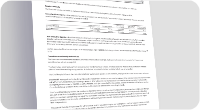 140 ITV plc Annual Report and Accounts 2023 ITV plc Annual Report and Accounts 2023 141 REMUNERATION REPORT CONTINUED G O VE R NAN Outstanding interests under share plansExternal directorships C The following tables provide details of the Executive Directors’ interests in outstanding share awards.With specific approval of the Board, Executive Directors may undertake external appointments as a non‑executive director of other E publicly quoted companies and retain any related fees paid to them. During the year, the Executive Directors retained fees for the Share price Share S h a r e directorships set out below. At At used for option price at Holding 1 January Awarded Vested Exercised Lapsed 31 December award price exercise Vesting period Notes2023in yearin yearin year in year2023(pence)(pence)(pence)dateends 2023 Carolyn McCall Company £000 LTIP Carolyn McCall Bridgepoint Group plc 107 28 March28 March Chris Kennedy Whitbread plc 87 28 March 20181144,989––144,989––145.25–80.8320212023 28 March28 March 28 March 20191692,937––––692,937 126.37––2022 2024 6 April6 April The Board and Committee are satisfied that these commitments do not compromise their duties as Executive Directors of ITV plc. 6 April 20201 3,575,495– 1,393,013 – 2,182,482 1,393,01369.91––2023 2025 Service contracts ESP The Directors’ service contracts and letters of appointment are available for inspection at the Company’s registered office. 13 May13 May 13 May 20212 1,013,062––––1,013,062 123.37––2024 2026Executive Directors: Executive Directors have rolling service contracts that provide for 12 months’ notice on either side. There are no special 28 March28 March provisions that apply in the event of a change of control. 28 March 20222 1,338,577––––1,338,577 96.17––2025 2027 28 March28 March 28 March 20232–1,643,105–––1,643,105 81.48––20262028 Notice period Notice period Compensation for Date of appointment Nature of contract from Company from Director early termination DSA3 Carolyn McCall 8 January 2018 Rolling 12 months 12 months None 6 April Chris Kennedy 21 February 2019 Rolling 12 months 12 months None 6 April 20204692,767–692,767692,767––69.91–80.822023 28 March 28 March 2022567,177––––567,177 96.17––2025 28 March Non‑executive Directors: Each Non‑executive Director, including the Chair, has a letter of appointment with the Company. Non‑executive 28 March 20235– 584,666 –––584,666 81.48––2026Directors will serve for an initial term of three years, subject to election and then annual re‑election by shareholders, unless otherwise terminated earlier by and at the discretion of either party upon one month’s written notice (12 months for the current Chair). After the initial Chris Kennedy three year term, reappointment is on an annual basis. LTIP 28 March28 March All Non‑executive Directors are subject to re‑election at the AGM in 2024. Details of appointment and tenure are set out in the table on page 77 28 March 20191420,928––––420,928 126.37––2022 2024to 78. 6 April6 April 6 April 202012,171,954–846,194– 1,325,760846,19469.91––2023 2025Committee membership and advisers ESP The Directors who were members of the Committee when matters relating to the Executive Directors’ remuneration for the year were considered are set out on page 119. 13 May13 May 13 May 20212615,390––––615,390 123.37––2024 2026 28 March28 March The Committee obtains advice from various sources in order to ensure it makes informed decisions. The Executive Directors are invited to 28 March 20222813,126––––813,126 96.17––2025 2027attend Committee meetings as appropriate. No individual is involved in decisions relating to their own remuneration. 28 March28 March 28 March 20232–998,114–––998,114 81.48––2026 2028The Chief People Officer is the main internal adviser and provides updates on remuneration, employee relations and human resource issues. DSA3 Deloitte LLP was appointed by the Committee as the independent adviser on remuneration policy and the external remuneration environment 6 April with effect from September 2017 following a review of other advisers in the market place. Total fees for advice provided to the Committee 6 April 20204389,111–389,111 389,111 ––69.91–80.822023 28 March during the year amounted to £88,400 on a time/material basis (exclusive of VAT and expenses). Deloitte are members of the Remuneration 28 March 2022367,120––––367,120 96.17––2025Consultants Group and abide by its Code of Conduct in relation to remuneration consulting in the UK. 28 March 28 March 20235–383,421–––383,421 81.48––2026The Committee regularly reviews the quality and objectivity of the advice it receives from Deloitte in private sessions and this is challenged as a part of the Board evaluation process. It is satisfied that the advice it has received has been objective and independent, and that any SAYE conflicts have been appropriately managed. The Committee is satisfied that the Deloitte LLP engagement partner and advisory team that 1 June provide remuneration advice to the Committee, do not have any connections with the Company or individual directors that may impair 7 April 2020624,426–––24,426–92.1173.69–2023their independence. 1 November 13 September 20236–32,907––– 32,907 70.4656.37–2026 The wider UK Deloitte firm provided ITV with a number of other services during the year relating to risk and internal audit (until April 2022), 1. Awards under the LTIP are subject to performance over a three year period. Any proportion of the award that meets the performance conditions will become exercisable after a two tax, financial advice and consultancy. The members of the executive remuneration consulting team are not incentivised to cross‑sell year holding period. 2. Awards under the ESP vest after three years subject to a financia