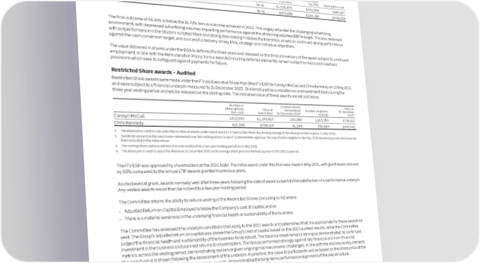 132 ITV plc Annual Report and Accounts 2023 ITV plc Annual Report and Accounts 2023 133 REMUNERATION REPORT CONTINUED G O VE R NAN The annual Social Purpose targets goals can be found on our website www.itvplc.com.Consistent with the requirements of the Code, the Committee considers wider performance before approving the formulaic outcomes from C incentive plans. Where appropriate the Committee has scope to apply judgement and discretion. To assist the Committee with determining E The Committee noted the progress that had been made against our ESG targets in 2023 and agreed that based on holistic assessment whether adjustments are required, the Committee applies a framework which considers performance from multiple perspectives, including against the balanced scorecard this element should deliver an outcome of 75% of maximum.the underlying strength of results, the execution of strategic priorities, performance indicators which do not form part of the formulaic assessment, and non-financial factors, such as culture and our focus on duty of care. The Committee has a track record of adjusting outcomes The remainder of the bonus (20%) was based upon the Committee’s assessment of the contribution each Executive Director made to where appropriate, with negative discretion applied in both 2018 and 2019, and the cancellation of the bonus for 2020. the overall strategy through the delivery of specific targets. The Committee applies suitable judgement when assessing performance in this regard. Value delivered in Outcome shares under (% of maximum) Total value the DSA Value paid in cash Carolyn McCall 56.41 £1,025,875 £341,958 £683,917 Area of focusAchievement Chris Kennedy 56.41 £672,839 £224,280 £448,559 Chief Executive objectivesMaximise the potential of ITV Studios globally: by working ITV Studios Iberia set up during the year to be the to identify, create and deliver opportunities to maximise exclusive home of ITV Studios’ formats in Spain, joining an scale and increase value.international production and distribution group that spans The final outcome of 56.41% is below the 81.72% bonus outcome achieved in 2022. This largely reflected the challenging advertising 13 countries. environment, with depressed advertising volumes impacting performance against the stretching adjusted EBITA target. This was balanced Overall, ITV Studios delivered total organic revenue with outperformance in the Studio’s scripted titles and strong deal making in Global Partnerships, as well as continued strong performance growth of 3% and adjusted EBITA margin of 13% in the against the cash conversion target, and successful delivery on key ESG, strategic and individual objectives. year. ITV Studios total revenue from streaming platforms grew to 32%, hitting the target three years early.The value delivered in shares under the DSA is deferred for three years and released on the third anniversary of the award subject to continued Continue to deliver the Digital Transformation agenda: Key achievements include the stabilisation and growth employment. In line with the Remuneration Policy, bonus awards (including deferred elements) remain subject to malus and clawback achieving key programme milestones with particular focus of ITVX, including across core partner platforms, and provisions which seek to safeguard against payments for failure. on digital culture and products. the delivery of Planet V and ITV’s data strategy in line with plans. Restricted Share awards – Audited Phase one of ITV Together went live, delivering changes Restricted Share awards were made under the ITV plc Executive Share Plan (the ITV ESP) to Carolyn McCall and Chris Kennedy on 13 May 2021 in core People and Finance activities.and were subject to a financial underpin measured to 31 December 2023. Dividends paid accumulated on a reinvestment basis during the Delivered the second series of ITV Fast Forward, three year vesting period and will be released on the vesting date. The indicative value of these awards are set out below. to build the digital and data capabilities of colleagues, with sessions exploring the use of generative AI, design thinking, machine learning and digital disruptors. Number of Dividend shares Value at share options Value at reinvested at Number of options 31 December 1 2 3 4 (nil-cost) award date 31 December 2023 vesting 2023 Develop the equity story: by evolving the external Regular engagement with investors and analysts to Carolyn McCall 1,013,062 £1,249,815 150,288 1,163,350 £736,517 positioning and communication of the successful execution update on key achievements and progress against the of the More Than TV Strategy. Highlight the value created by strategy, particularly focusing on the value created Chris Kennedy 615,390 £759,207 91,294 706,684 £447,402 the strategy through key delivery milestones and the through ITV’s digital transformation and digital 1. The share price used to calculate the number of shares under award was 123.37 pence (the three-day trading average of the share price before grant, 13 May 2021). achievement of KPIs.revenue growth.2. Dividends earned on the award were reinvested over the vesting period. Subject to shareholder approval, the award will be eligible for the May 2024 dividend payment which has not Implement People strategy: with a focus on retaining key 70% of colleagues participated in the 2023 engagement been included in the table above. talent and capabilities, and delivering a strong, diverse and culture survey, which resulted in an overall ITV 3. The vesting share options will become exercisable after a two year holding period on 13 May 2026. succession pipeline of talent, supporting inclusivity and the engagement score of 68% (1% higher than the last 4. The share price used to value the shares at 31 December 2023 is the average share price for the final quarter of 2023 (63.31 pence). delivery of ITV’s DEI plans and KPIs.survey in 2021). The Nominations Committee 