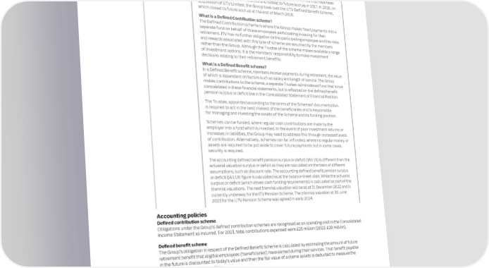 196 ITV plc Annual Report and Accounts 2023 ITV plc Annual Report and Accounts 2023 197 F I NOTES TO THE FINANCIAL STATEMENTS NAN SECTION 3: OPERATING ASSETS AND LIABILITIES CONTINUED C I AL 3.7 Keeping In this note, we explain the accounting policies governing the Group’s pension Unless otherwise stated, references to Defined Benefit Schemes (‘the Schemes’) within this note refer to the ITV S T it simple schemes, followed by analysis of the components of the net defined benefit Pension Scheme, the Unfunded Scheme and the UTV Pension Scheme combined. Details on each scheme are A Pensions T pension surplus or deficit, including assumptions made, and where the related provided below. E M movements have been recognised in the financial statements. In addition, we have E N placed text boxes to explain some of the technical terms used in the disclosure. The liabilities of the Schemes are measured by discounting the best estimate of future cash flows to be paid using T the ‘projected unit’ method. These calculations are complex and are performed by a qualified actuary. There are S What are the Group’s pension schemes? many judgements and estimates necessary to calculate the Group’s estimated liabilities, the main assumptions are There are two types of pension schemes. A ‘Defined Contribution’ scheme that is set out later in this note. Movements in assumptions during the year are called ‘actuarial gains and losses’ and these open to ITV employees, and a number of ‘Defined Benefit’ schemes that have been are recognised in the period in which they arise through the Consolidated Statement of Comprehensive Income. closed to new members since 2006 and closed to future accrual in 2017. In 2016, on acquisition of UTV Limited, the Group took over the UTV Defined Benefit Scheme, The accounting defined benefit pension surplus or deficit (IAS 19) is different from the actuarial valuation surplus or which closed to future accrual at the end of March 2019. deficit as they are calculated on the basis of different assumptions, such as discount rate. The accounting defined benefit pension surplus or deficit (IAS 19) figure is calculated as at the balance sheet date, and the actuarial What is a Defined Contribution scheme? valuation surplus or deficit (or funding surplus or deficit) is calculated per the last triennial valuation. The Defined Contribution scheme is where the Group makes fixed payments into a separate fund on behalf of those employees participating in saving for their The latest triennial valuation of the ITV Pension Scheme was undertaken as at 31 December 2019 by an independent retirement. ITV has no further obligation to the participating employee and the risks actuary appointed by the Trustee of the Scheme and agreed in early 2022. The funding deficit of Section A of the ITV and rewards associated with this type of scheme are assumed by the members Pension Scheme as at 31 December 2019 amounted to £252 million, down from £489 million at 1 January 2017. rather than the Group. Although the Trustee of the scheme makes available a range of investment options, it is the members’ responsibility to make investment The IAS 19 surplus or deficit does not drive the deficit funding contribution. Following the above triennial valuation of decisions relating to their retirement benefits. Section A of the ITV Pensions Scheme, ITV paid deficit reduction contributions of £40 million in 2023, and expects the deficit reduction contributions to be £53 million in 2024 and £28 million in 2025. What is a Defined Benefit scheme? In a Defined Benefit scheme, members receive payments during retirement, the value The next triennial valuation of the ITV Pension Scheme as at 31 December 2022 by an independent actuary of which is dependent on factors such as salary and length of service. The Group appointed by the Trustee of the Scheme is currently underway and is expected to be agreed in the coming months. makes contributions to the scheme, a separate Trustee-administered fund that is not The Group will then update any required deficit reduction contributions in line with the valuation. consolidated in these financial statements, but is reflected on the defined benefit pension surplus or deficit line in the Consolidated Statement of Financial Position. An unfunded scheme in relation to former beneficiaries who accrued benefits in excess of the maximum allowed for tax purposes is accounted for under IAS 19 and the Group is responsible for meeting the pension obligations as they The Trustee, appointed according to the terms of the Schemes’ documentation, fall due. For the four former Granada executives within the unfunded scheme, there is additional security in the form is required to act in the best interest of the beneficiaries and is responsible of a charge over £48 million (2022: £47 million) of securitised gilts held by the Group, which are classified as other for managing and investing the assets of the Scheme and its funding position. pension assets to reflect the Group’s net pension surplus or deficit. Schemes can be funded, where regular cash contributions are made by the employer into a fund which is invested. In the event of poor investment returns or Due to the size of the UTV Pension Scheme, the Directors present the results and position of the UTV Pension increases in liabilities, the Group may need to address this through increased levels Scheme within this note combined with the existing ITV Schemes. In January 2024, the triennial valuation of the of contribution. Alternatively, schemes can be unfunded, where no regular money or UTV Scheme as at 30 June 2023 was completed. The Scheme had assets of £91 million as at the valuation date assets are required to be put aside to cover future payments but in some cases, and £88 million of liabilities resulting in an agreed Technical Provisions surplus of £3 million and hence there are security is required. no deficit contri