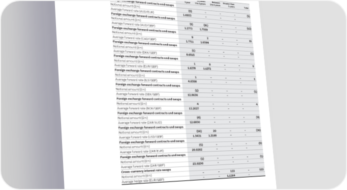 212 ITV plc Annual Report and Accounts 2023 ITV plc Annual Report and Accounts 2023 213 F I NOTES TO THE FINANCIAL STATEMENTS NAN SECTION 4: CAPITAL STRUCTURE AND FINANCING COSTS CONTINUED C I AL Undiscounted financial liabilities Timing profile of hedging instrument S T A T Keeping The Group is required to disclose the expected timings of cash outflows for each of Keeping The Group is required to provide a breakdown that discloses a profile of the timing E its financial liabilities (including derivatives). The amounts disclosed in the table are of the nominal amount of the hedging instrument and if applicable, the average M it simple it simple E the contractual undiscounted cash flows (including interest), so will not always price or rate (for example strike or forward prices etc.) of the hedging instrument. N T reconcile with the amounts disclosed on the Statement of Financial Position. S The Group is holding the following foreign exchange and cross-currency interest rate swap contracts: Total Between Between Less than Between Between Greater than Carrying contractual Less than 1 and 2 2 and 5 Over At 31 December 2023 1 year 1 to 2 years 2 to 5 years 5 years Total value cash flows 1 year years years 5 years Foreign exchange forward contracts and swaps At 31 December 2023 £m £m £m £m £m £m Non-derivative financial liabilities Notional amount (£m) (5) – – – (5) Borrowings (763) (785) (12) (8) (763) (2) Average forward rate (AUD/EUR) 1.6933 – – – Lease liabilities (115) (140) (18) (19) (52) (51) Foreign exchange forward contracts and swaps Trade and other payables (931) (931) (906) (25) – – Notional amount (£m) (1) (11) – – (12) Other payables – non-current (33) (33) – (33) – – Average forward rate (AUD/GBP) 1.2773 1.7559 – – * Foreign exchange forward contracts and swaps Other payables – commitments on acquisitions (78) (105) (47) – (55) (3) Derivative financial instruments Notional amount (£m) 9 2 – – 11 Foreign exchange forward contracts and swaps – Average forward rate (CAD/GBP) 1.7711 1.6594 – – cash flow hedges Foreign exchange forward contracts and swaps Inflow 4 195 150 45 – – Notional amount (£m) (1) – – – (1) Outflow (2) (193) (149) (44) – – Average forward rate (DKK/GBP) 8.6515 – – – Cross-currency swaps – cash flow hedges Foreign exchange forward contracts and swaps Inflow – 542 7 7 528 – Notional amount (£m) 1 8 – – 9 Outflow (15) (580) (16) (16) (548) – Average forward rate (EUR/GBP) 1.1278 1.1272 – – Foreign exchange forward contracts and swaps – Foreign exchange forward contracts and swaps fair value through profit or loss Notional amount (£m) 1 – – – 1 Inflow 1 177 171 6 – – Average forward rate (ILS/GBP) 4.6398 – – – Outflow – (176) (170) (6) – – Foreign exchange forward contracts and swaps (1,932) (2,029) (990) (93) (890) (56) Notional amount (£m) (1) – – – (1) Average forward rate (SEK/GBP) 12.9636 – – – Foreign exchange forward contracts and swaps Total Between Between Notional amount (£m) 4 – – – 4 Carrying contractual Less than 1 and 2 2 and 5 Over value cash flows 1 year years years 5 years Average forward rate (NOK/GBP) 13.2027 – – – At 31 December 2022 £m £m £m £m £m £m Non-derivative financial liabilities Foreign exchange forward contracts and swaps Borrowings (830) (865) (302) (8) (550) (5) Notional amount (£m) (4) – – – (4) Lease liabilities (132) (149) (21) (26) (37) (65) Average forward rate (ZAR/AUD) 12.6830 – – – Trade and other payables (915) (915) (898) (14) (3) – Foreign exchange forward contracts and swaps Other payables – non-current (28) (28) – (25) (3) – Notional amount (£m) (56) 20 – – (36) * Average forward rate (USD/GBP) 1.3431 1.2188 – – Other payables – commitments on acquisitions (47) (89) (8) (26) (33) (22) Foreign exchange forward contracts and swaps Derivative financial instruments Notional amount (£m) (5) – – – (5) Foreign exchange forward contracts and swaps – Average forward rate (ZAR/EUR) 20.6262 – – – cash flow hedges Inflow 4 480 401 63 16 – Foreign exchange forward contracts and swaps Outflow (6) (486) (409) (61) (16) – Notional amount (£m) (1) – – – (1) Cross-currency swaps – cash flow hedges Average forward rate (ZAR/GBP) 23.0200 – – – Inflow – 560 7 7 546 – Cross-currency interest rate swaps Outflow (8) (596) (16) (16) (564) Notional amount (£m) – – 533 – 533 Foreign exchange forward contracts and swaps – Average hedge rate (EUR/GBP) – – 1.1264 – fair value through profit or loss Inflow – 51 45 6 – – Outflow (1) (52) (46) (6) – – (1,963) (2,089) (1,247) (106) (644) (92) * Undiscounted expected future payments depending on performance of acquisitions