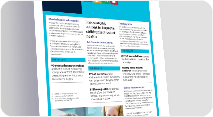 34 ITV plc Annual Report and Accounts 2023 ITV plc Annual Report and Accounts 2023 35 S SOCIAL PURPOSE CONTINUED T R A T E G I C R E Supporting the next generation in our industry, Shows with the biggest impact on audiences and P O R BETTER across the UK and around the world. CLIMATE the smallest impact on the planet. T Futures SUSTAINABLE DEVELOPMENT GOALS Action OUR GOALS – Net Zero: Reducing emissions we control by 46.2% and those we can influence by 28% by 2030, and all emissions by 90% by 2050 – 100% sustainable supply chain by 2030 – Zero Waste by 2030 – 100% albert certified and trained each year – Increase visibility and impact of climate action content on-screen SUSTAINABLE DEVELOPMENT GOALS Mentoring and volunteering Encouraging The Daily Mile In 2023 ITV continued its mentoring ITV continued its partnership with The partnership with Creative Access, an actions to improve Daily Mile encouraging schoolchildren to organisation that helps people from children’s physical do 15 minutes of daily exercise to tackle under-represented communities access lowering levels of physical activity in careers and progress to leadership in the health children in the UK. The ‘Thrive’ campaign Context time. Energy-efficiency measures in our creative industries. re-ran in September and October, hub sites, including LED lighting, motion Zero Waste highlighting the positive impact of daily As the impacts of climate change sensors and solar energy generation, ITV colleagues were also involved in Eat Them To Defeat Them exercise in improving mood and memory, worsen and the transition to a have driven the reduction in Scope 1 and We are continuously taking steps to training workshops, including Media Now in its fifth year, ITV continued its as well as attention in class. sustainable economy accelerates, it is 2 emissions. improve our data quality and monitor Trust’s Creativity Work’s: Multimedia award-winning partnership with Veg increasingly important for companies waste in our offices and production Training programme and ITV Academy’s Power to encourage children to eat more THE RESULTS to integrate climate action into strategic activities, all while working towards a Creative Access Showcase in decision making. THE RESULTS circular economy from office equipment vegetables. Sky and Channel 4 together Manchester. matched ITV’s airtime commitment, 32,730 more children took up to props. enabling a £3 million media campaign, To address this, we are publishing our Our Scope 1 & 2 emissions THE RESULTS the Daily Mile as a result of the initial Climate Transition Plan alongside have decreased by 52% since with additional funding from an alliance campaign On-screen of supermarket and food brands. the 2023 Annual Report and Accounts. our baseline year 90 mentoring partnerships This details how we will transform ITV Nearly half a million to meet our ambitious targets, while As a founding signatory of the Climate and 559 hours of mentoring THE RESULTS 69% of our electricity comes Content Pledge, ITV is committed to children have signed up to using our reach and influence to took place in 2023. There have inspire behaviour change in audiences. from renewable energy doing more to reach and engage been 340 partnerships since 77% of parents whose The Daily Mile since ITV began For more information on our climate audiences with climate action content. 1 children took part in the school supporting the campaign in action progress, refer to our Shows from Daytime to The Masked the scheme began Reducing our Scope 3 Singer and Love Island incorporate campaigns said they ate more April 20193 2023 Social Purpose Impact report. emissions (influenced by ITV) climate content. vegetables as a result Targets, data and governance ITV’s Scope 3 footprint has decreased by £132m veg sales as a direct Soccer Aid for UNICEF We are continuously improving our data. 17% compared to our baseline year. Biodiversity 1. Data supplied by Creative Access result of our Eat Them To 2023 saw the 12th Soccer Aid for UNICEF ITV’s Scope 1 and 2 (controlled by ITV) and Scope 3 (influenced by ITV) Business Travel emissions have We recognise how critical it is for 2. Data supplied by Veg Power Defeat Them campaign since match, marking 17 years of the ITV and increased by 13% compared to 2022, but 3. Daily Mile school registrations, data UNICEF partnership. Teams of former emissions for 2023 were independently businesses to address the biodiversity provided by The Daily Mile it launched in 20192 assured by ERM Certification and remain below pre-COVID-19 levels with crisis. In preparation for future reporting professional footballers and celebrities a 45% reduction compared to 2019. ITV came together to raise money for Verification Services Limited (ERM CVS), requirements, we are reviewing the and we have published an updated Basis is introducing prompts to our booking actions we can take across our UNICEF’s work helping children who are system to encourage colleagues to facing conflict, disasters, and other of Reporting document. Our Scope 3 production activities, supply chain data quality is improving thanks to more choose lower emission travel. engagement and office improvements crises around the world. company–level data into our calculations to manage our nature related and engagement with our supply chain. Purchased Goods and Services are dependencies, risks and opportunities. The match took place in front of over the largest contributor to ITV’s Scope 3 63,000 fans and was broadcast emissions; of these, 65% come from our exclusively on ITV and STV. Reducing our emissions productions. We use BAFTA albert Reducing our Scope 1 and 2 sustainability certification to tackle this THE RESULTS emissions (controlled by ITV) and work with broadcasting peers to ITV’s Scope 1 and 2 emissions are support sector-wide change. £14.6 million raised in total decreasing on track with our targets, from the match and Soccer with a 