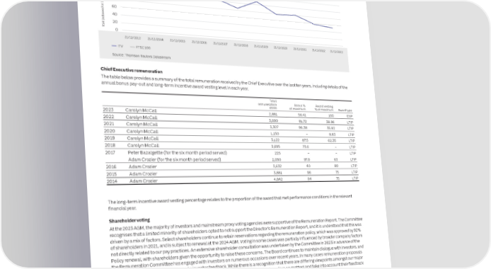 142 ITV plc Annual Report and Accounts 2023 ITV plc Annual Report and Accounts 2023 143 REMUNERATION REPORT CONTINUED G DIRECTORS’ REPORT O VE R NAN Historical performance The Directors present their Annual Report and the audited consolidated and C The graph below shows the TSR performance of the Company against the FTSE 100 index over the ten year period to 31 December 2023. E The FTSE 100 was chosen as ITV has been a member of the FTSE 100 during the ten year period. parent company financial statements for the year ended 31 December 2023. 180 ) 3 160 1 The Directors’ Report comprises this report and the entire Governance section including the Chair’s Governance Statement. In accordance 0 r 2 with the Financial Conduct Authority’s Listing Rules, the information to be included in the 2023 Annual Report and Accounts, where applicable, e 140 b m under LR 9.8.4, is set out in this Directors’ Report. Other information that is relevant to this report, and which is incorporated by reference, e 120 c e can be located as follows: 1 D 100 t 3 0 a 80 0 INFORMATION PAGE NUMBER o 1 60 d t e s Carbon and greenhouse gas emissions See page 35 a 40 b e r R ( 20 Corporate Governance Report See pages 75 to 142 S T 0 Culture See pages 96 to 99 31/12/2013 31/12/2014 31/12/2015 31/12/2016 31/12/2017 31/12/2018 31/12/2019 31/12/2020 31/12/2021 31/12/2022 31/12/2023 Directors’ service contracts See page 126 ITV FTSE 100 Employee engagement and involvement See pages 94 to 95 Source: Thomson Reuters Datastream Employee equality, diversity, reward, investment and inclusion See pages 37 to 39 Chief Executive remuneration Future developments of the business of the Group See pages 10 to 11 The table below provides a summary of the total remuneration received by the Chief Executive over the last ten years, including details of the Membership of the Board during the 2023 financial year See page 77 to 78 annual bonus pay-out and long-term incentive award vesting level in each year. Research and development See pages 10 to 11 Total Stakeholder engagement and Company’s business relationships See pages 84 to 91 remuneration Bonus % Award vesting £000 of maximum % of maximum Award type 2023 Carolyn McCall 2,881 56.41 100 ESP 2022 Carolyn McCall 3,690 81.72 38.96 LTIP Corporate 2021 Carolyn McCall 3,307 96.38 35.82 LTIP 2020 Carolyn McCall 1,150 – 8.83 LTIP Articles of Association: The Articles of Association may only be amended by special resolution of the shareholders. The current Articles 2019 Carolyn McCall 3,122 87.5 62.35 LTIP were adopted as the Articles of Association of the Company at the conclusion of the 2022 AGM and are available on our website. 2018 Carolyn McCall 3,695 73.6 – LTIP www.itvplc.com/investors/governance 2017 Peter Bazalgette (for the six month period served) 225 – – LTIP Adam Crozier (for the six month period served) 2,050 97.9 63 LTIP Auditor: The external auditor for the 2023 financial year was PricewaterhouseCoopers LLP. The Independent Auditor’s Report starting 2016 Adam Crozier 3,632 40 80 LTIP on page 149 sets out the information contained in the Annual Report which has been audited by the external auditor. 2015 Adam Crozier 3,881 96 75 LTIP 2014 Adam Crozier 4,842 94 75 LTIP The Audit and Risk Committee considered the performance and audit fees of the external auditor, and the level of non-audit work undertaken. It recommended to the Board that a resolution for the reappointment of PricewaterhouseCoopers LLP for a further year as the Company’s auditor be proposed to shareholders at the AGM on 2 May 2024. The long-term incentive award vesting percentage relates to the proportion of the award that met performance conditions in the relevant Change of control: No person holds securities in the Company carrying special rights with regard to control of the Company. All of financial year. the Company’s share schemes contain provisions relating to a change of control. Outstanding awards and options would normally vest and become exercisable on a change of control, subject to the satisfaction of any performance conditions and proration for time Shareholder voting where appropriate. At the 2023 AGM, the majority of investors and mainstream proxy voting agencies were supportive of the Remuneration Report. The Committee recognises that a limited minority of shareholders opted to not support the Director’s Remuneration Report, and it is understood that this was Certain of the Group’s debt and derivative instruments have change of control clauses whereby the counterparty can require ITV to repay or driven by a mix of factors. Select shareholders continue to retain reservations regarding the remuneration policy, which was approved by 92% redeem the instruments in the event of a change of control (although in some cases only if it is accompanied by a credit rating downgrade to of shareholders in 2021, and is subject to renewal at the 2024 AGM. Voting in some cases was partially influenced by broader company factors sub investment grade). The Company is not aware of any other significant agreements to which it is a party that take effect, alter or terminate not directly related to our pay practices. An extensive shareholder consultation was undertaken by the Committee in 2023 in advance of the upon a change of control of the Company. Policy renewal, with shareholders given the opportunity to raise these concerns. The Board continues to maintain dialogue with investors, and the Remuneration Committee has engaged with investors on numerous occasions over recent years. In many cases remuneration proposals Other agreements: The Company does not have any agreements with any Director or employee that would provide compensation for loss of have been adapted in direct response to investor feedback. While there is a recognition that there are differing viewpoints amongst our major office or employment resulting from change of control following a takeover bid. investors on matters rel
