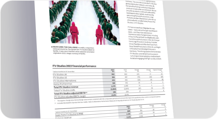 22 ITV plc Annual Report and Accounts 2023 ITV plc Annual Report and Accounts 2023 23 S OPERATING AND FINANCIAL PERFORMANCE REVIEW CONTINUED T R A T E G I Growing our Further diversifying our The percentage of ITV Studios total revenues Attracting and retaining C R from streaming platforms increased to 32% E Global Formats businesscustomer base leading talent P (2022: 22%) in 2023 and exceeds our 2026 O Unscripted content also remains important As the demand for content from streaming A key part of ITV Studios investment strategy R to ITV Studios. Through our Global platforms grows globally, this presents a target of 30%. This has been impacted by and its overall success is its ability to attract T the phasing of large deliveries in the year Partnerships business, we monetise our significant opportunity for ITV Studios to and therefore we are maintaining our target and retain the best creative talent. ITV portfolio of some of the world’s most further diversify its customer base and at 30%. Deliveries in 2023 included the Studios offers talent a unique combination of successful travelling entertainment formats, remains a key priority of ITV Studios strategy following for Netflix: Fool Me Once – one creative independence, an entrepreneurial as well as maximise commercial to grow its market share and meet its 2026 of their all-time top 10 English language culture, and the resources of a global studio opportunities from our brands. We are KPI targets.dramas, Squid Game: The Challenge, business. This includes access to ITV Studios focused on driving growth across our One Piece, and SUBURRÆTERNA; Playdate global distribution network, and in the UK, unscripted offering by monetising our In the US, we have well-established and for Disney+; Franklin, Physical and Big Beasts the benefit of being a vertically integrated existing high-value formats effectively trusted relationships with all the major for Apple TV+; Twin Love for Amazon; and producer broadcaster and streamer. We are as well as supporting the creation of new streaming platforms. We currently have Love Island US and Love Island Games proud to be able to continue to attract the global formats.scripted or unscripted projects either in for Peacock. best talent in the market, most recently development or commissioned by all of welcoming Plimsoll Productions, Lingo Our portfolio of world-class brands includes them. In 2023, over 40% of US unscripted Whilst further diversifying our customer base Pictures and Ben Stephenson, who set up our established formats such as The Voice revenues and nearly 100% of US scripted with streaming platforms is a key strategic a transatlantic scripted label, Poison Pen (one of the most successful unscripted revenues came from streaming platforms.priority for ITV Studios, it requires careful Studios, in ITV Studios. format brands in the world), Love Island, The management of our working capital as Chase, Come Dine With Me, Hell’s Kitchen streaming platforms typically expect ITV has successfully integrated its new and I’m A Celebrity…Get Me Out Of Here!. extended payment profiles. In some labels – many set up through recent talent These formats continue to sell in new instances, it may also limit our ability to deals – and they have delivered an territories and attract mass audiences for maintain all rights for high-value scripted impressive slate of programmes, including our clients. They are highly sought after by titles as streaming platforms usually seek A Year On Planet Earth and Big Beasts, both both traditional broadcasters and streaming worldwide distribution rights for original from Plimsoll Productions in the UK, Prosper platforms, offering cost-effective content commissions, in return for a premium fee from Lingo Pictures in Australia, Fool Me with a proven track record of audience on commissions. Once, Playdate and After the Flood from success. We also have several new formats Quay Street Productions in the UK, and Night that have been commissioned in our UK, US SQUID GAME: THE CHALLENGE is a reality competition in Paradise from Windlight Pictures in and international production bases, with the series produced by The Garden (an ITV Studios label) for Germany. This strong pipeline demonstrates potential to be future global hits. These Netflix. It was one of Netflix’s most-watched unscripted ITV Studios commitment and success in include My Mum, Your Dad (our first global originals in 2023. Image courtesy of Netflix. nurturing and leveraging top creative talent format to originate from the US); I Kissed A to deliver engaging and high-quality content. Boy; and Make Love Fake Love. As well as protecting our biggest brands, we ITV Studios 2023 financial performance are also focused on expanding our franchises by creating successful spin-offs that allow us 2023 2022 Change Change Organic Change* Twelve months to 31 December £m £m £m % % to evolve existing formats. Examples include ITV Studios UK 962 822 140 17 16 The Voice, which now has six spin-off versions; Love Island has two new spin-offs, ITV Studios US 395 467 (72) (15) (13) Love Island Games and Love Island All Stars; ITV Studios International 445 465 (20) (4) (8) and I’m A Celebrity…Get Me Out Of Here! Global Partnerships 368 342 26 8 8 South Africa is a new spin-off in the UK.Total ITV Studios revenue 2,170 2,096 74 4 3 Total ITV Studios costs (1,884) (1,837) (47) (3) (2) In 2023, across our Global Partnerships Total ITV Studios adjusted EBITA** 286 259 27 10 8 business, we sold 63 unique formats internationally (2022: 64), 19 of which were ITV Studios adjusted EBITA margin 13.2% 12.4% sold to three or more countries (2022: 19). * The organic change assumes exchange rates remain consistent with the comparative period and it removes the impact of acquisitions in the current or comparative period. By 2026, we expect to have 20 such formats, ** Includes the benefit of production tax credits. Refer to Alternative Performance Me
