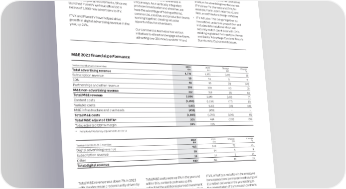30 ITV plc Annual Report and Accounts 2023 ITV plc Annual Report and Accounts 2023 31 S OPERATING AND FINANCIAL PERFORMANCE REVIEW CONTINUED T R A T E G I With the expansion of ITVX’s online inventory Commercial and creative partnerships nearly 400 digital-only advertisers to ITV in Partnerships and other revenue declined by C R and reach, ITV is well positioned to meet the 2023. For example: 2% in the year mainly driven by lower E ITV’s Commercial team delivers strategic P increasing demand for targeted advertising. competition revenue. O commercial and creative partnerships with • ITV AdVentures Ignite: Encouraging R We have a significant opportunity to partake advertisers who highly value ITV’s large and digitally native brands to advertise on T in the addressable market of around £6.8 targeted audiences to establish and grow television for the first time We expect Partnerships and other revenues billion in 2023 (Source: AA/WARC Q3 2023 their own brands. This includes product to decline in 2024 following our decision to Expenditure Report), and have the placement, ad-funded programming and • ITV AdVentures Invest: Through our Media revise our partnership agreements to allow foundations in place to successfully other partnerships that leverage the for Equity program, we take minority ITVX viewers to watch in HD, and allow ITV to compete for the long tail of advertisers within strength of our programme brands to help stakes in direct-to-consumer businesses target ads to a much larger proportion of the online video market which were advertisers connect with audiences in in return for advertising inventory across those viewers, using Planet V. previously inaccessible to ITV due to their unique ways. As a vertically integrated ITV’s linear TV channels and ITVX, for scale and targeting requirements. Since we producer broadcaster and streamer, we example, Flarin, a pain relief brand, and BritBox International launched Planet V we have attracted in have the advantage of having editorial, Resi, an architectural design company excess of 1,000 new advertisers to ITV. • ITV Ad Labs: This brings together all On 01 March 2024, ITV announced the sale of commercial, creative, and production teams its 50% shareholding in BritBox International working together, creating valuable innovations under one proposition and to the BBC Studios for £255 million. ITV ITVX and Planet V have helped drive opportunities for advertisers. includes data solutions which can Studios will continue to receive an ongoing growth in digital advertising revenue in the securely match client data with ITV’s revenue stream from BritBox International year, up 21%. Our Commercial team also has various existing registered first-party audience similar to current levels for the use of ITV initiatives to attract and engage advertisers, and Boots’ Advantage Card and Tesco’s content under new extended licensing attracting over 250 new brands to TV and Dunnhumby Clubcard databases. agreements. Prior to this date, BritBox International was THE MASKED SINGER continues to drive mass audiences ITV’s joint venture with the BBC, providing and returned for its fifth series in January 2024. an ad-free subscription streaming service M&E 2023 financial performance offering the most comprehensive collection of British content available in the US, 2023 2022 Change Change Total advertising revenue (TAR) Subscription revenue Canada, Australia, South Africa and the Twelve months to 31 December £m £m £m % Total advertising revenue 1,778 1,931 (153) (8) TAR was down 8% year-on-year in 2023 Subscription revenue is generated directly Nordics (made up of Sweden, Finland, Subscription revenue 59 54 5 9 which was in line with our expectations. from the premium tier of ITVX, our Denmark and Norway). Subscribers on standalone BritBox UK app, and BritBox UK 31 December 2023 were 3.7 million. SDN 48 55 (7) (13) (31 December 2022: 3.0 million). BritBox Partnerships and other revenue 205 209 (4) (2) The start of 2023 saw TAR down 10% in Q1 and ITV Catch Up services on Amazon Prime and down 11% in Q2 against tough Video Channels. It does not include BritBox International revenue and profit or loss, M&E non-advertising revenue 312 318 (6) (2) comparatives and the challenging International, which is included within JVs is included in share of profits/losses on Total M&E revenue 2,090 2,249 (159) (7) macroeconomic environment. Q3 was up 1% and Associates. JVs and not within M&E adjusted EBITA. Content costs (1,293) (1,216) (77) (6) and Q4 was down 9% with October up 2%, Variable costs (153) (130) (23) (18) November down 15% and December down In 2023, subscription revenue increased by M&E infrastructure and overheads (439) (439) – – 14% against strong comparatives in 2022 9% due to the annualisation of subscribers in OUTLOOK Total M&E costs (1,885) (1,785) (100) (6) from the FIFA World Cup. 2022, combined with new ITVX Premium We remain on track to deliver at least subscribers. This was partly offset by a £750 million of digital revenues by 2026. Total M&E adjusted EBITA* 205 464 (259) (56) As expected, most TAR categories were reduction in subscribers on our BritBox UK Total adjusted EBITA margin 10% 21% down year-on-year, with the largest being standalone app and the closure of ITV Catch We have had a good start to 2024 and * Refer to APMs for key adjustments to EBITA Finance, down 31% driven by online and retail Up on Amazon Prime Video Channels. will build on ITVX’s successful launch banks and insurance companies. Publishing year through continuous improvements and Broadcasting was down 28% with In 2024 the BritBox Amazon and the BritBox in content, product, distribution and 2023 2022 Change Change decreases from streaming platforms and direct to consumer service will close, which marketing. Twelve months to 31 December £m £m £m % Digital advertising revenue 415 343 72 21 social media sites, and Entertainment and will impact our nu