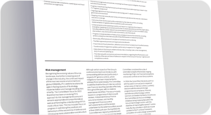 112 ITV plc Annual Report and Accounts 2023 ITV plc Annual Report and Accounts 2023 113 AUDIT AND RISK COMMITTEE REPORT CONTINUED G O VE R NAN C RISK MANAGEMENT AND INTERNAL CONTROLS ITV Speaking Crisis E Our role Committee reviewed: • Assist the Board to establish and articulate overall risk • Biannually, management’s conclusions regarding principal and emerging risks and Together Up anagement M appetite and oversee and advise the Board on specific uncertainties and associated mitigations strategic risk exposures and mitigations • Progress in implementing the enhanced ERM framework, including enhancements to the Oracle Fusion went live on 11 April 2023, The Board continued to receive regular reports Over the past year, a series of significant • Review the risk identification and mitigation processes and risk governance structure changing the operations and interaction of on issues raised during 2023 via Safecall, the external, non-ITV specific incidents and the undertake deep dives into high-risk business areas or • Progress in improving operational risk management capability for security, duty of care, and colleagues, HR, Finance and Production independent whistleblowing facility, and other evolving global landscape have underscored processes crisis management Finance processes. complaint notification channels available within the necessity for a structured and robust crisis • Review the effectiveness of the internal control and risk • Insurance arrangements and policies, including how those support mitigation of principal The Committee noted that a change of this ITV, with the Committee reviewing an overview management response capability at ITV. management processes and other financial risks nature and size was complex, and was pleased summary for the year. This included an During 2023, the revised crisis management • Oversee appropriate compliance, speaking up and fraud that it launched with minimal disruption to the assessment of any identified trends or themes framework and plan was subject to internal • Progress in implementing the financial controls framework and effectiveness review for the in complaints, the nature of any noteworthy prevention arrangements ITV Together programme business with a high volume of users and audit review by EY, as well as tested via a series transactions being processed. allegations, the corrective measures of simulated exercises facilitated by Deloitte, • Ongoing programme of improvements to technology and IT-related controls and implemented to address substantiated governance environment However, due to system and reporting issues complaints, and the process applied to triage the results of both being reported to and identified, various processes and controls did and correctly investigate complaints. The discussed by the Committee, and progress • Mapping of the internal audit plan to key principal and operational risk areas to understand in implementing the agreed resulting changes assurance coverage not operate as anticipated, with alternative Committee also considered the actions taken monitored by the Committee. • Outcome of the risk focused audits undertaken by the internal auditors, including manual controls implemented to mitigate any by management as a result of the investigations’ implementation of agreed actions to address audit conclusions risk. Consequently, Deloitte conducted a post conclusions and recommended additional The Committee acknowledged that the good implementation review in the second half of actions where appropriate, overseeing the progress in 2023 provides a solid foundation for • Enhancements to the Speaking Up policy and report on ongoing actions taken to 2023, focusing on project governance, resourcing investigation of all significant issues reported. continued improvement in 2024, including the strengthen Speaking Up processes and further increase awareness across the organisation, and change management, the outcomes of requirement to conduct regular training and including reflection of the relevant recommendations arising from the Committee’s deep which were communicated to the Committee. The Committee received regular updates on the simulated exercises across the Group in order to dive review in July 2023 and the external review by Jane Mulcahy KC status of and improvements to ITV’s awareness ensure ITV’s resilience and readiness to • Progress in implementation of data privacy and governance enhancements, including Throughout 2023 the Committee closely campaign, alongside an internal audit completed effectively respond to crisis events. actions arising from the internal audit of the effectiveness of relevant processes monitored the programme of remediation and at the end of 2022, the results of which the effectiveness of the mitigations. In addition, highlighted the need to drive continued • Biannually, effectiveness of compliance framework and monitoring the Committee Chair held a number of meetings awareness and focused training to ensure that Cyber • The M&A approvals process and approved amendments with the programme leadership to receive communications are effective. The Committee • Fraud risk and fraud prevention, detection and controls framework and its effectiveness detailed briefings on the progress of the change noted significant progress that had been made • Transformation Programme updates, particularly in respect of ITV Together management plan, providing challenge during 2023, which was demonstrated in the Security and support. strong scores for awareness of the programme • Deep dives on the Group’s resilience to key risks, including cyber, crisis management, and the routes for raising concerns in the duty of care and Speaking Up In the last few months of 2023, the ITV Together engagement survey. The Committee recognises that ITV has a • The internal audit conclusions and recommendations regarding the effectiveness and programme moved into Stabilisat