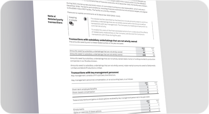 236 ITV plc Annual Report and Accounts 2023 ITV plc Annual Report and Accounts 2023 237 F I NOTES TO THE ITV PLC COMPANY FINANCIAL STATEMENTS CONTINUED NAN C I AL Note viii Keeping ITV plc is a non-trading investment holding company and derives its profits from Note x There are contingent liabilities in respect of certain litigation and guarantees, broadcasting issues, and in respect S T dividends paid by subsidiary companies. of warranties given in connection with certain disposals of businesses. None of these items is expected to have a A Equity and it simple Capital and T material effect on the Company’s results or financial position. E dividends The Directors consider the Company’s capital structure and dividend policy at other M E least twice a year ahead of announcing results and do so in the context of its commitments N The Company enters into guarantee contracts to guarantee the performance and/or financial obligations of other T ability to continue as a going concern, to execute the strategy and to invest in companies within the Group. In this respect, the Company treats these guarantee contracts as contingent liabilities S opportunities to grow the business and enhance shareholder value. until it becomes probable that the Company will be required to make a payment under the relevant guarantee. The dividend policy is influenced by a number of the principal risks as identified The Company has a £300 million bilateral loan facility which matures on 30 June 2026. Utilisation requests are on pages 57 to 64 that could have a negative impact on the performance subject to the lender’s ability to source ITV Credit Default Swaps (CDS) in the market at the time the utilisation of the Company. request is made. The facility remains free of financial covenants. At 31 December 2023, the facility was undrawn. In determining the level of dividend in any year, the Directors follow the dividend During 2023, the Group secured £100 million of committed funding via a new bilateral RCF, which matures in policy and also consider a number of other factors that influence the proposed December 2028. The terms and conditions, including financial covenants but not emissions targets, are aligned dividend and dividend policy, including: to the £500 million RCF facility. The facility is currently undrawn. • The level of retained distributable reserves in ITV plc the Company • Availability of cash resources (as disclosed in note 4.1 to the consolidated There are no capital commitments at 31 December 2023 (2022: none). financial statements) and The related parties identified by the Directors include amounts owed to and from • Future cash commitments and investment plans, to deliver the Company’s Note xi Keeping subsidiary undertakings that are not wholly owned within the Group as well as long-term strategic plan Related party it simple • Consideration of the factors underlying the Directors’ viability assessment and transactions transactions with key management. The Company is a holding company with no • The future availability of funds required to meet longer-term obligations commercial activity. including pension commitments. To enable the users of the financial statements to form a view about the effects of related party relationships on the Company, we disclose the Company’s Equity transactions with those during the year. The retained earnings reserve includes profit after tax for the year of £7 million (2022: £800 million), which includes Transactions with subsidiary undertakings that are not wholly owned dividends of £nil from subsidiaries in 2023 (2022: £980 million). The amounts owed by and to these related parties at the year end were: During the year, the Company provided for £22 million (2022: £192 million) of doubtful debts for amounts owed by its subsidiary undertakings. £2 million (2022: £11 million) was written back to the Income Statement for provisions of 2023 2022 doubtful debts no longer required. £m £m Amounts owed by subsidiary undertakings that are not wholly owned 42 55 The recoverability of the amounts owed by subsidiary undertakings is assessed on an annual basis or more Amounts owed to subsidiary undertakings that are not wholly owned (24) (4) frequently when circumstances indicate that the carrying value may be impaired. Determining whether there is an indication of impairment requires judgement as the assessment is based on either net assets of the undertaking or Amounts owed by subsidiary undertakings that are not wholly owned relate mainly to funding provided to production forecast future performance. companies in our Studios division. The share premium of £174 million remains unchanged in the year. Other reserves of £34 million (2022: £29 million) Amounts owed to subsidiary undertakings that are not wholly owned, relate mainly to amounts owed to 3sixtymedia comprises Merger reserves of £36 million (2022: £36 million) which relate to share buybacks in prior years and Translation Limited and World Productions Limited. reserves with net losses of £2 million (net losses of £7 million) which relate to cash flow hedges and cost of hedging. Transactions with key management personnel Dividends Key management consists of ITV plc Executive Directors. The Board recognises the importance of the ordinary dividend to ITV shareholders. Reflecting its confidence in the Key management personnel compensation, on an accounting basis, is as follows: business and its strategy, as well as the continued strong cash generation, the Board proposes a final dividend of 3.3p (2022:3.3p), giving a full year dividend of 5.0p (2022: 5.0p) per share. In 2023, £201 million of dividends were paid 2023 2022 (2022: £201 million), representing a final 2022 dividend of 3.3p per share and an interim 2023 dividend of 1.7p per share. £m £m A contingent liability is a liability that is not sufficiently certain to qualify for Short-term employee benefits 3 3 Note ix Keeping Sha