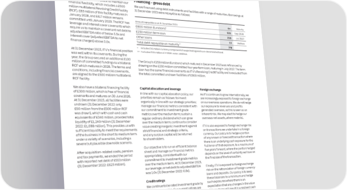 50 ITV plc Annual Report and Accounts 2023 ITV plc Annual Report and Accounts 2023 51 S FINANCE REVIEW CONTINUED T R A T E G I Funding and liquidity Reported net debt Production inventories, contract therefore the £16 million payment may • Total pension deficit funding contributions C R resume in 2024. The Group retains day-to- for 2024 are expected to come down year E Debt structure and liquidity 2023 2022 assets and liabilities P At 31 December £m £m day operational control of SDN and SDN’s on year. More detailed guidance will be O In 2023, contract assets increased by R The Group’s financing policy is to manage its Gross cash 340 348 £17 million, production inventories revenues, profits and cashflows continue to given following the completion on the T liquidity and funding risk for the medium to be consolidated in the Group’s accounts. On triennial valuation long term. ITV uses debt instruments with a Gross debt (including IFRS 16 lease liabilities) (893) (971) decreased by £259 million and contract completion of the final payment in 2031, the range of maturities, has access to liabilities decreased by £185 million • The Board has proposed a final dividend Net debt (553) (623) Scheme’s partnership interest will have been of 3.3p, which will be paid in May 2024. appropriate short‑term borrowing facilities compared to 31 December 2022. Contract repaid in full and it will have no right to any and has a policy to maintain a minimum of assets increased due to UK scripted growth This gives a full year dividend of 5.0p. further payments. Going forward, the Board intends to pay £250 million of cash and undrawn committed with streaming platforms. The production facilities available at all times. We have three inventories decrease was driven a full year ordinary dividend of at least committed facilities in place to maintain our Financing – gross debt predominantly by key US and UK deliveries. Post balance sheet event 5.0p, which it expects to grow over the W medium term financial flexibility, which includes a £500 e are financed using debt instruments and facilities with a range of maturities. Borrowings at Contract liabilities decreased due to the On 01 March 2024 the Group announced million multilateral Revolving Credit Facility 31 December 2023 were repayable as follows: phasing of production deliveries, particularly the sale of its entire 50% interest in BritBox (RCF). £83 million of this facility matures in in the US and the UK. International to its joint venture partner CMA Investigation January 2028, and £417 million remains BBC Studios for a cash consideration of As previously reported, on 12 July 2022, committed until January 2029. The RCF has Amount repayable as at 31 December 2023 £m Maturity Pensions £255 million. The Board intends to return the the UK Competition and Markets Authority leverage and interest cover covenants which €600 million Eurobond* 535 Sep 2026 entire net proceeds to shareholders through (CMA) opened an investigation into certain require us to maintain a covenant net debt to The net pension surplus for the defined a £235 million share buyback which will be £230 million term loan 230 Jul 2027 benefit schemes at 31 December 2023 on an conduct of ITV and other named companies adjusted EBITDA ratio of below 3.5x and completed within 18 months. Refer to notes in the sector relating to the production and Other loans 13 Various accounting basis was £209 million (31 3.4 and 5.3 to the financial statements for interest cover (adjusted EBITDA to net broadcasting of sports content in the United finance charges) above 3.0x. Total debt repayable on maturity** 778 December 2022: £192 million). The further details. movement in the year was driven by Kingdom. The investigation is at an early * Includes £15 million currency component of swaps held against euro‑denominated bond. employer contributions and a reduction in stage and the CMA has confirmed it is At 31 December 2023, ITV’s financial position ** Excludes £115 million of IFRS16 Lease Liabilities. liabilities due to changes in demographic Planning assumptions for the currently undertaking further investigation was well within its covenants. During the assumptions partly offset by a fall in full year 2024 until at least March 2024, subsequent to year, the Group secured an additional £100 The Group’s €259 million Eurobond which matured in December 2023 was refinanced by corporate bond yields. The following planning assumptions for 2024 which ITV anticipates it will receive additional million of committed funding via a bilateral drawing on the £230 million committed four year term loan, maturing in July 2027. The term are based on our current best view but may detail regarding any future steps. RCF which matures in 2028. The terms and loan has the same financial covenants as ITV’s Revolving Credit Facility and is excluded from The net pension assets include £48 million of change depending on how events unfold over conditions, including financial covenants, the total committed undrawn facilities of £900 million. gilts, which are held by the Group as security the rest of the year. On 11 October 2023, the CMA opened an are aligned to the £500 million multilateral for future unfunded pension payments to investigation into certain conduct of ITV RCF facility. four former Granada executives, the Profit and Loss impact: and other named companies in the sector liabilities of which are included in our pension relating to the production and broadcasting We also have a bilateral financing facility Capital allocation and leverage Foreign exchange • Total content costs are expected to of television content in the UK, excluding of £300 million, which is free of financial obligations. A full reconciliation is included be around £1,275 million as we further In line with our capital allocation policy, our As ITV continues to grow internationally, we within note 3.7 to the financial statem